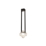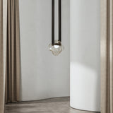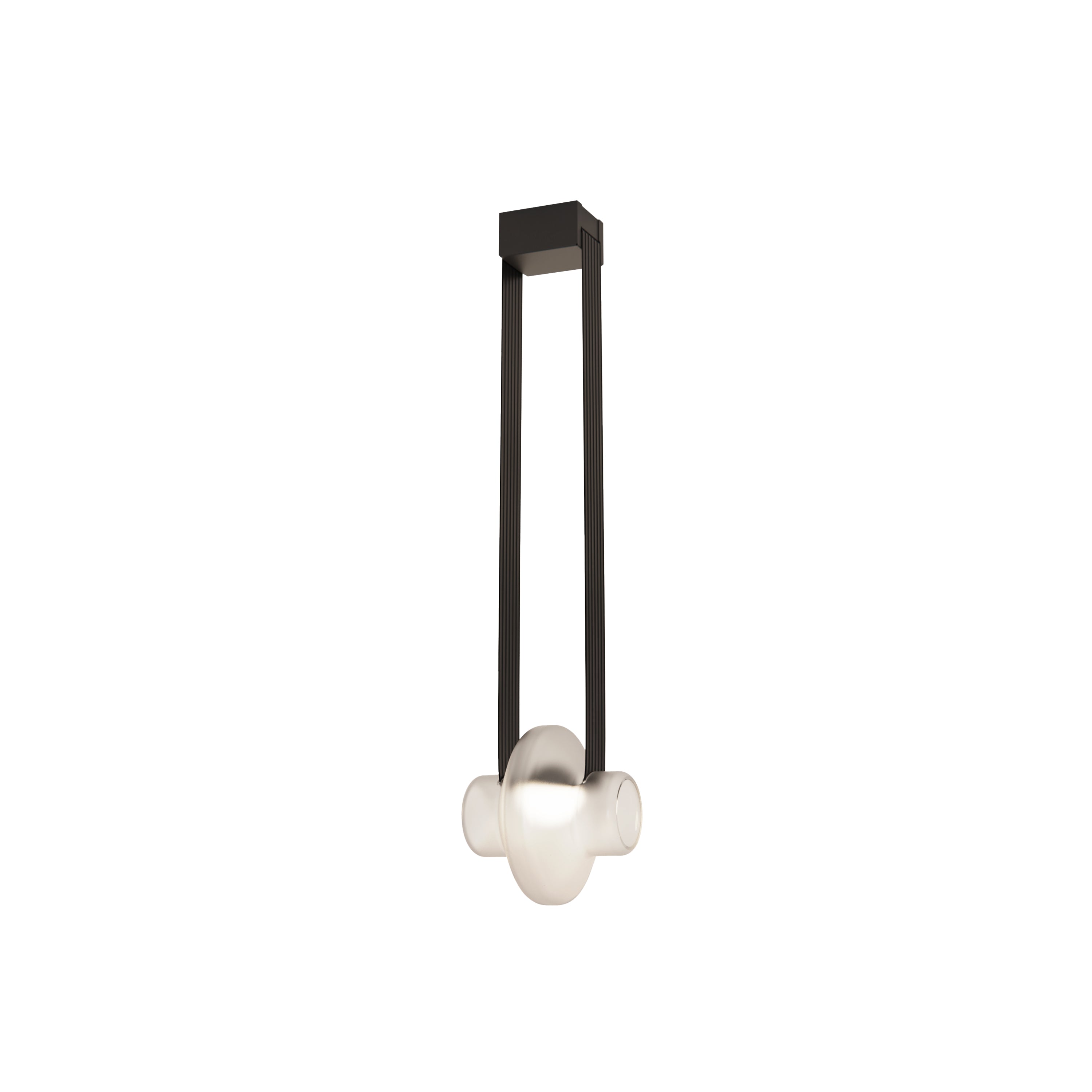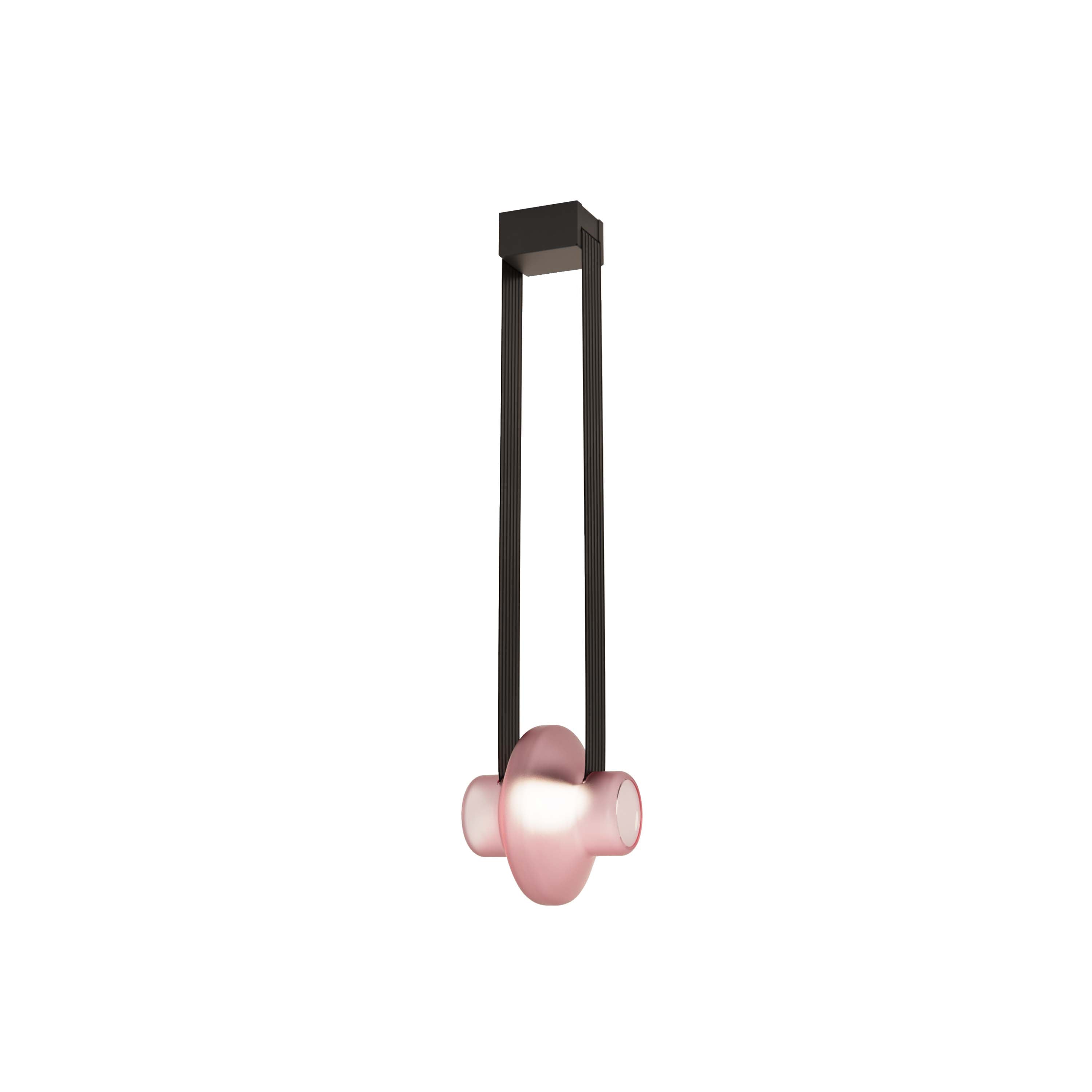 A contemporary lighting system inspired by scenic mountain landscapes and their reflections. It features a wide, flexible, conductive cable that supports and powers the light modules, allowing for versatile configurations. The cable is finished in matte black and designed for creating various geometric and tension-based setups. The lamp includes hand-blown glass globes available in transparent, pink, gray, and amber, with options for clear or frosted finishes. The anodized aluminum and frosted glass light module can direct light either downward or upward.