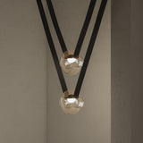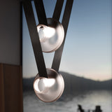 A contemporary lighting system inspired by scenic mountain landscapes and their reflections. It features a wide, flexible, conductive cable that supports and powers the light modules, allowing for versatile configurations. The cable is finished in matte black and designed for creating various geometric and tension-based setups. The lamp includes hand-blown glass globes available in transparent, pink, gray, and amber, with options for clear or frosted finishes. The anodized aluminum and frosted glass light module can direct light either downward or upward.