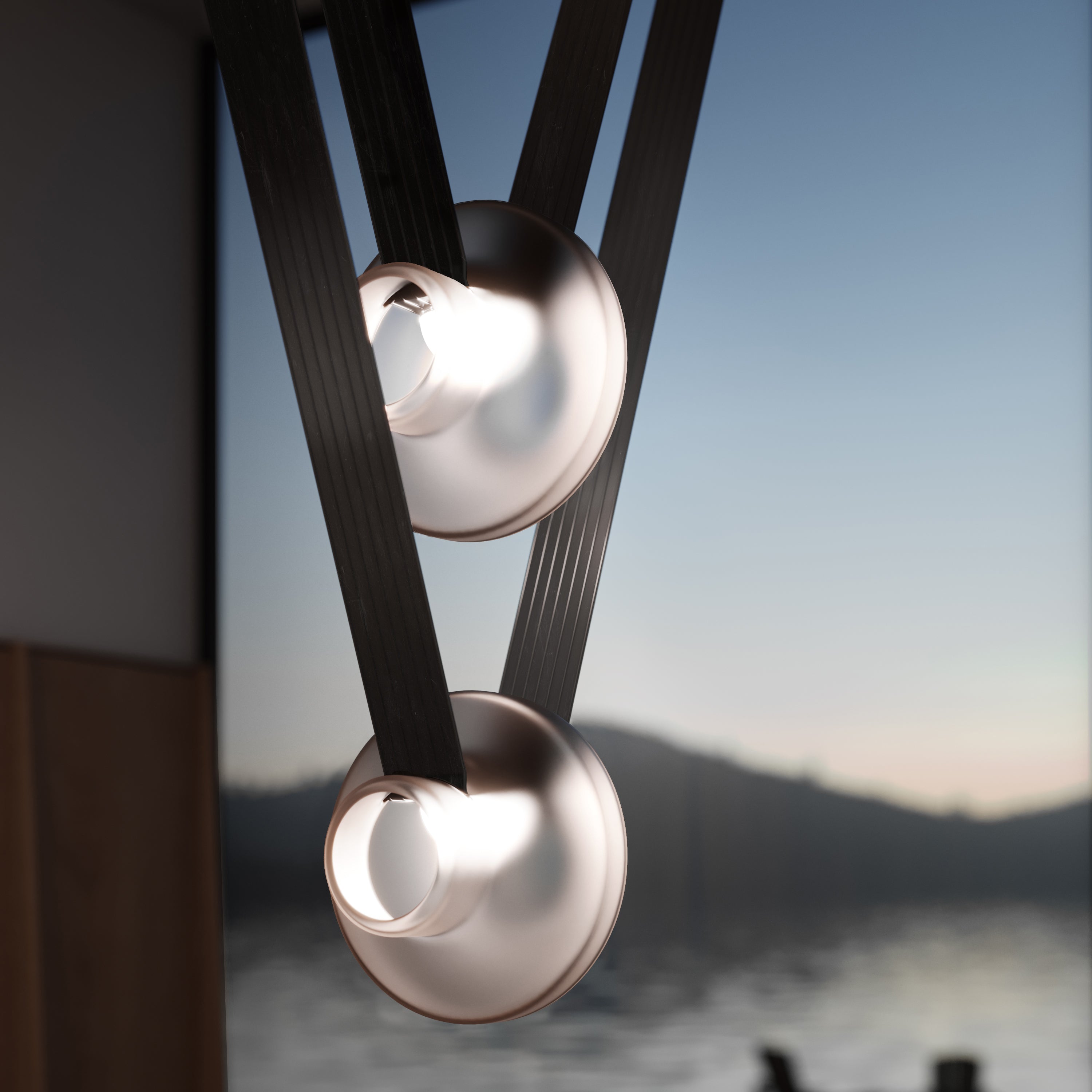 A contemporary lighting system inspired by scenic mountain landscapes and their reflections. It features a wide, flexible, conductive cable that supports and powers the light modules, allowing for versatile configurations. The cable is finished in matte black and designed for creating various geometric and tension-based setups. The lamp includes hand-blown glass globes available in transparent, pink, gray, and amber, with options for clear or frosted finishes. The anodized aluminum and frosted glass light module can direct light either downward or upward.