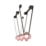 A contemporary lighting system inspired by scenic mountain landscapes and their reflections. It features a wide, flexible, conductive cable that supports and powers the light modules, allowing for versatile configurations. The cable is finished in matte black and designed for creating various geometric and tension-based setups. The lamp includes hand-blown glass globes available in transparent, pink, gray, and amber, with options for clear or frosted finishes. The anodized aluminum and frosted glass light module can direct light either downward or upward.