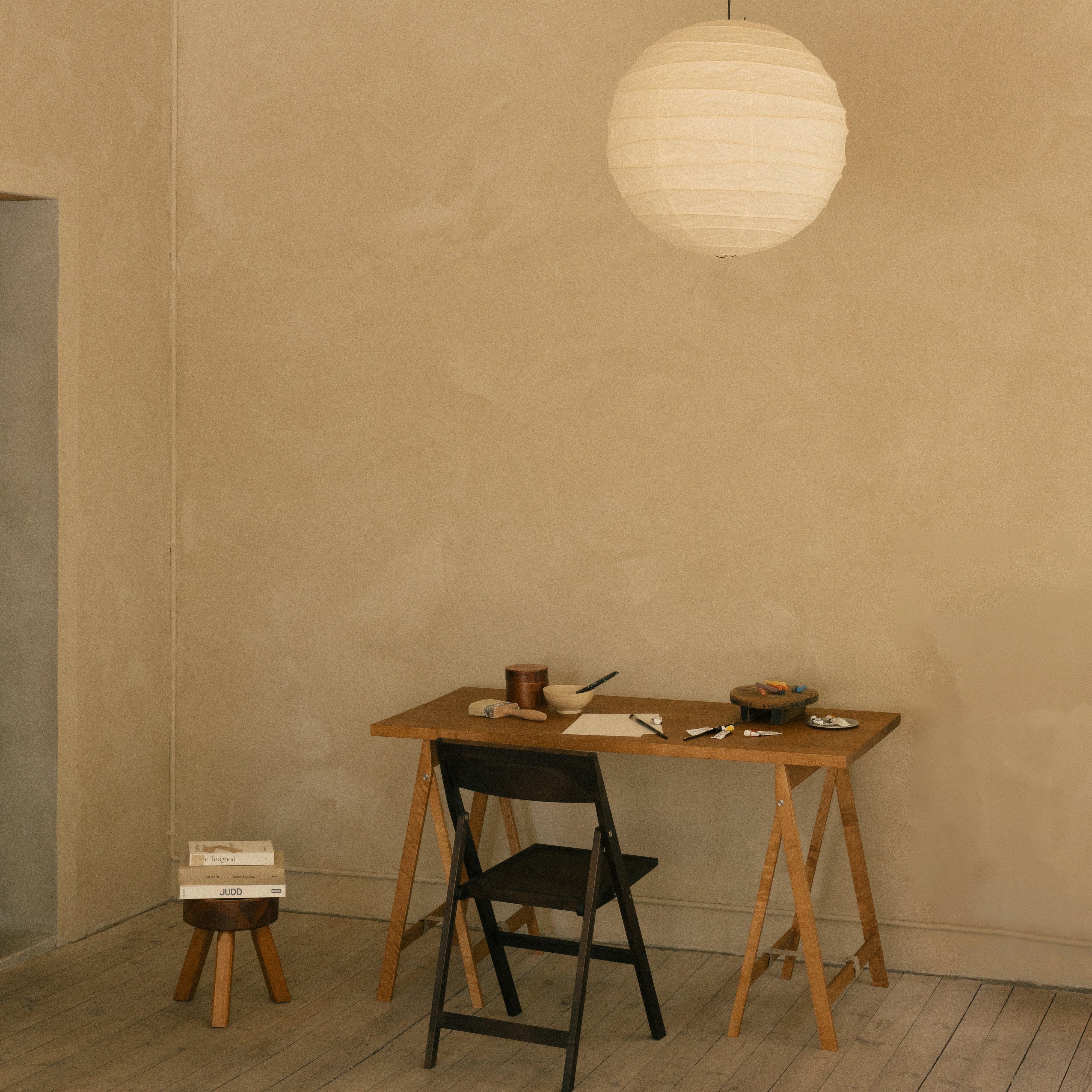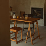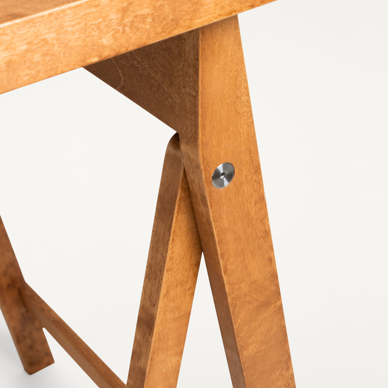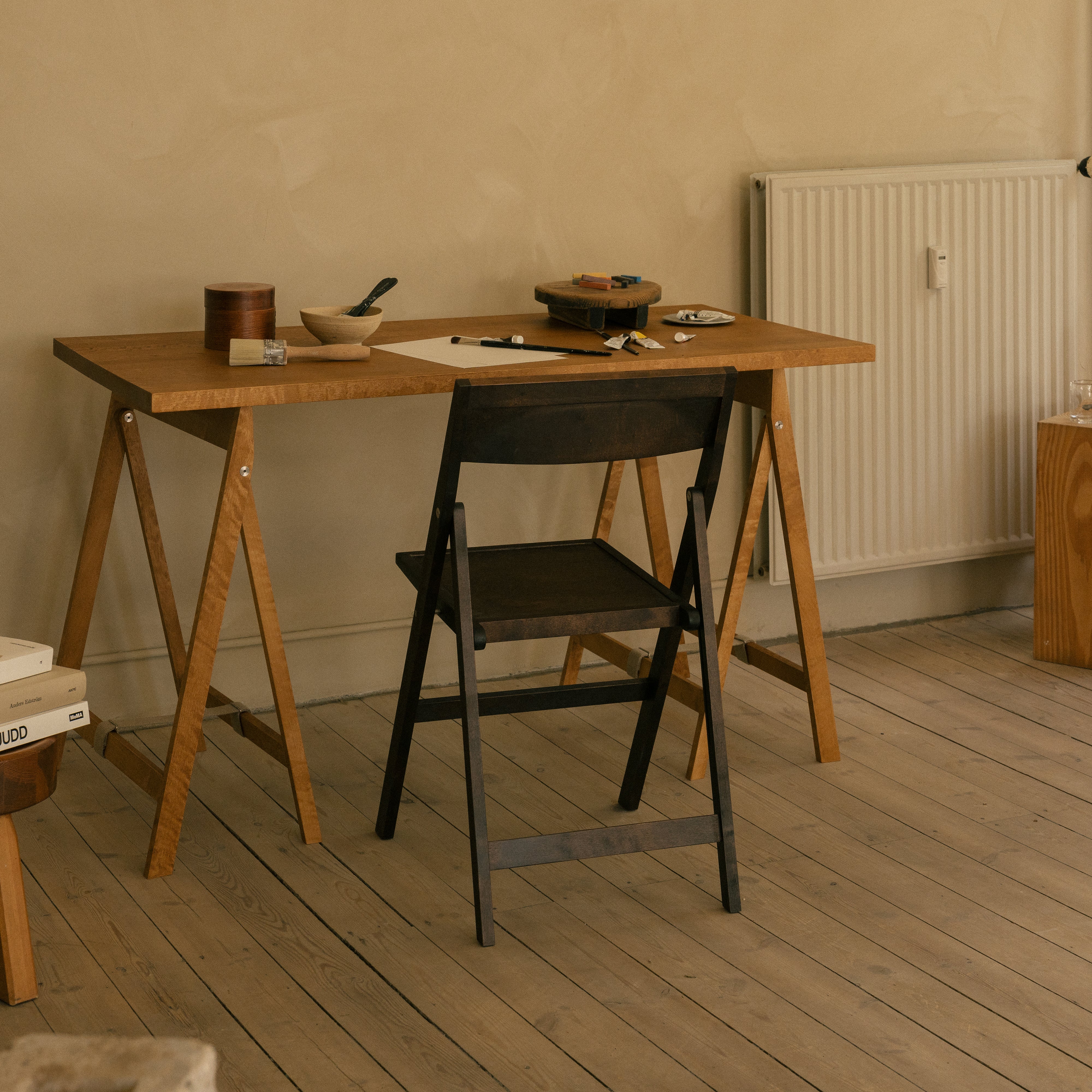 This folding trestle table provides a practical surface for various spaces. It consists of two separate components: folding trestles and a tabletop, making it easy to move and store. The trestles can be paired with different tabletops and are stabilized by non-slip gel pads and recycled cotton webbing. Made from brown birch wood, the table is both durable and lightweight.
