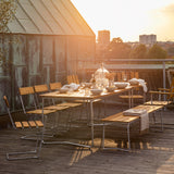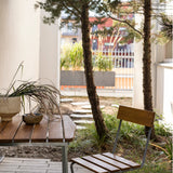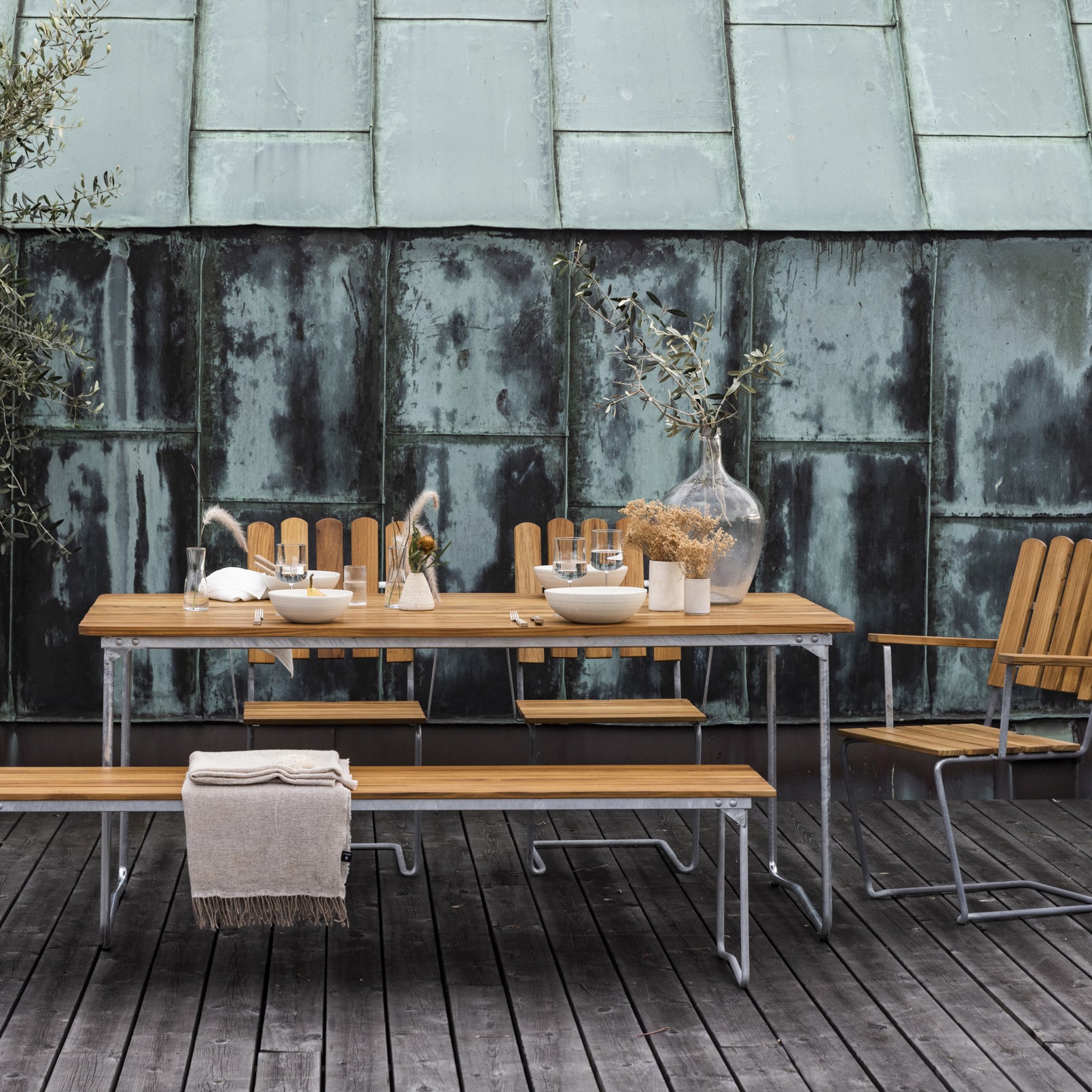 Table B31 by Grythyttan Stålmöbler, designed by Artur Lindqvist in the 1950s, is a robust outdoor table featuring a steel base and a rectangular teak wood top. Ideal for seating 6-8 people, the table has a foldable base for easy storage and transport. Over time, the galvanized steel develops a matte finish, and the teak wood acquires a silver-gray patina. This table combines durability and practical design, embodying the craftsmanship of Grythyttan Stålmöbler.