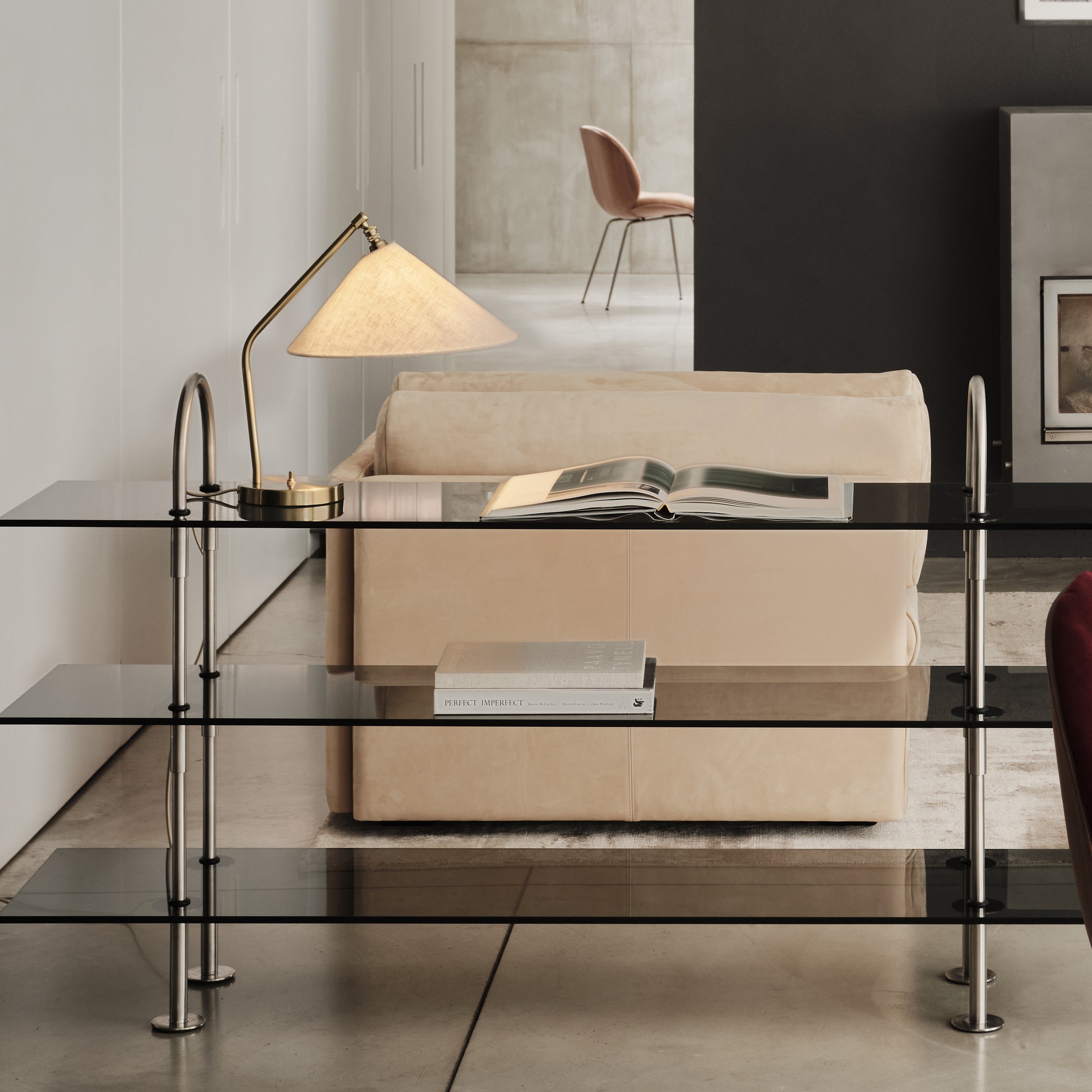This updated edition of Greta M. Grossman’s 1947 Gräshoppa Table Lamp features a natural canvas shade inspired by early prototypes, paired with a brass stem and rounded base. The fabric shade softens the light for both focused and ambient illumination, giving the classic design a warm, contemporary expression.