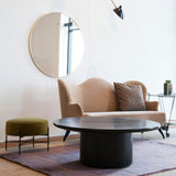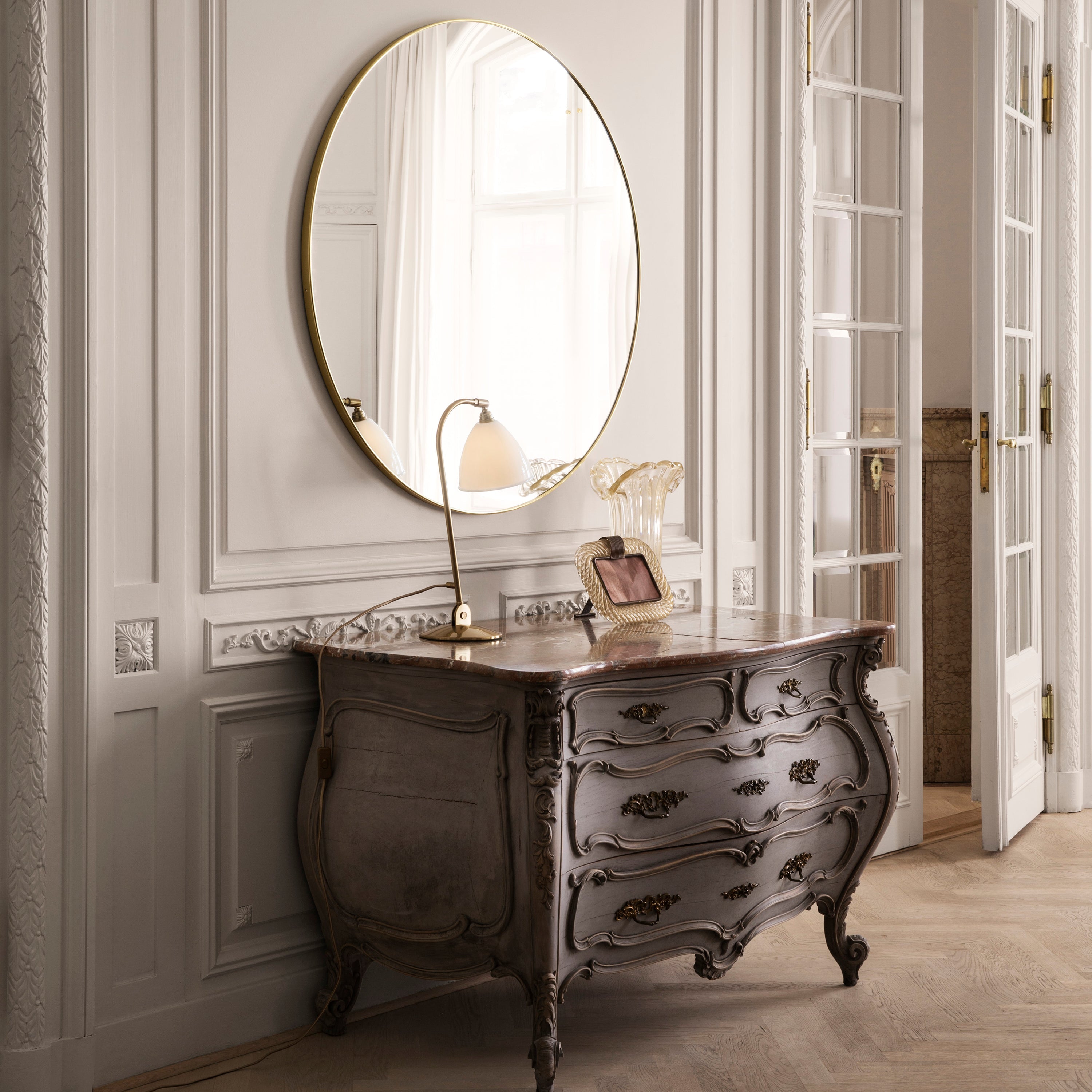 Emphatically over scaled, Gubi's rendition of the elemental round mirror brings a captivating depth and dimension to any room. On a warming note, the classic rounded shape is framed with a tracing of solid brass to modulate its presence and enhance the gleaming reflection.