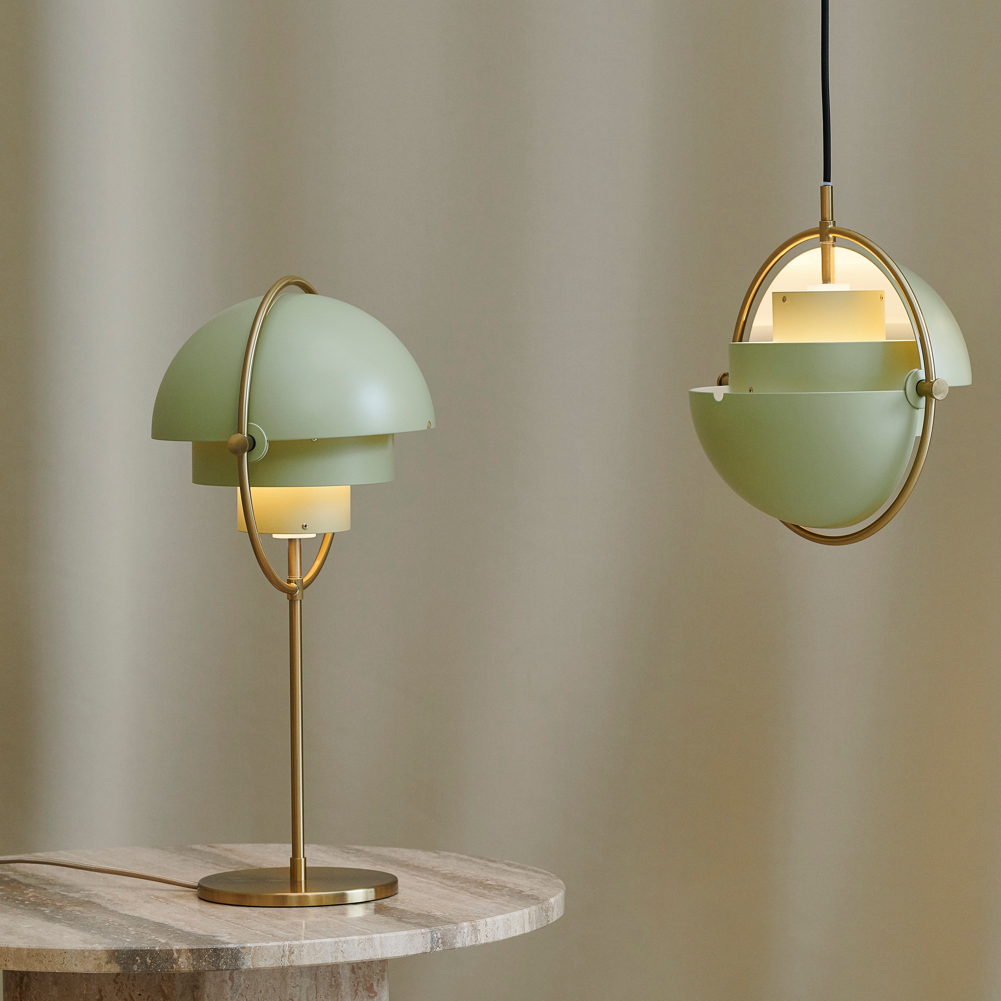 Could it be that Louis Weisdorf’s stint as an architect at the whimsical Tivoli Gardens that inspired his unique Multi-Lite? This Danish designer’s circa-1972 light allows illumination to be directed upwards, downwards or both, with just a touch to the individually rotating shades. The movable metal shades are cleverly mounted on a brass or chrome ring. This timeless composition also shields the eye at all angles from direct bulb glare.