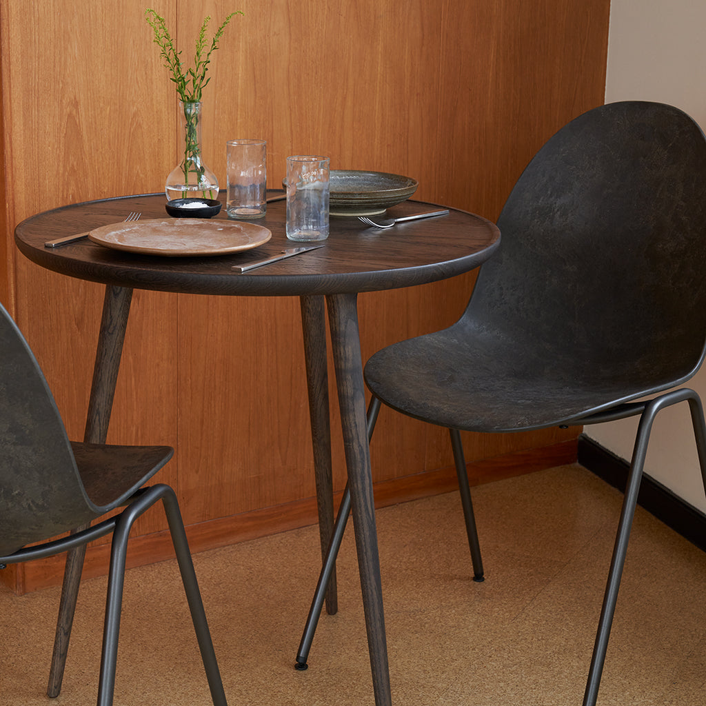 Danish architect duo Space Copenhagen lends an understated charm to this 3-legged wood cafe table. From the Accent series for Mater, it’s beautifully realized in solid FSC certified oak with a choice of lacquer stains. A rounded tabletop with its curved edge and the gently tapering legs underlie the handcrafted aesthetic.
