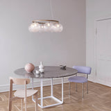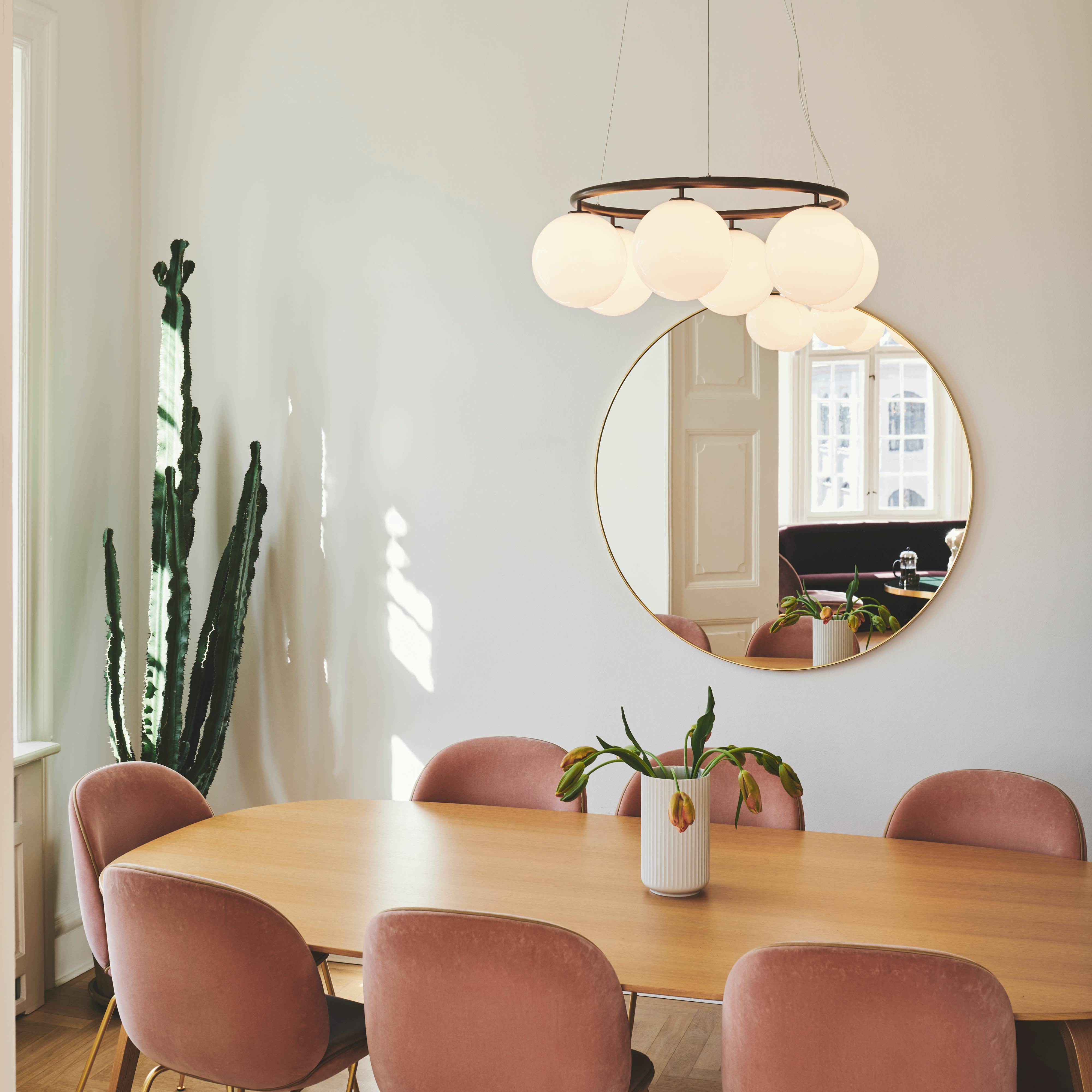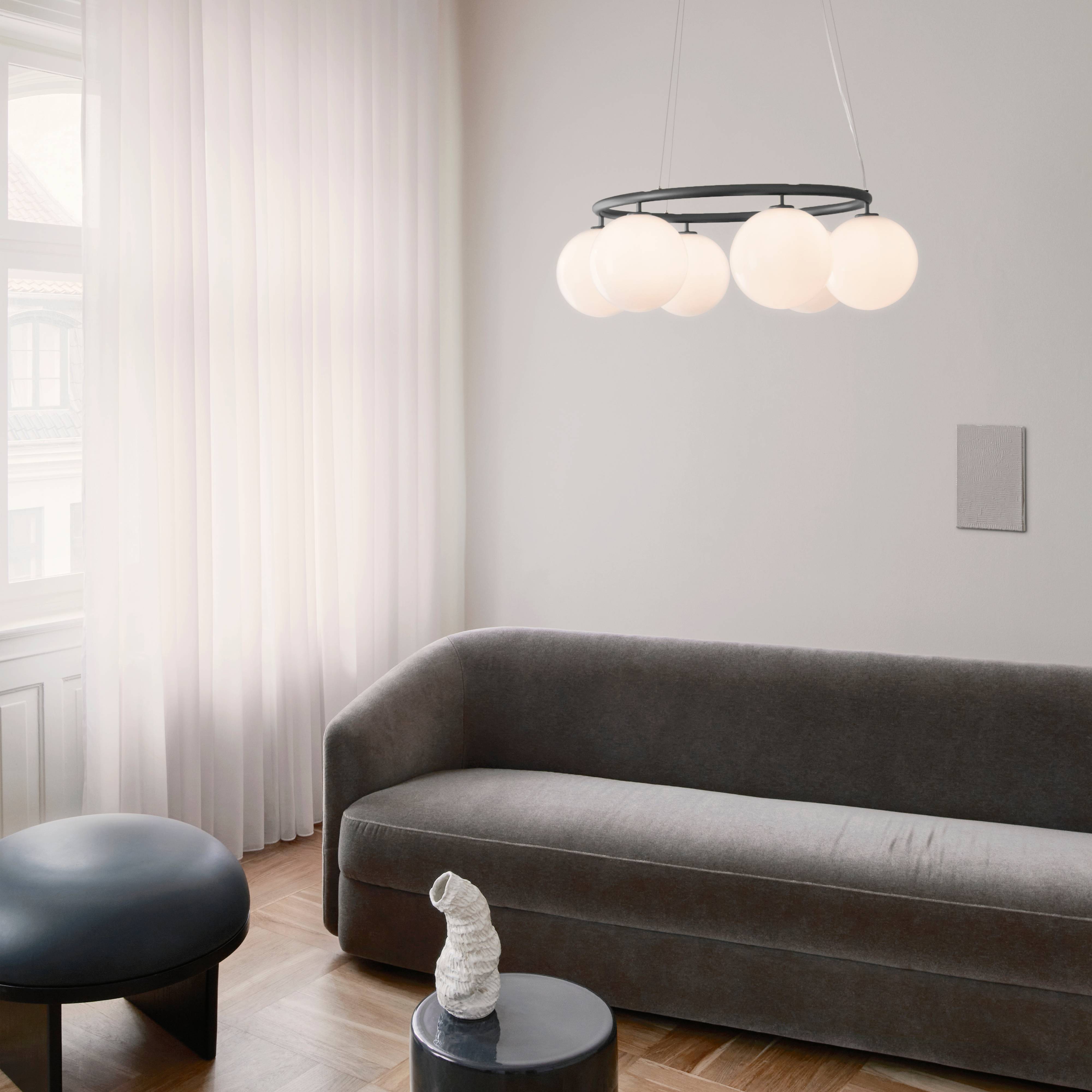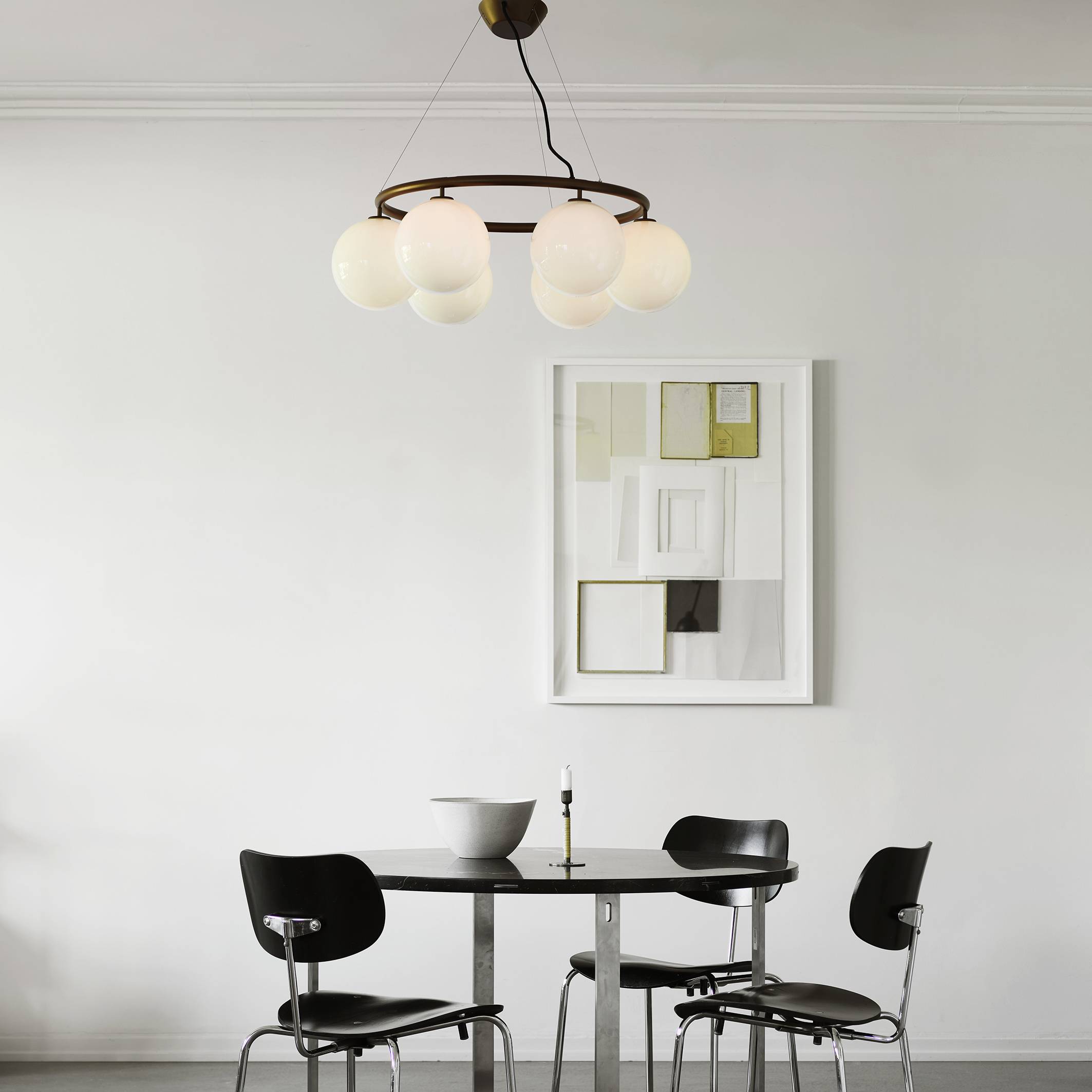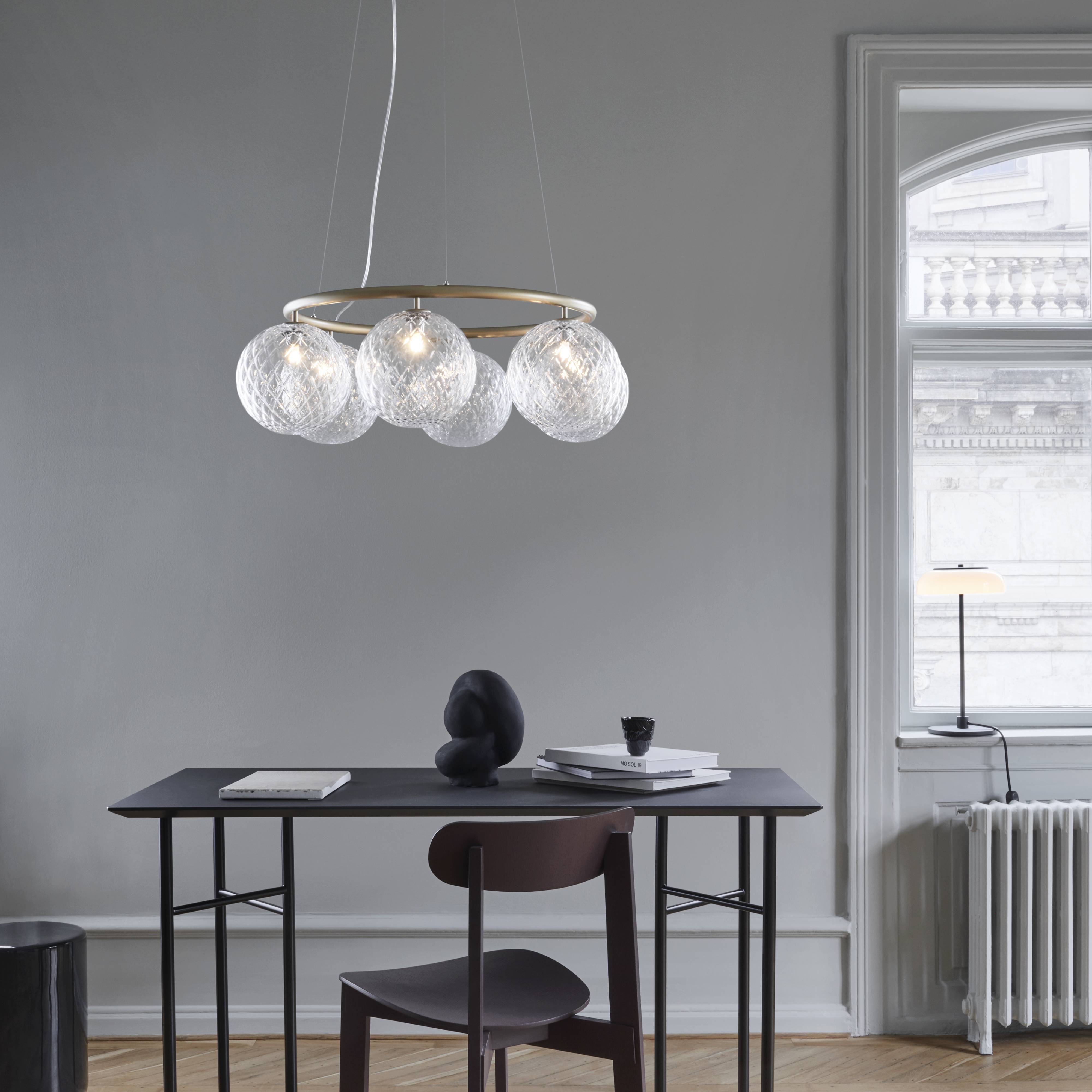 In a dazzling circular configuration, Nuura's creative director Sofie Refer arrays 6 of the mouth-blown Miira globes on a powder-coated metal ring colored a dark bronze. The chandelier can hang high or low from the ceiling, via a special wire system that easily adjusts the suspended height from 45 to 250 centimeters. With the globes alit in either milky opal or or clear optic glass with an embossed pattern, the fixture spreads a sumptuous illumination that makes it a glowing focal point in a variety of settings.