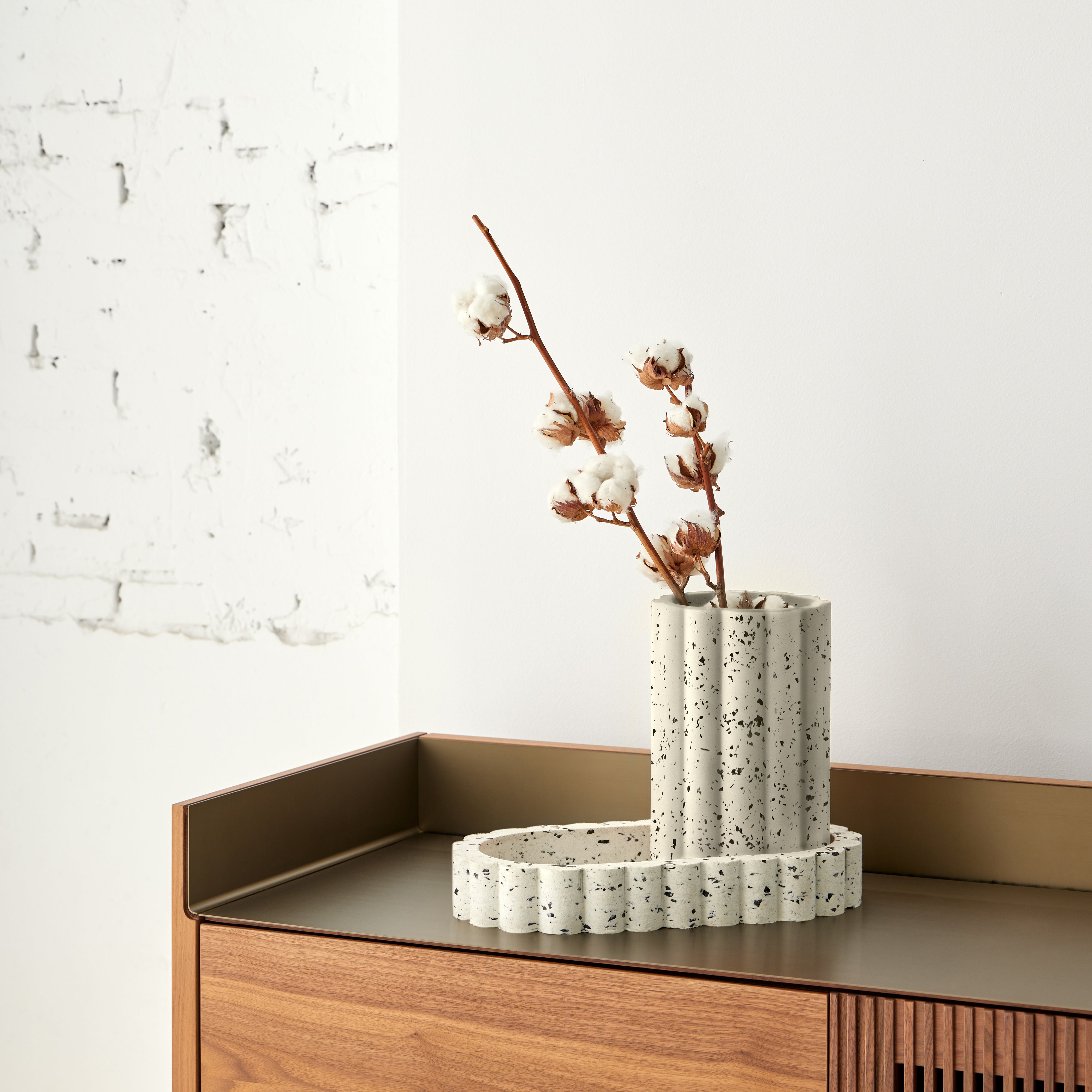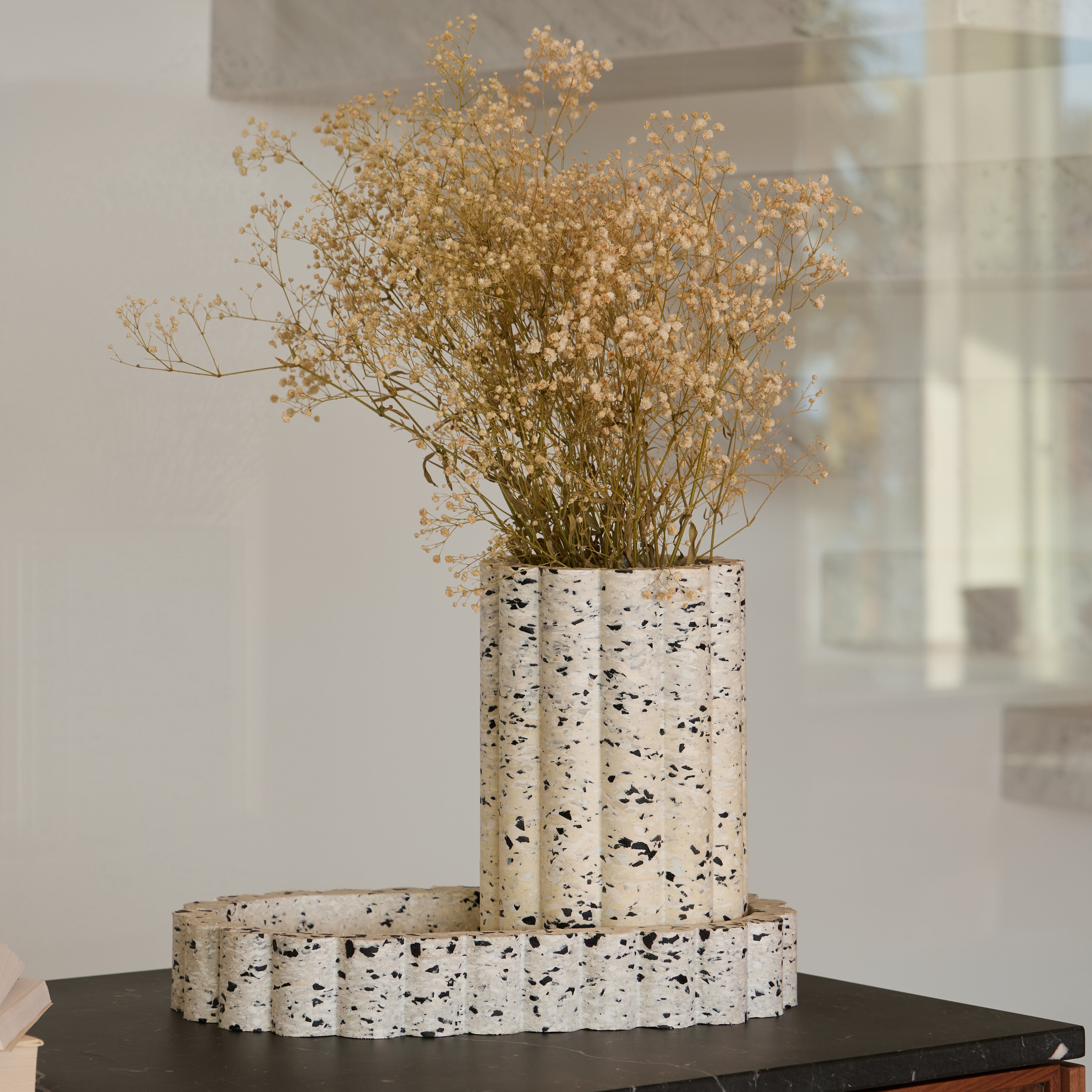 Made entirely from recycled materials sourced from textile and automotive industries, this vase transforms waste into functional art. Its modern design and white or black finish make it a suitable addition to various interior settings. The Nuvol Vase is part of a collection that highlights Punt's commitment to environmental responsibility and circular design principles.