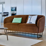 Inspired by traditional Spanish wine barrels, this two-seater sofa features vertical quilting on the exterior, resembling barrel staves, while the interior remains smooth for comfort. The seat, back, and arms are made from molded polyurethane foam for durability and support. A sturdy metal base, available in 3 lacquer finishes, provides stability.