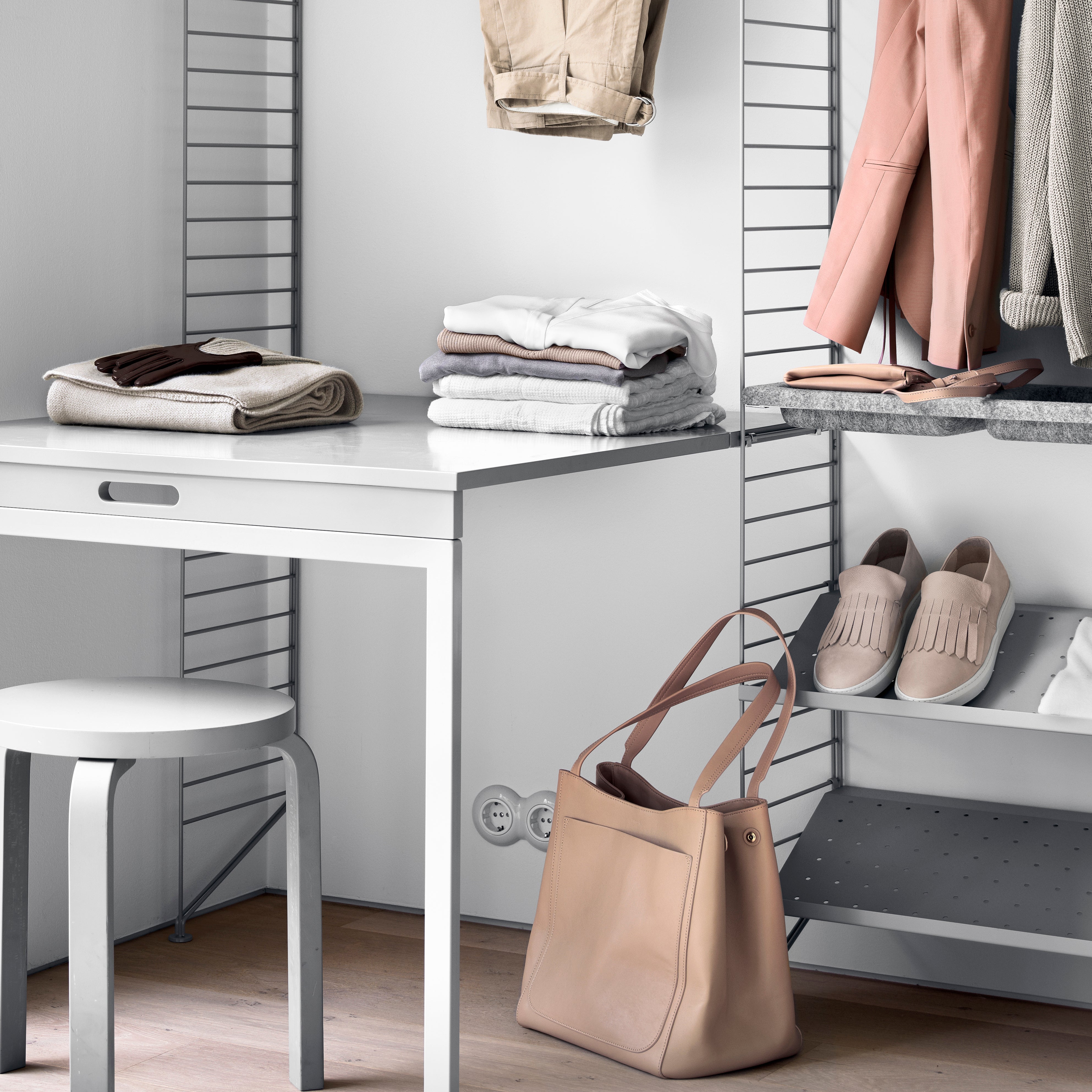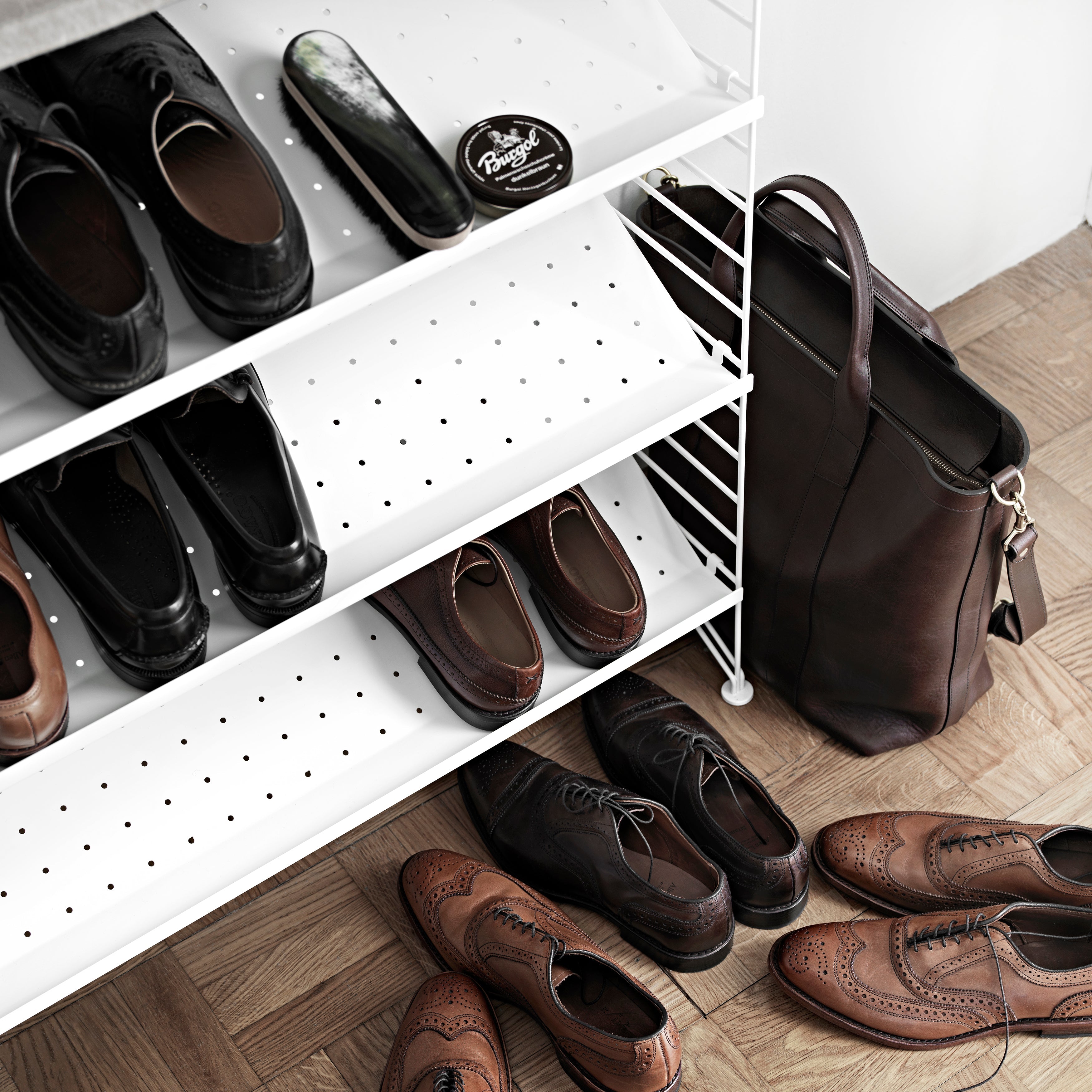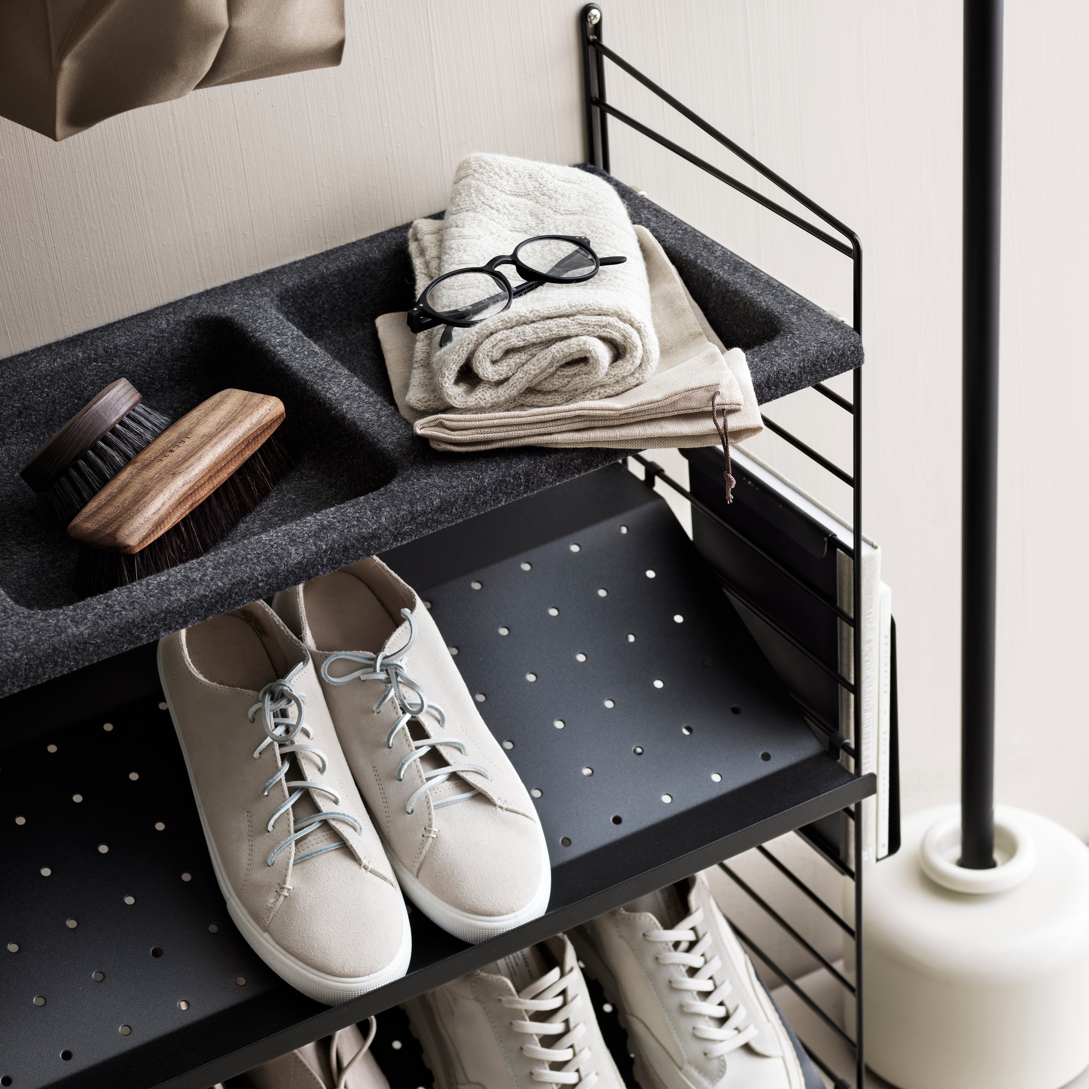 Even in the smallest of entryways and narrow halls, this wall-mounted unit provides welcome organization. String tops 2-level shoe storage with a compartmentalized bowl shelf for stowing essentials like keys, billfolds, mail and even odd objects like pet toys. Easily expandable as needs change, String's timeless modular system was first introduced in 1949 by Nils and Kajsa Strinning.
