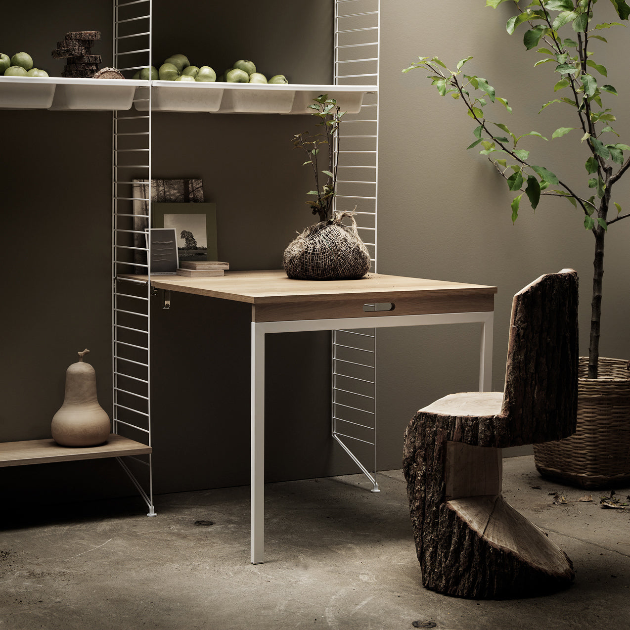 For a spur-of-the-moment work session or impromptu dining, String offers a handy folding table to integrate with a chosen shelving installation. In either lacquered solid finish or wood-grain veneer, the unit is a snap to unfold and adds to the flexibility of any living space. Sweden's design icons Nisse and Kajsa Strinning originally introduced String in 1949 and its myriad possibilities make it just as relevant today.