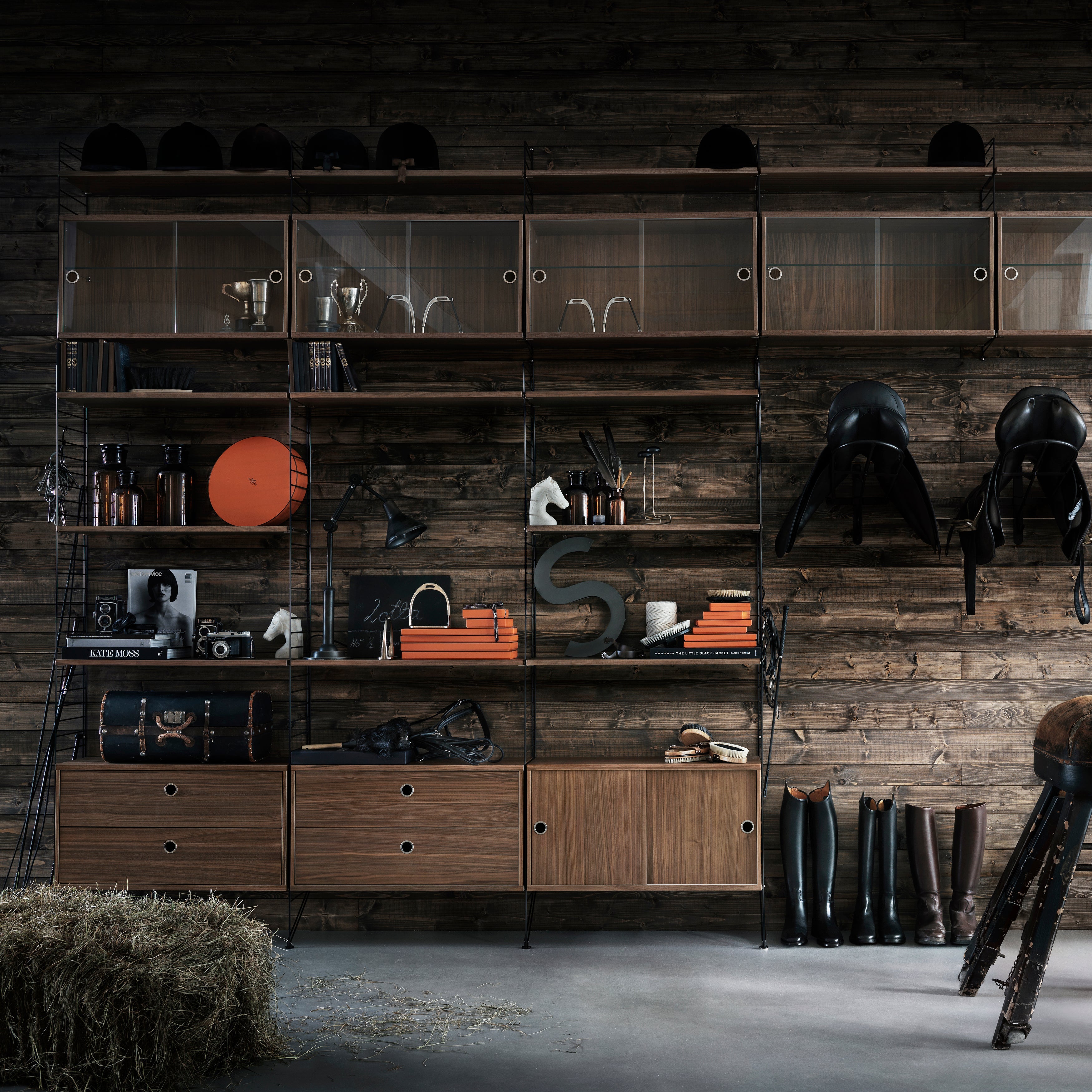 For displaying fragile objets or keeping tomes dust-free, String presents a display cabinet with clear sliding doors. Easily integrated into the shelving system in just a few simple steps, it comes in both woodgrain veneer and lacquered solid-finish variations. Both the cabinet’s doors and single inside shelf are made of sturdy tempered glass.
