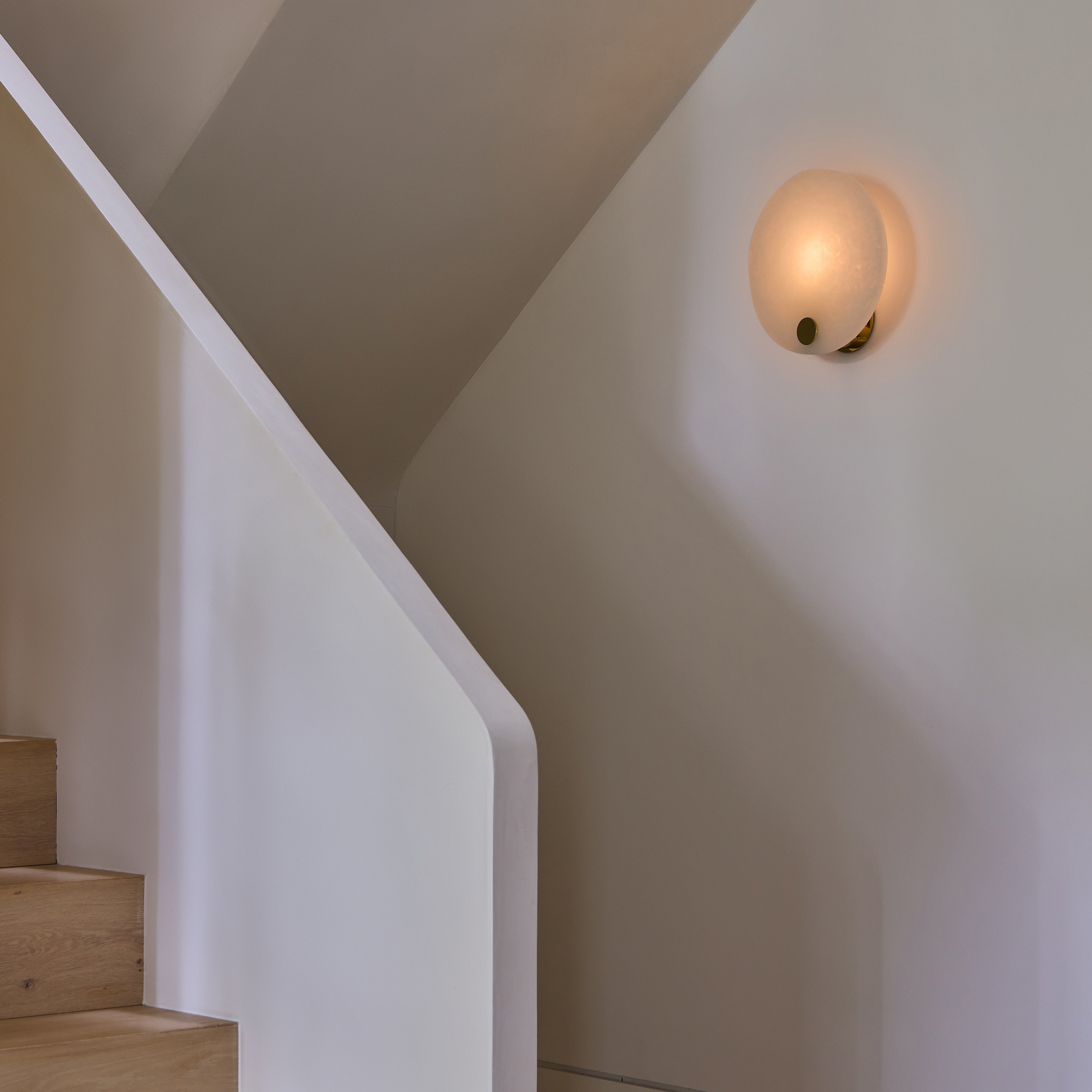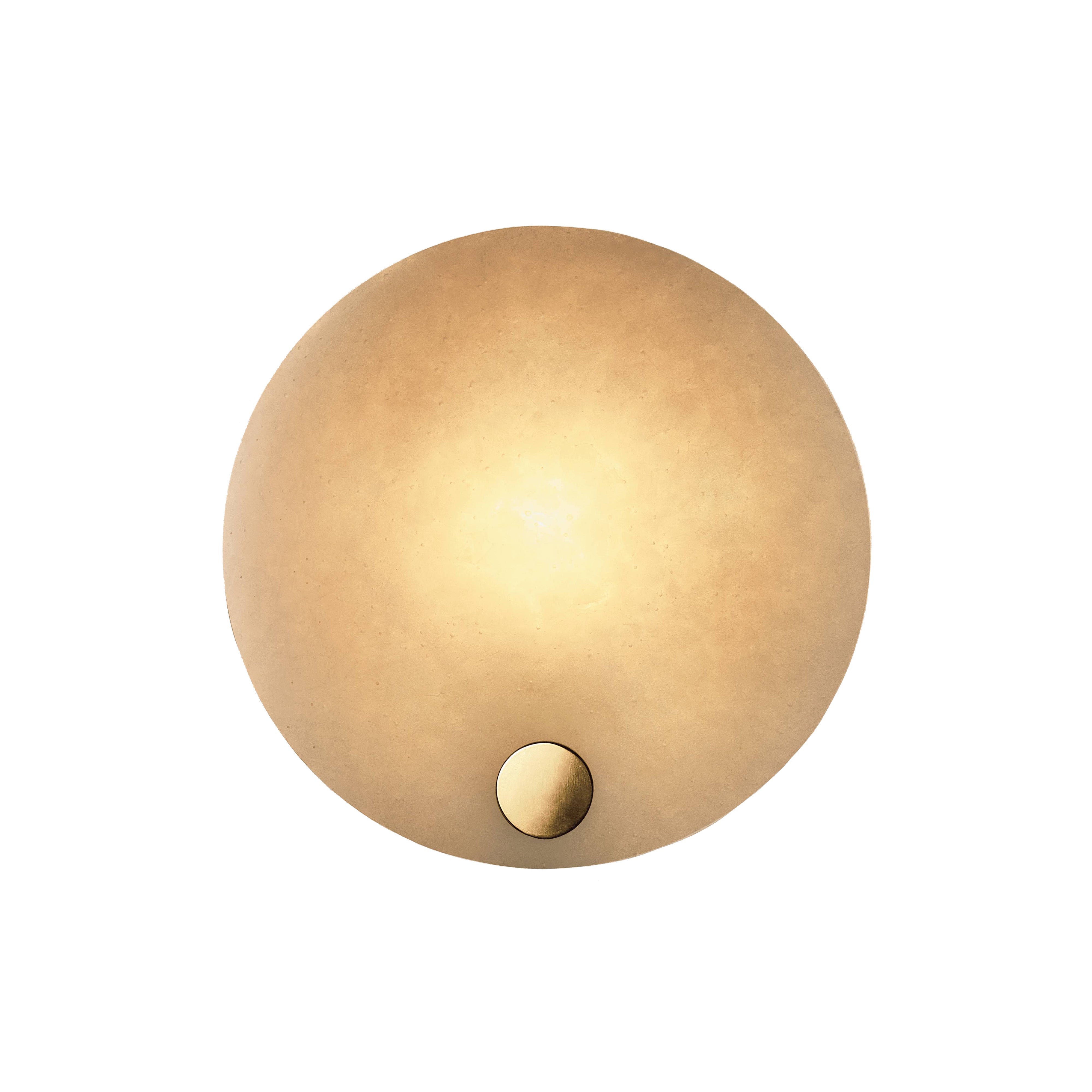 The Magma Wall Light by Tala features a decorative glass disc diffuser made from upcycled solar panels, providing a gentle diffusion of light. Its solid brass frame adds a refined touch to the design. The fixture includes a matte white G22 bulb and projects from the wall, making it suitable for various interior settings.