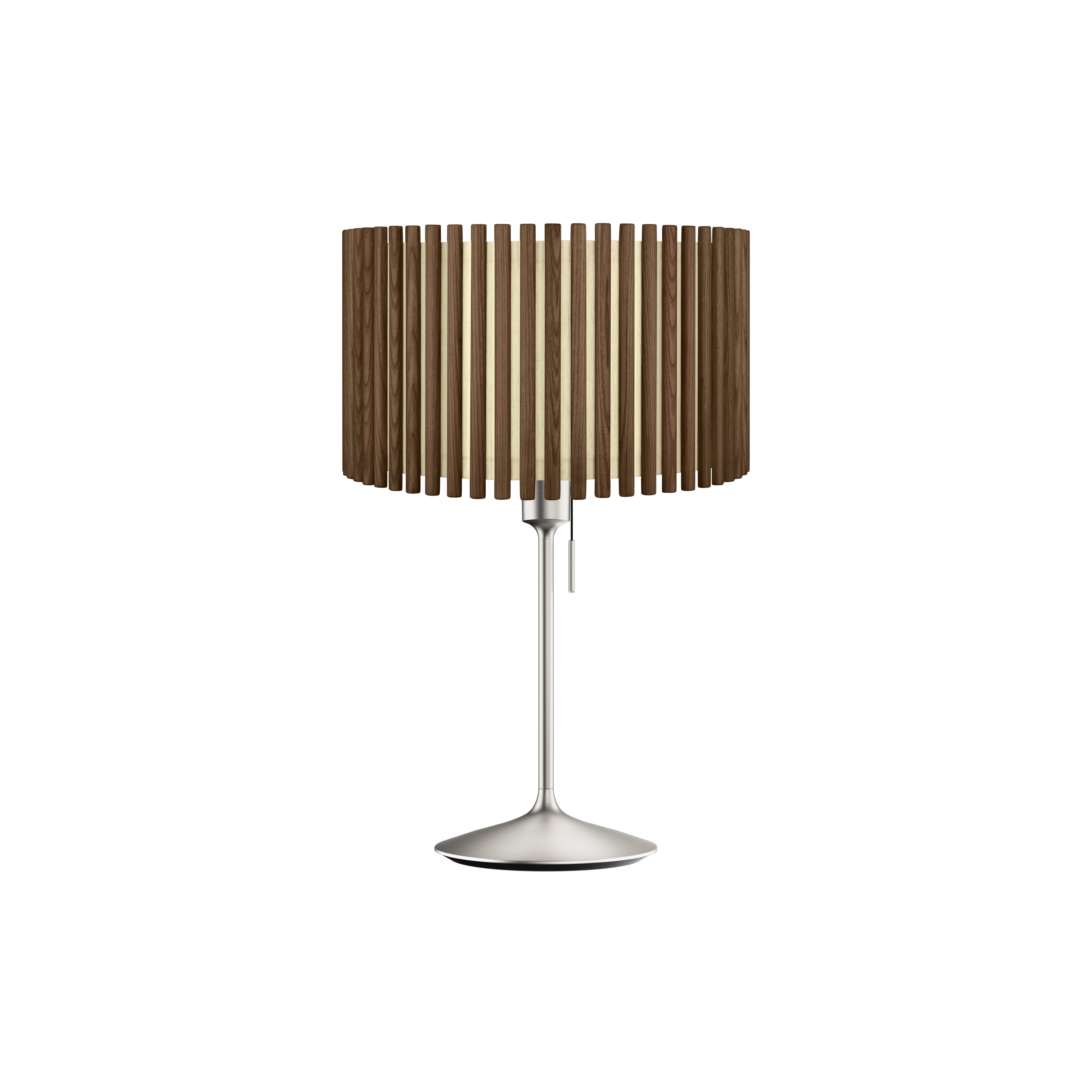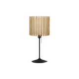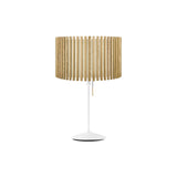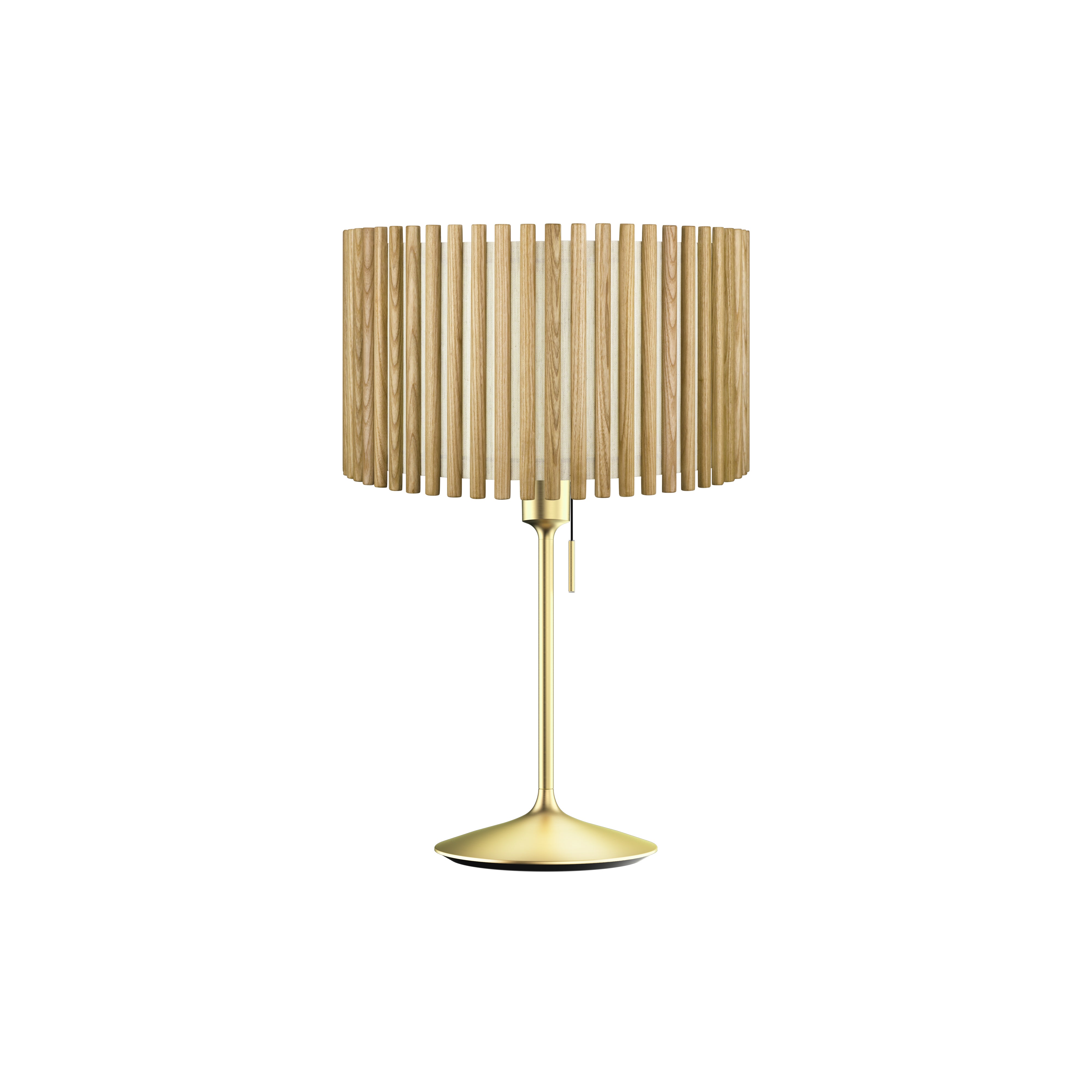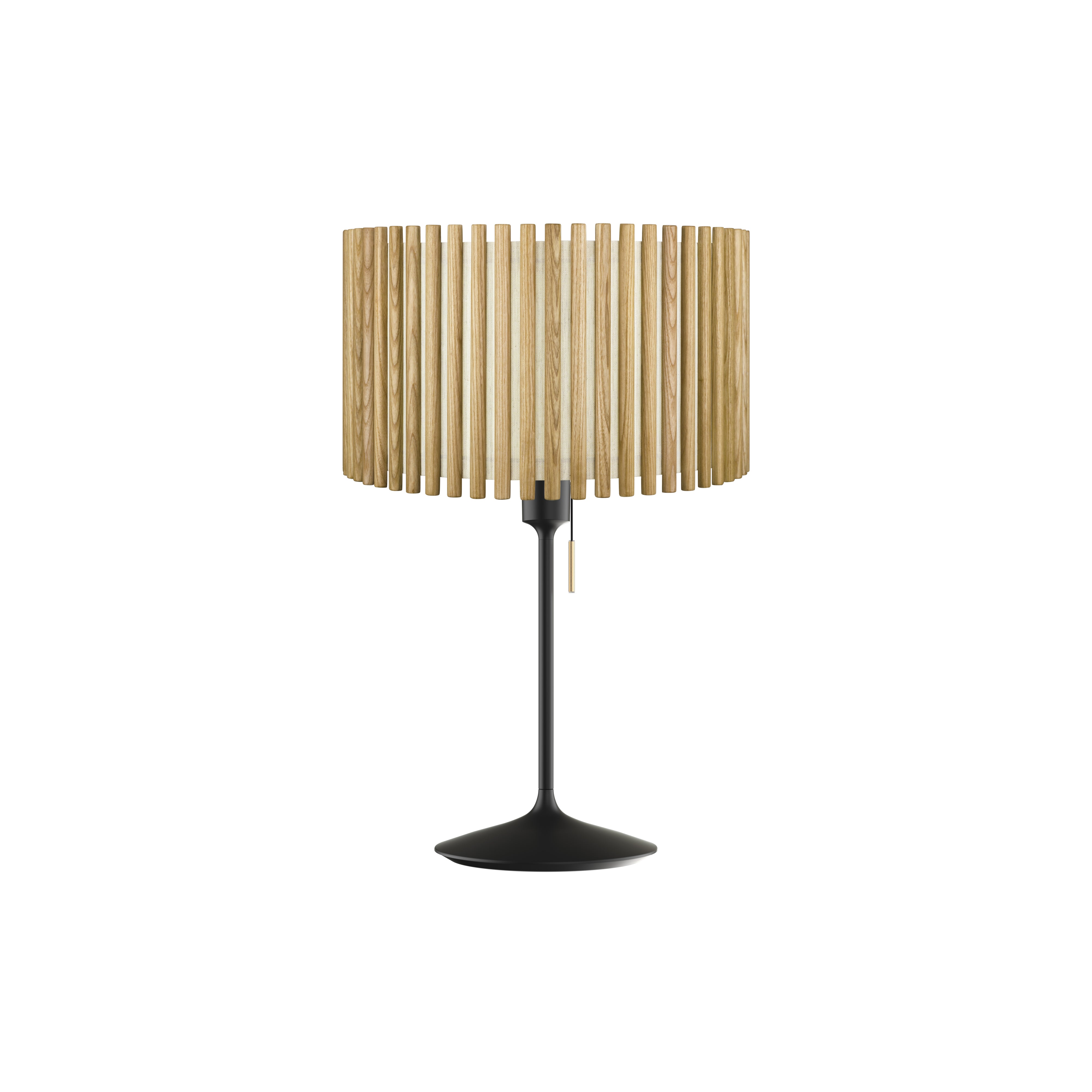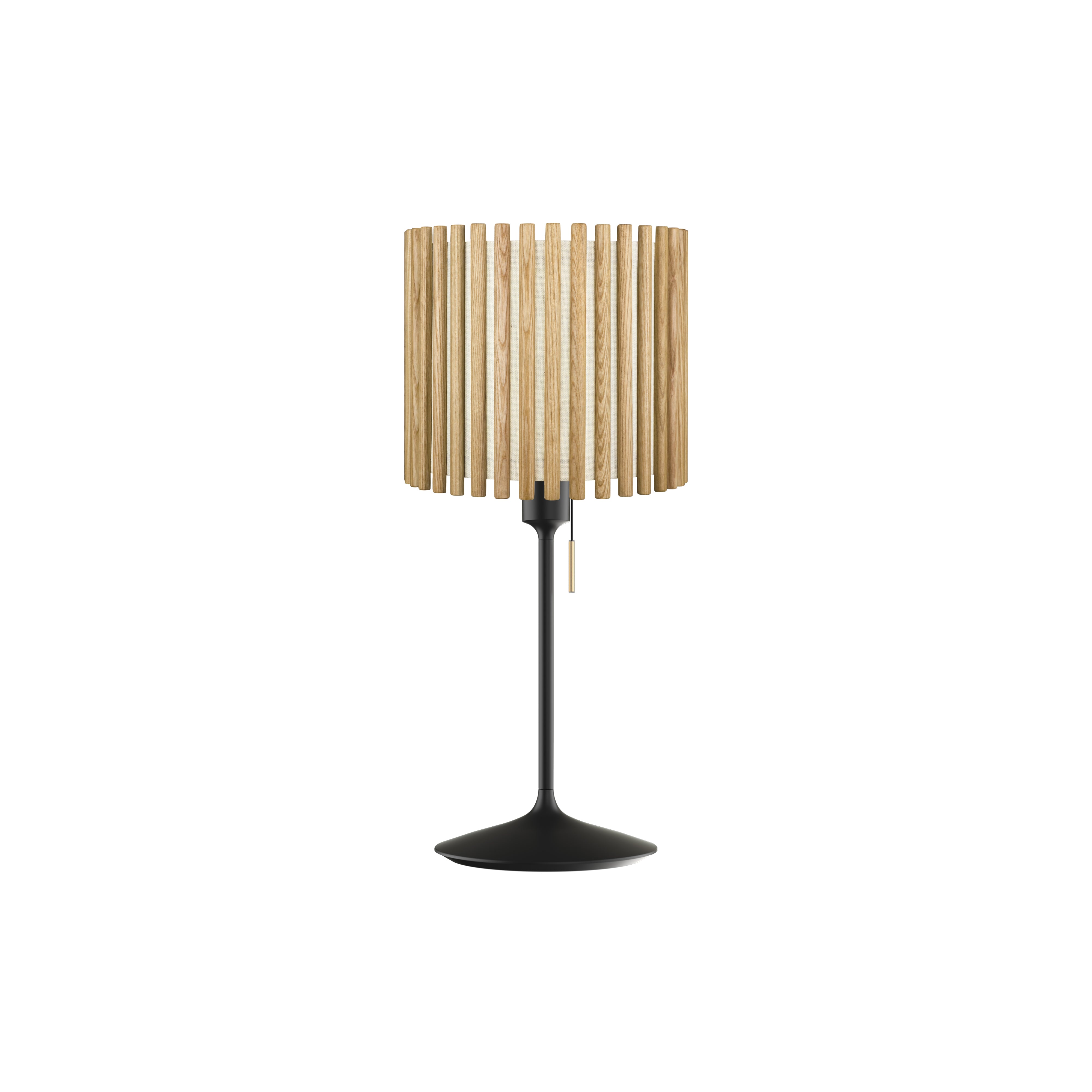 The Komorebi Table Lamp's shade features wooden lamellas paired with textile elements. Available in mini, medium, and large sizes, the round lampshade comes in oak or dark oak finishes. The Komorebi collection is inspired by the Japanese concept of sunlight filtering through trees, aiming to bring a sense of tranquility to various interior settings.