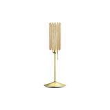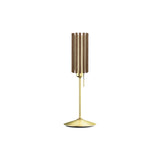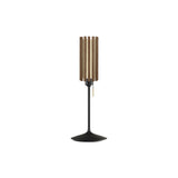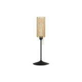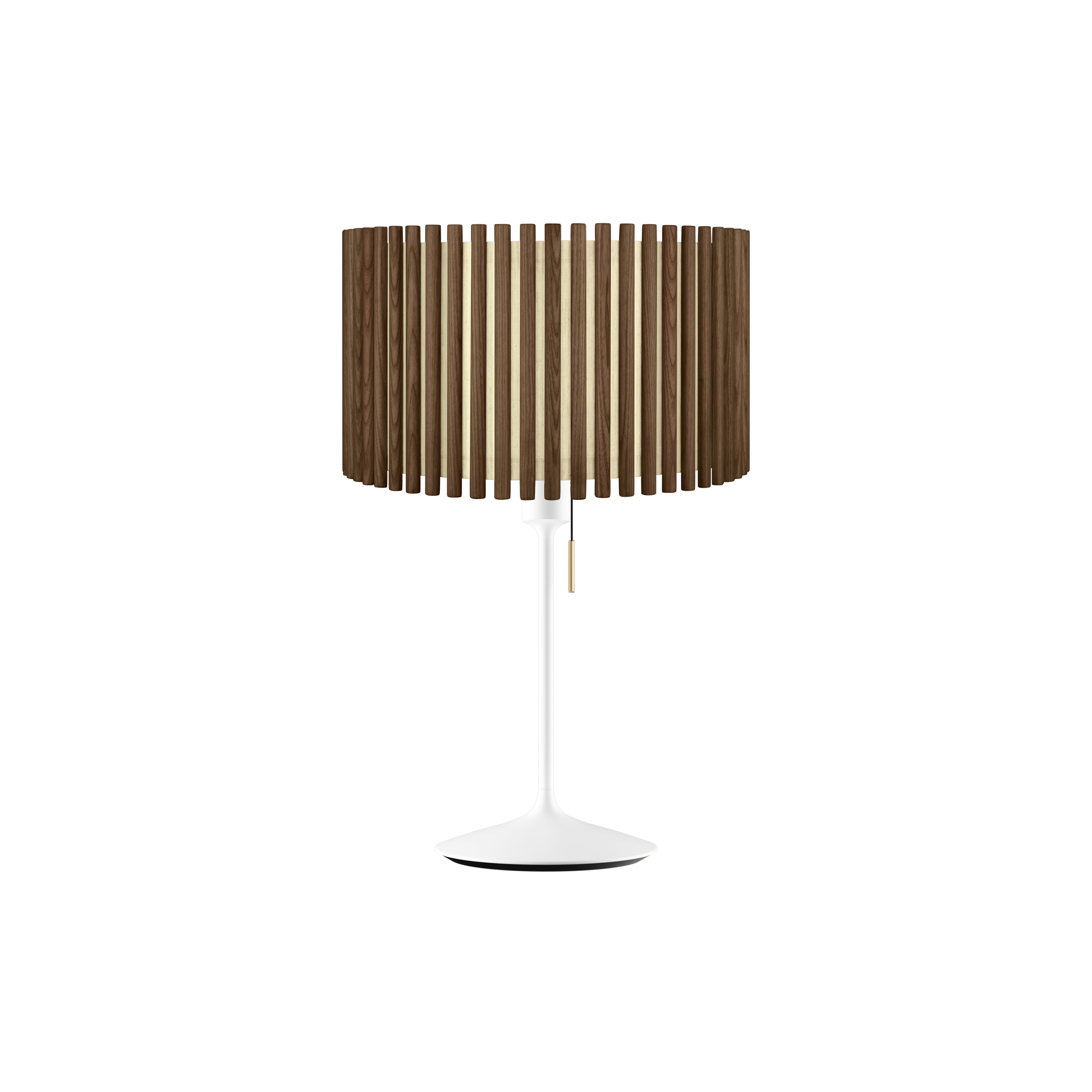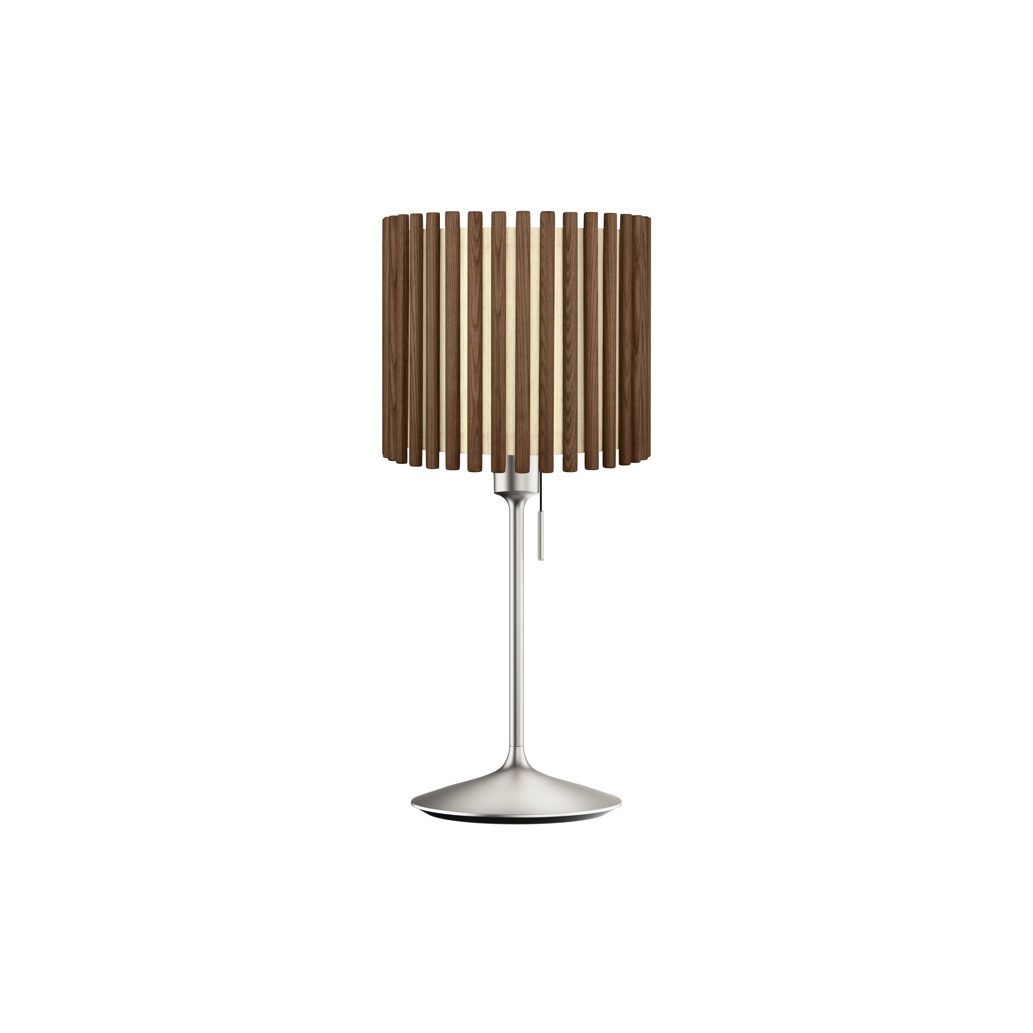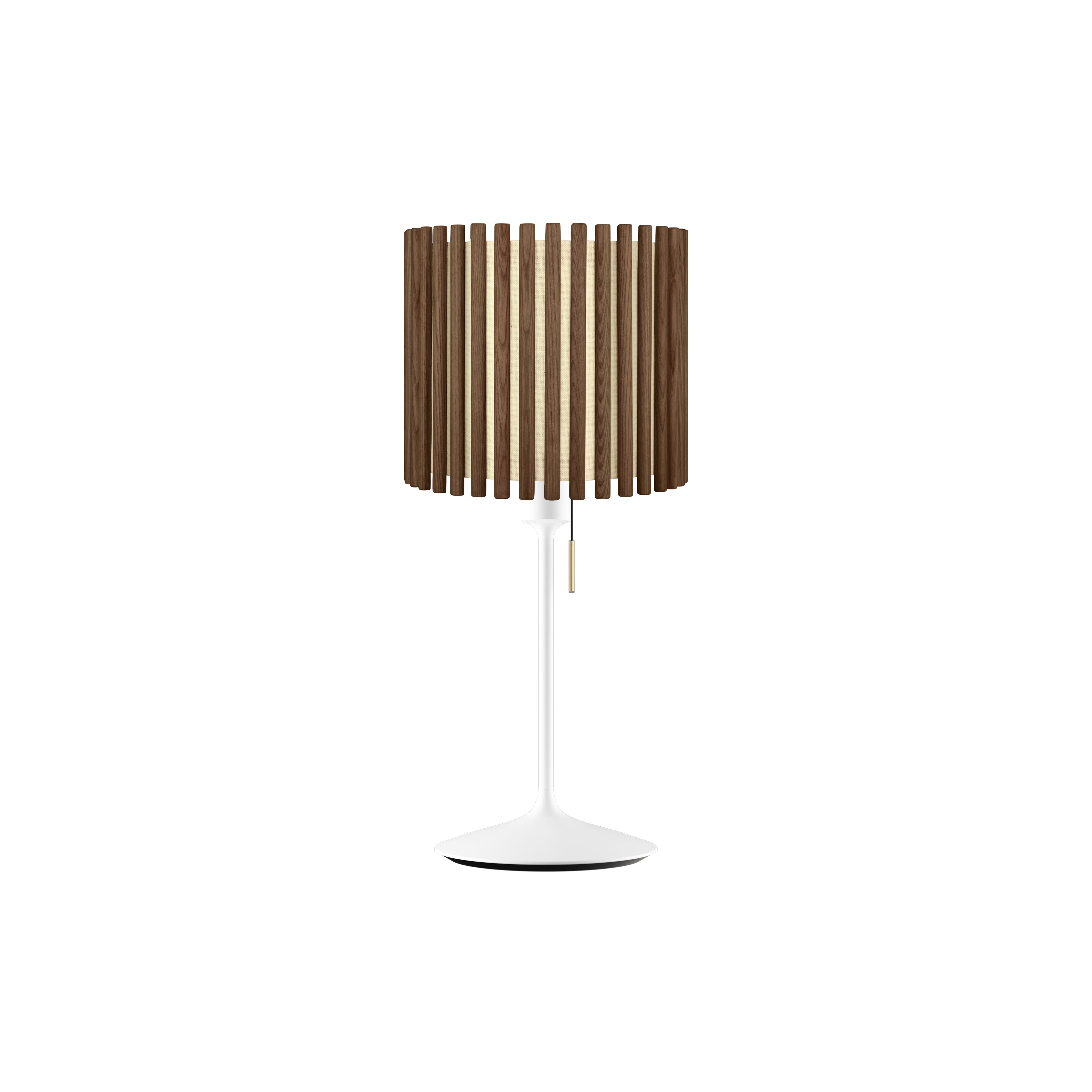 The Komorebi Table Lamp's shade features wooden lamellas paired with textile elements. Available in mini, medium, and large sizes, the round lampshade comes in oak or dark oak finishes. The Komorebi collection is inspired by the Japanese concept of sunlight filtering through trees, aiming to bring a sense of tranquility to various interior settings.