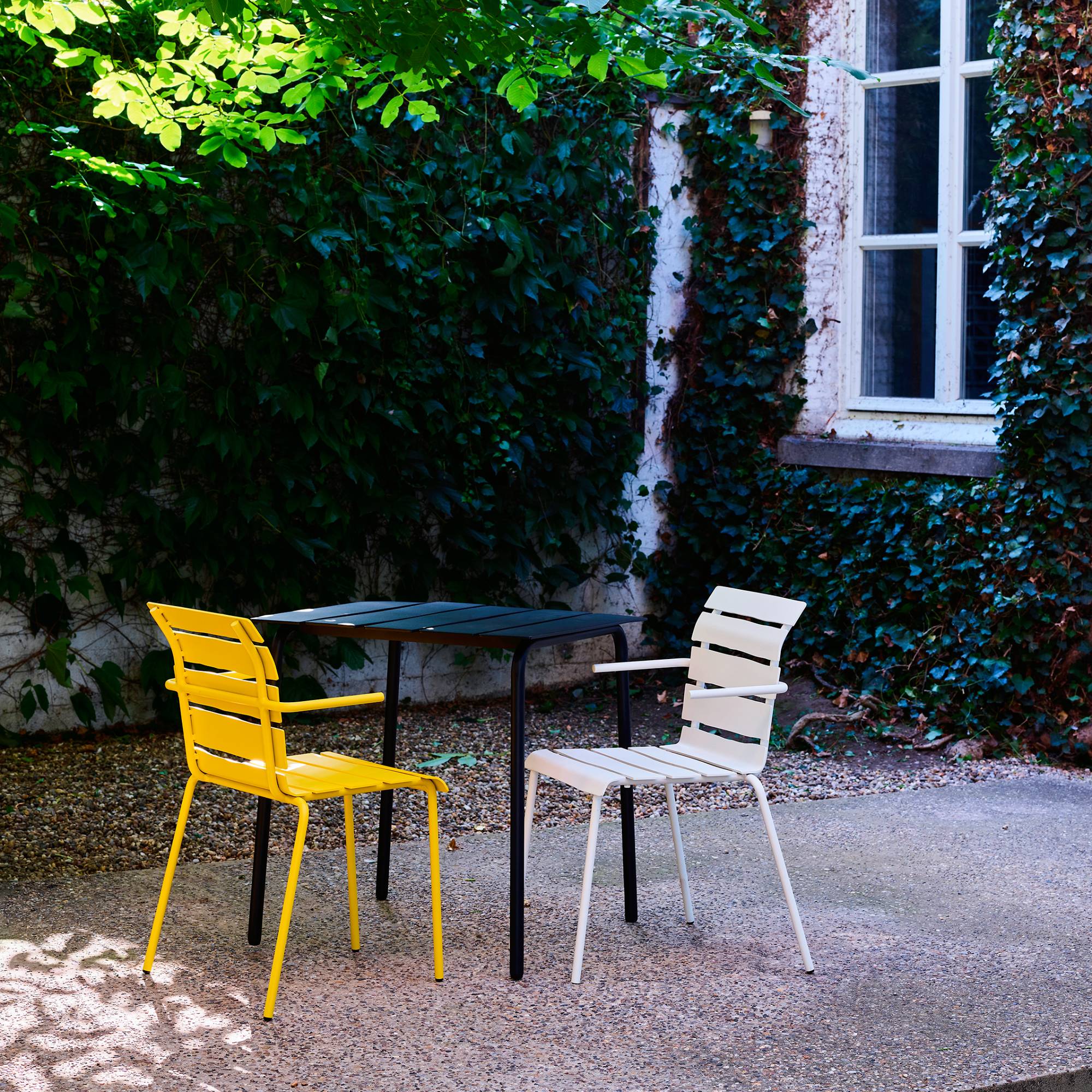 A handily stackable outdoor chair also reflects the childlike whimsy that characterizes the work Belgian designer Marten Baas. In a choice of off-white, black or signal yellow, Aligned is constructed in heat-lacquered aluminium with seat slats that line up in slightly irregular and asymmetrical fashion. The playful spirit is further reinforced by the armchair version’s embrace with its small, forward-pointing armrests that complements the accompanying armless side-chair model.