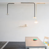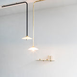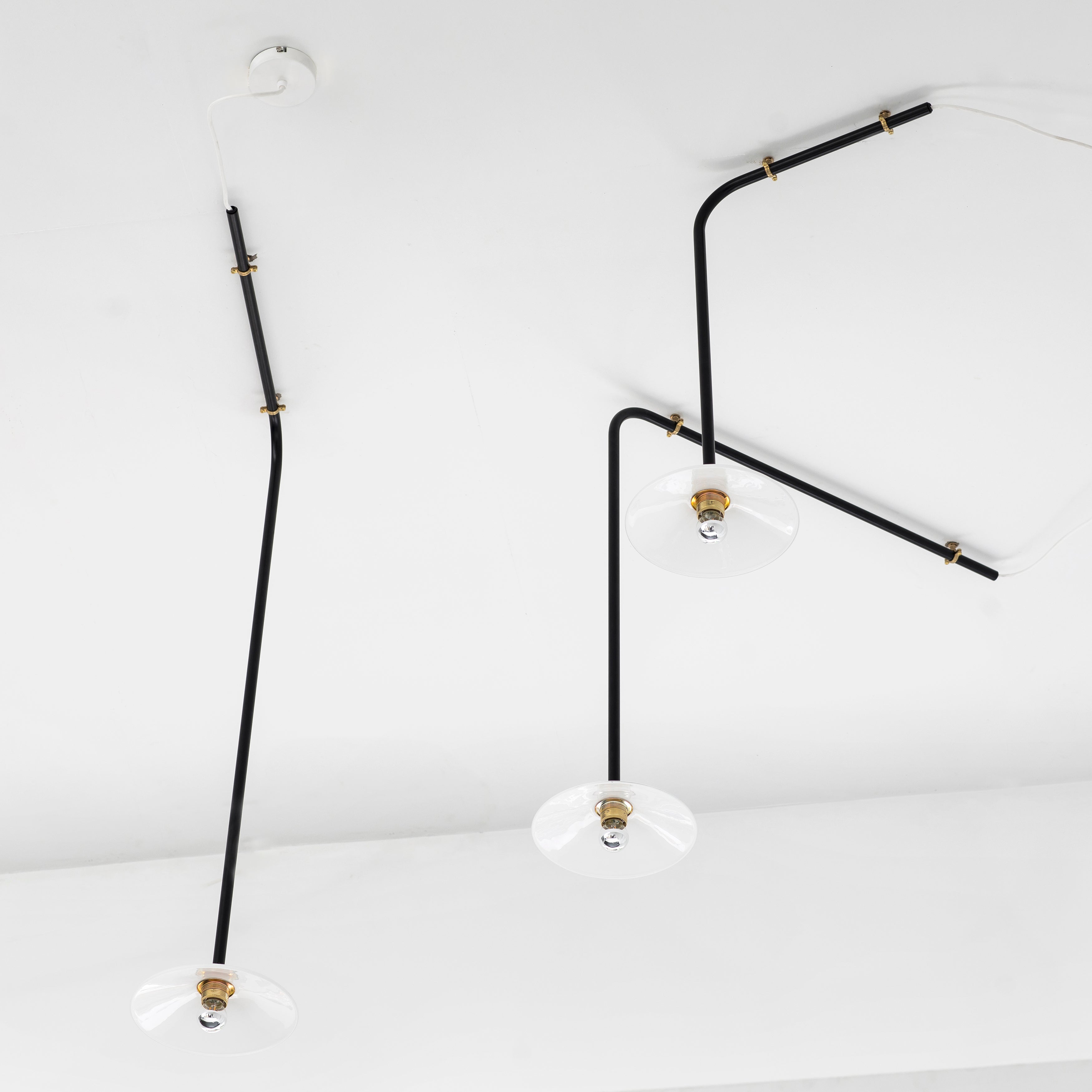 The versatile mid-range version of Fien Muller and Hannes Van Severen’s ceiling light has a moderate drop height apropos for a variety of settings. As graphic as a crisp line drawing, N°2 elevates its bent-metal tube structure with a lacquered finish in black or brass. The elemental glass shade replicates an original industrial model that the designers came upon in a flea market.