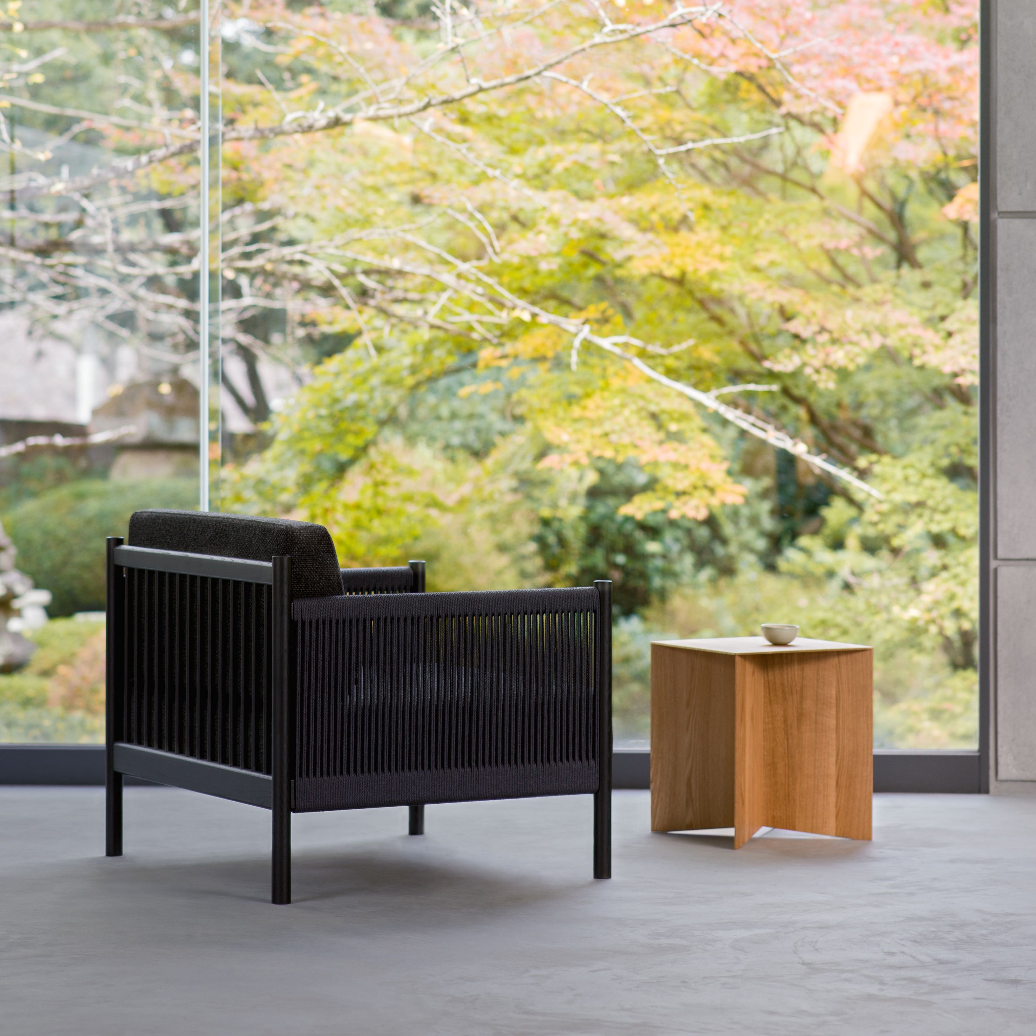 First conceived when a group of the designers gathered for an intensive design workshop that took place in the small town of Morodomi in southern Japan, the expanded collection employs tactile natural materials and rich finishes. Superbly crafted furnishings are fashioned in oak, ash, hinoki and cedar woods; buttery leather; paper cord and fine upholstery fabrics; as well as unique Japanese-inflected finishes. Each piece is crafted in Morodomi, from Mowat’s Aiizome storage cabinet painted with sumi ink, red dye and two shades of Japanese indigo, to Ashizawa’s evocative plumply cushioned Raft platform sofa, to Anderssen & Voll’s sculpted-wood Blest side chair with its curved back reminiscent of a sail.