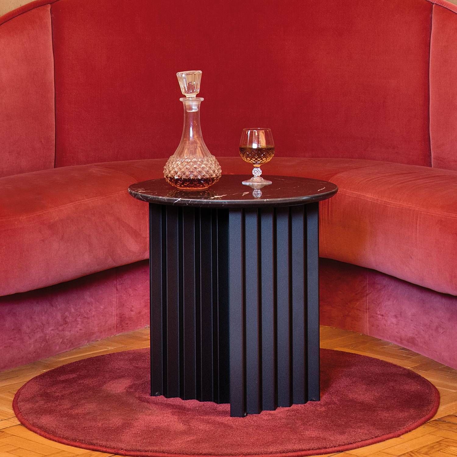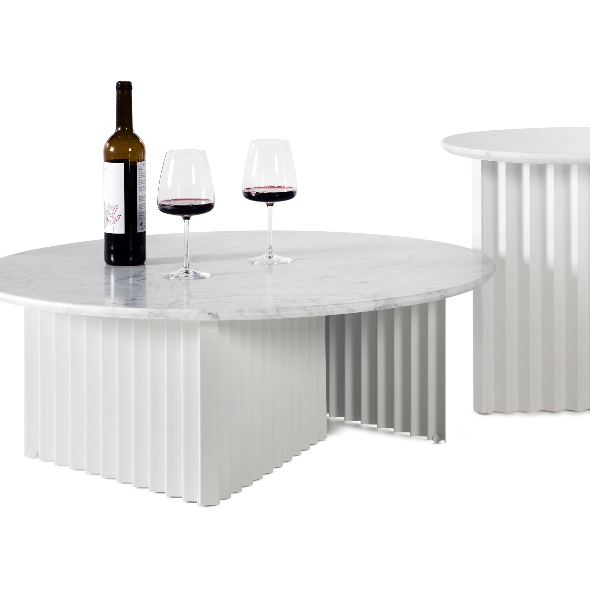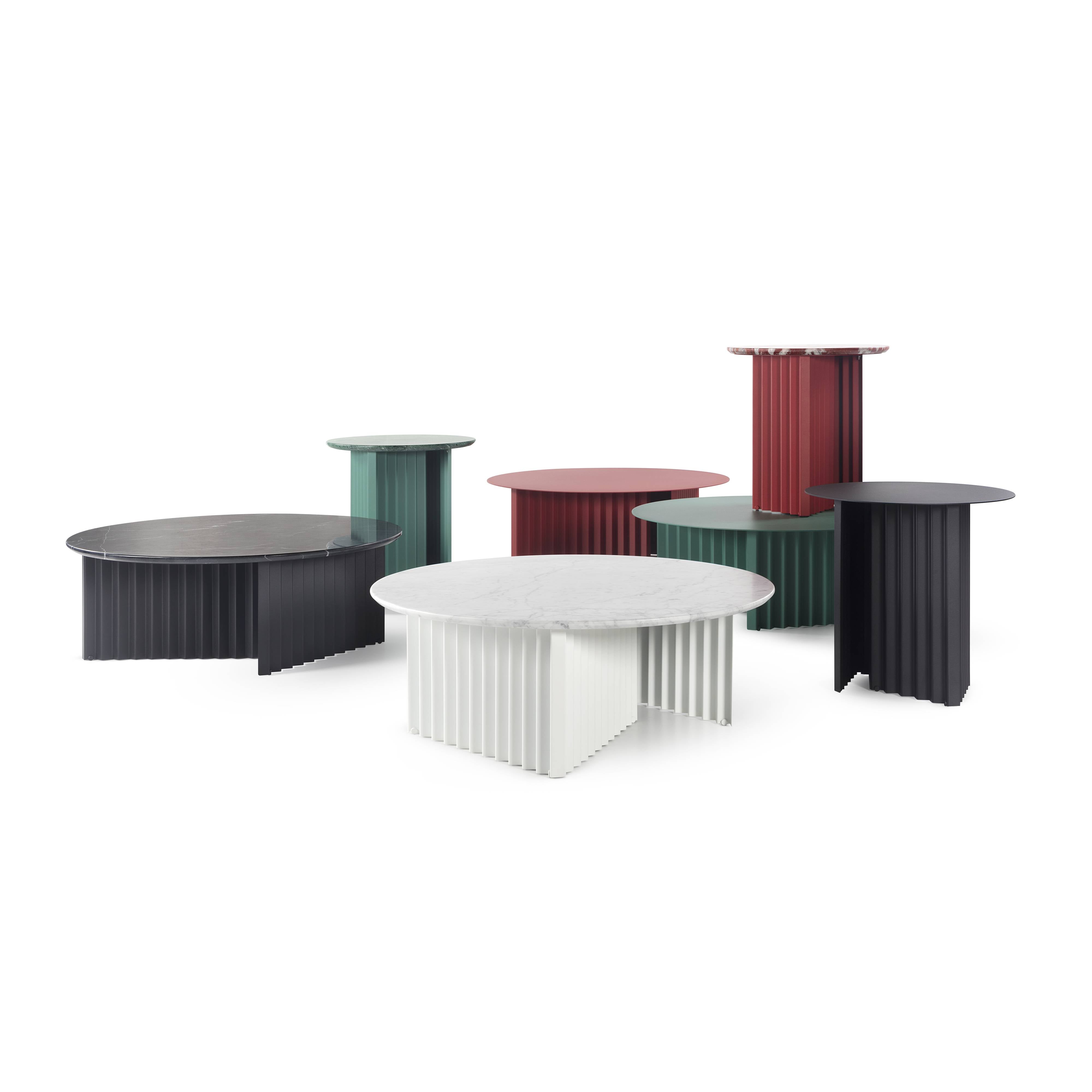 RS Barcelona offers its signature Plec table in a choice of 2 round versions with a squared-off base. With its easily identifiable accordion-pleated motif, the table is completely fabricated of steel with a cataphoretic polyester coating and can be situated indoors or out. The design by Antoni Pallejà Offices also offers a luxe variant in each of the 4 color-ways with a marble top to match