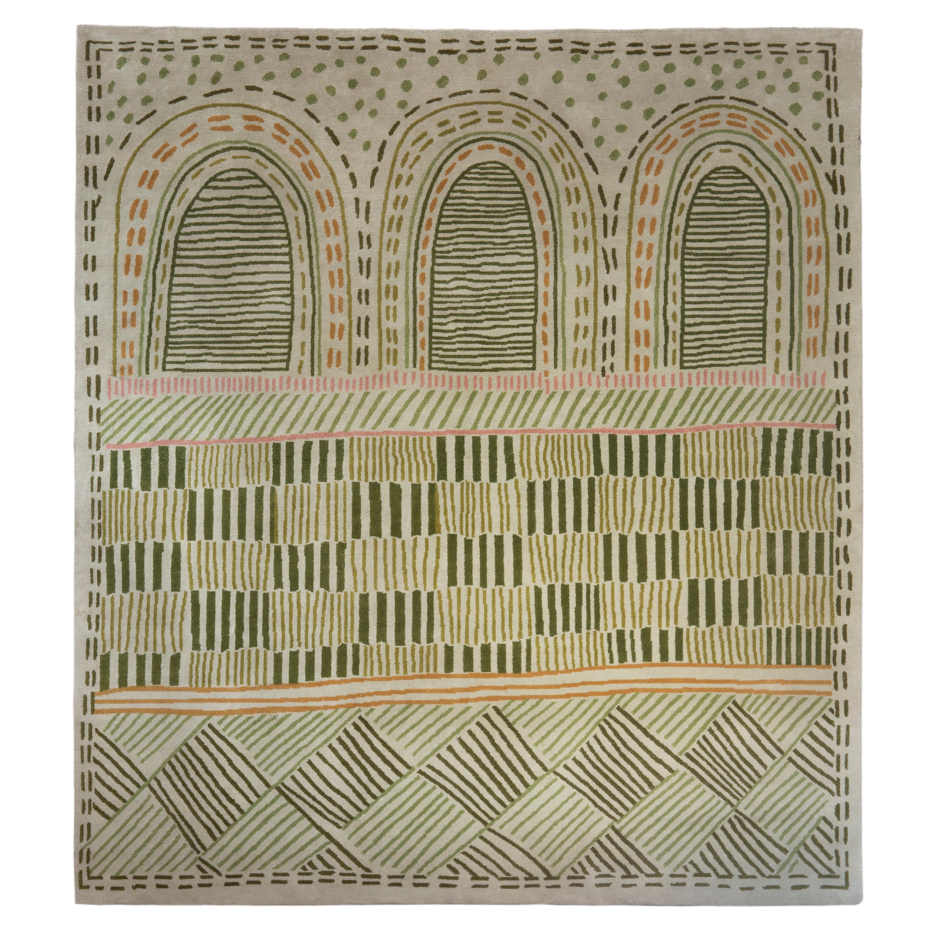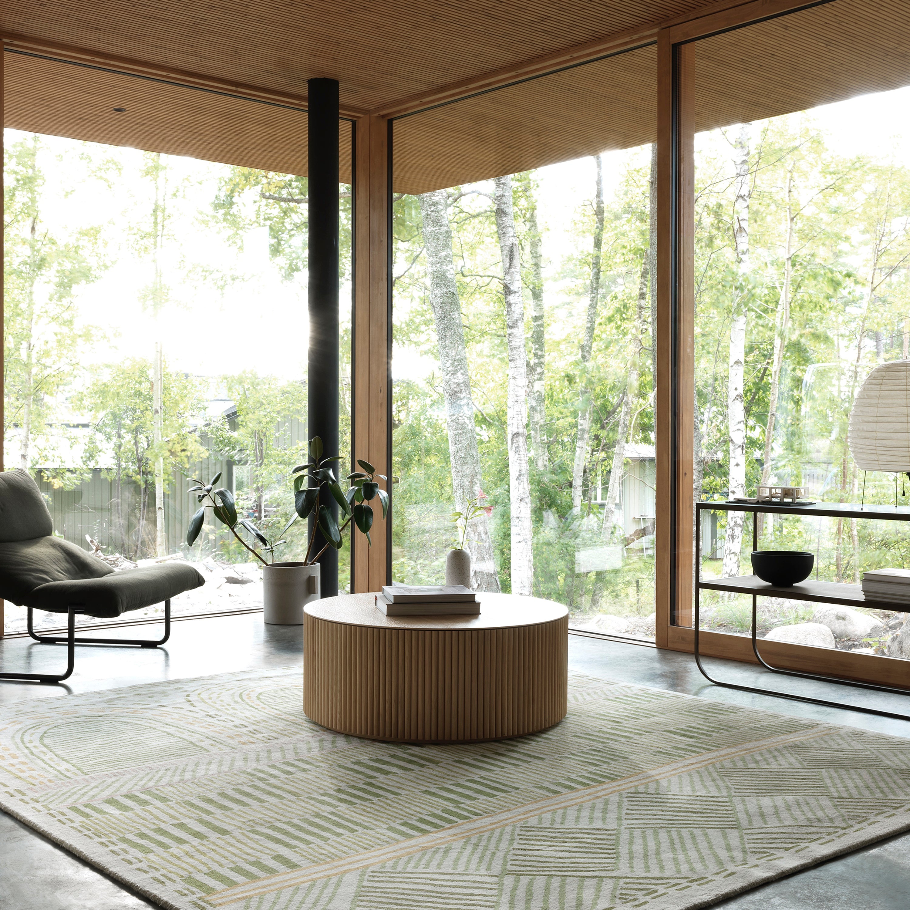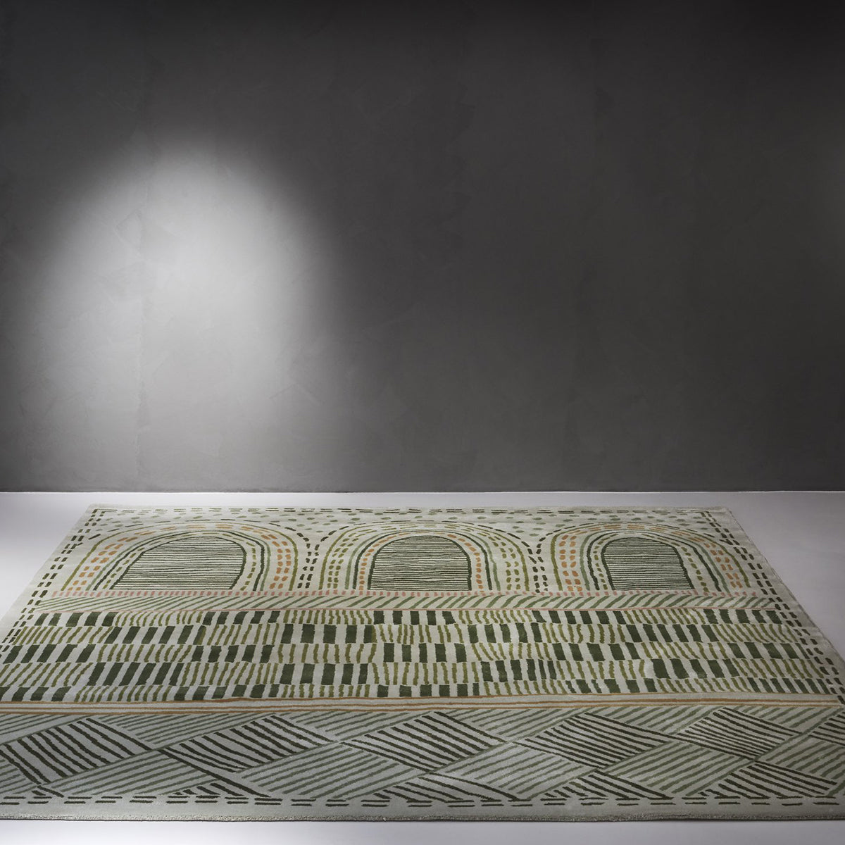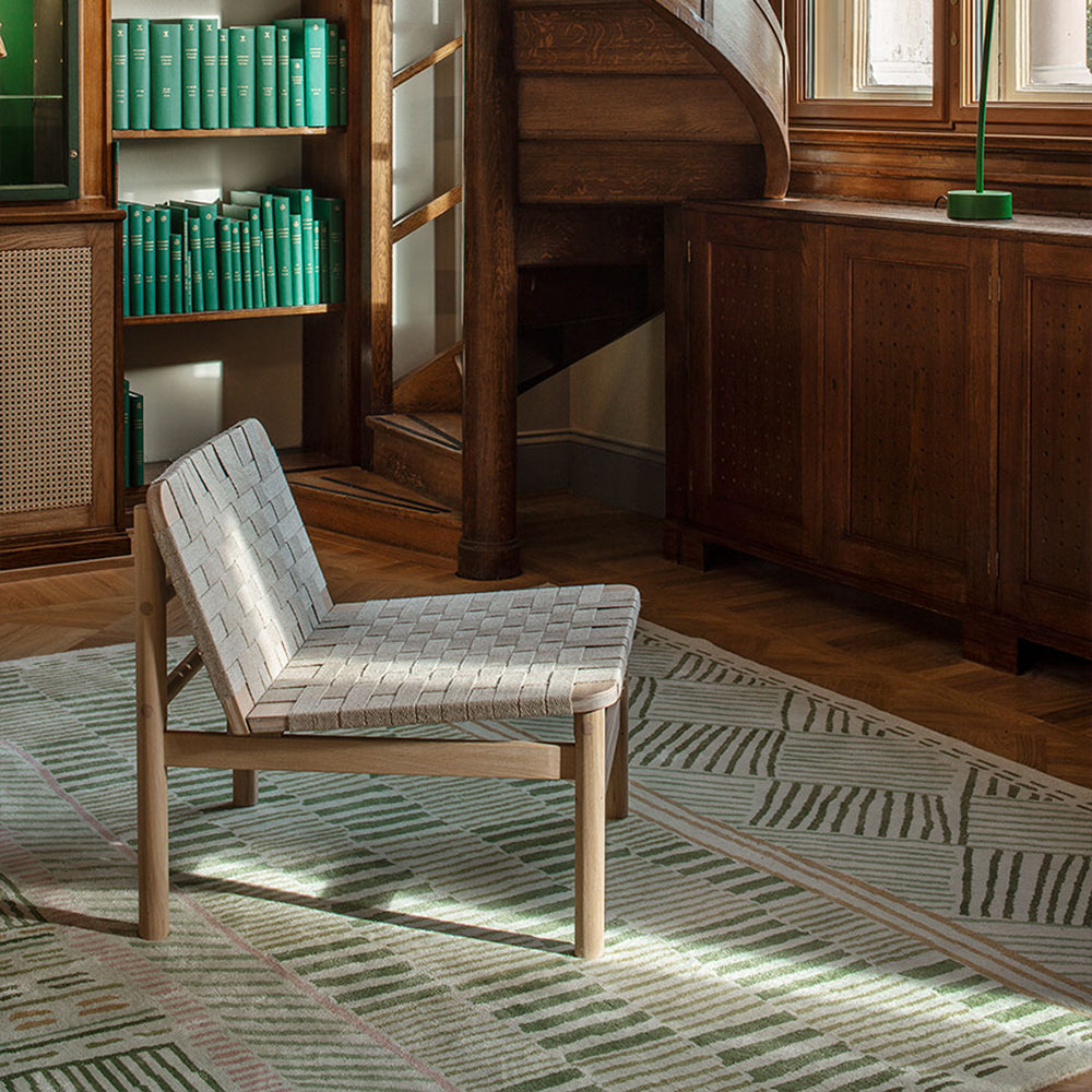 With the look and typical green color of reading rooms, Biblioteket was suggested by Emma Olbers' redesign of the Old Library in Stockholm’s National Museum, down to the arched windows, rows of books and oak parquet. Hand-knotted in 50% wool and 50% Tencel from Asplund’s Tibetan Thin range, it features a shorter pile and more delicate cut to suit intricate patterning.