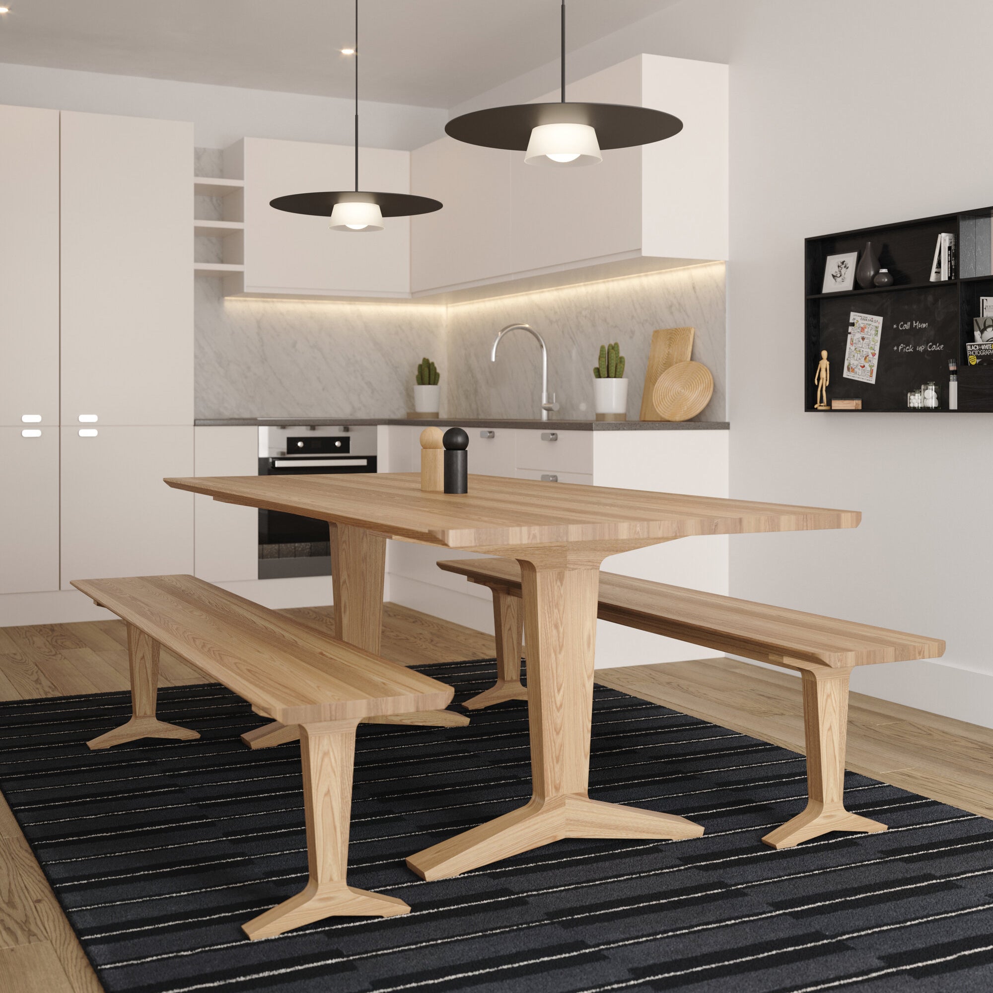 This spacious dining table, crafted from solid oak, comfortably seats up to ten people. Its design features a substantial base for optimal stability and an undercut tabletop, adding a refined touch to its robust construction. An optional bench, designed to fit seamlessly beneath the table when not in use, offers a cohesive and space-saving dining solution.