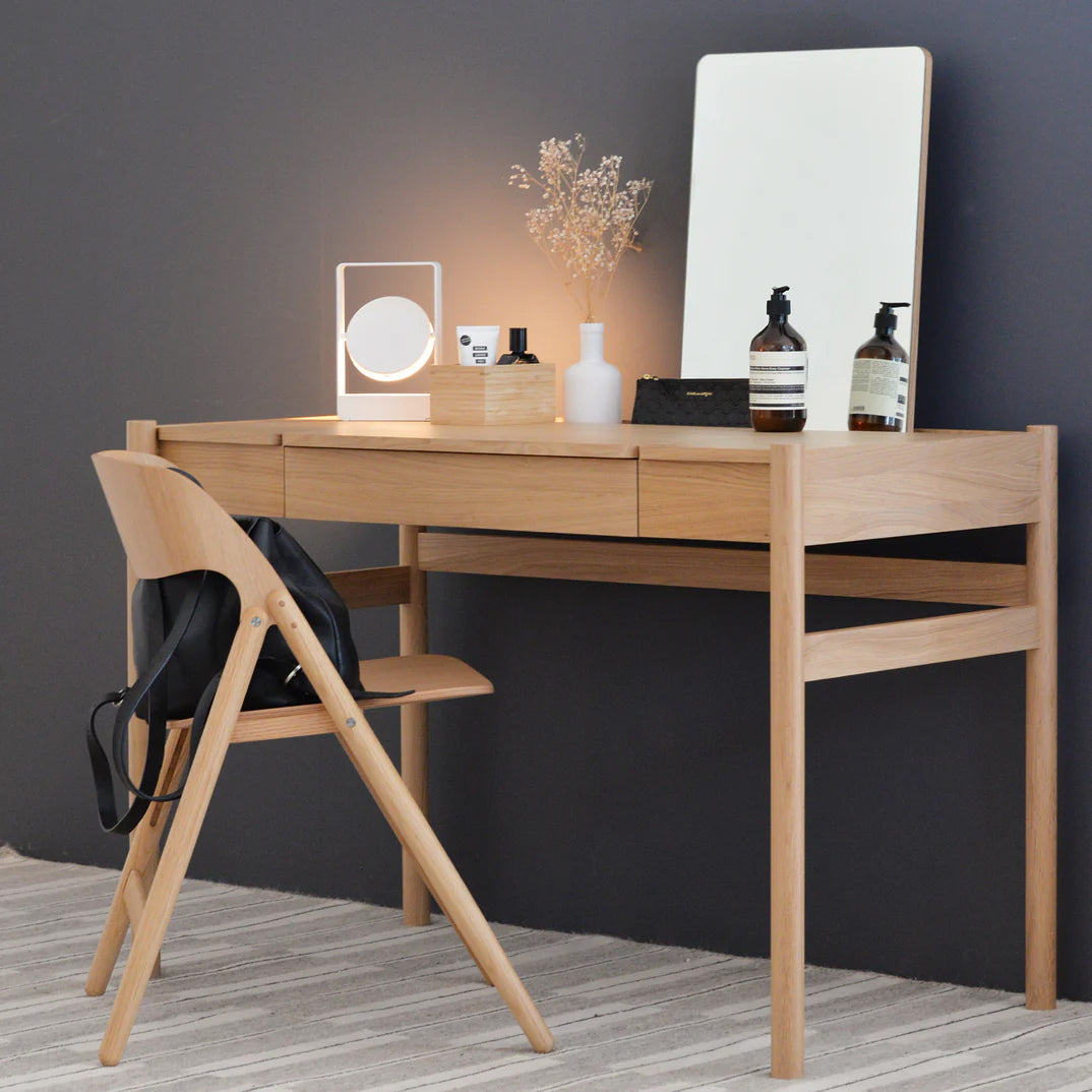 Siblings Sarah and Henrik Böttger rethink the bedroom dressing table with Pala, a refined and highly functional design that also doubles as a desk. Crafted from solid and veneered oak, it features 2 compartments with removable magnetic top panels, a slim drawer with sections for easy organization and practical storage and a detachable mirror.
