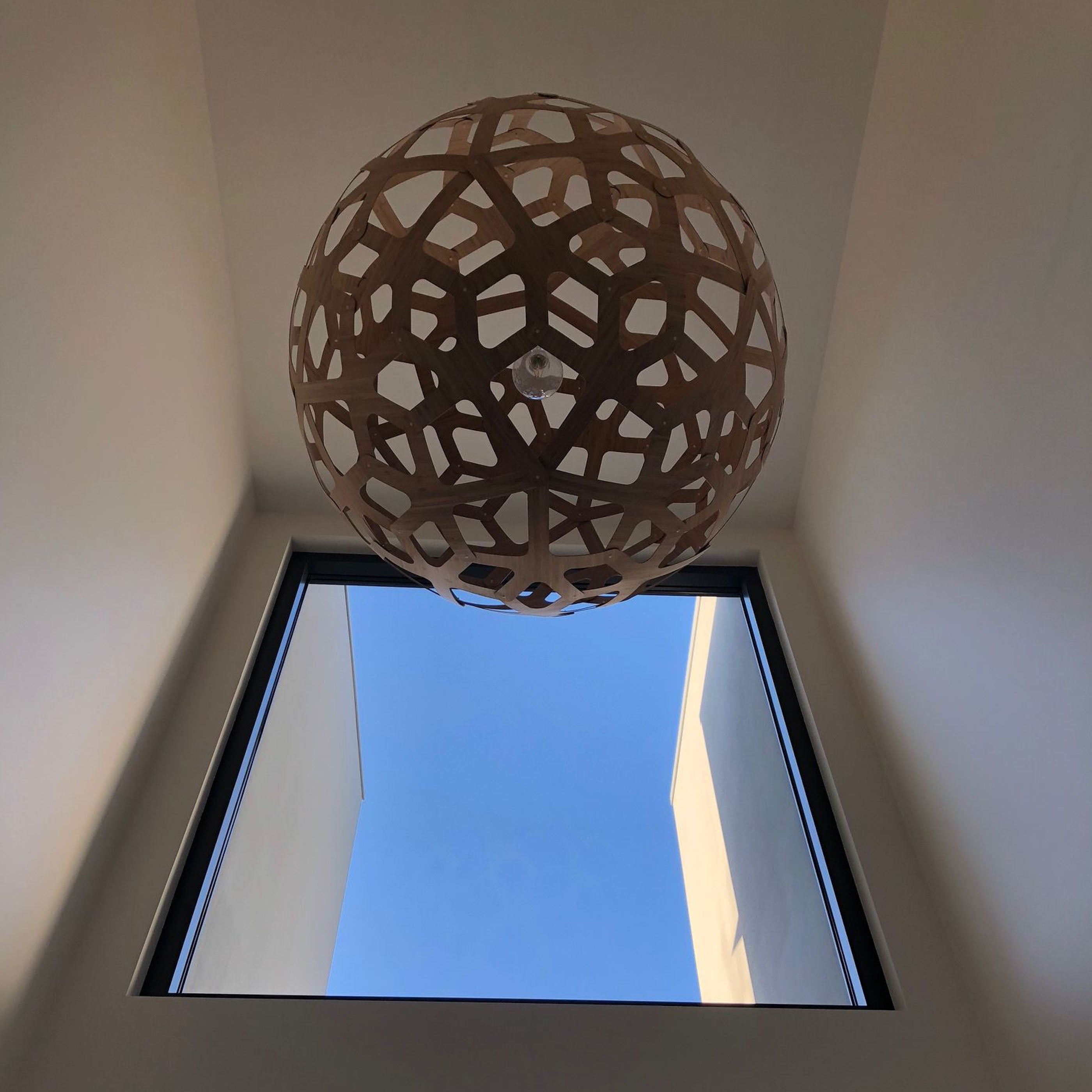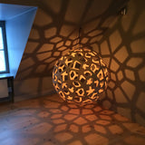 The "fingers" of the geometric polyhedron structure of this lamp are reminiscent of the coral reefs David Trubridge explores off the coast of New Zealand. A love for earth drove the construction, flatpacked to reduce freight and packing resources. Identical pieces make home assembly a snap. The celebrated designing craftsman ended up in his adopted home after he, his wife and their two sons sold everything and set off on a yacht for a world adventure. It culminated in 1985 when they decided to remain there. While an artist-in-residence at Hawkes Bay Polytechnic (now EIT), he built a house and suddenly found himself with further commissions. Before realizing homes, lamps and furniture, David left Newcastle University in 1972 with a degree in Naval architecture. His work has appeared in countless museums, including the Victoria & Albert and the Pompidou Centre. That barely scratches the surface of his fascinating story and work ethos.