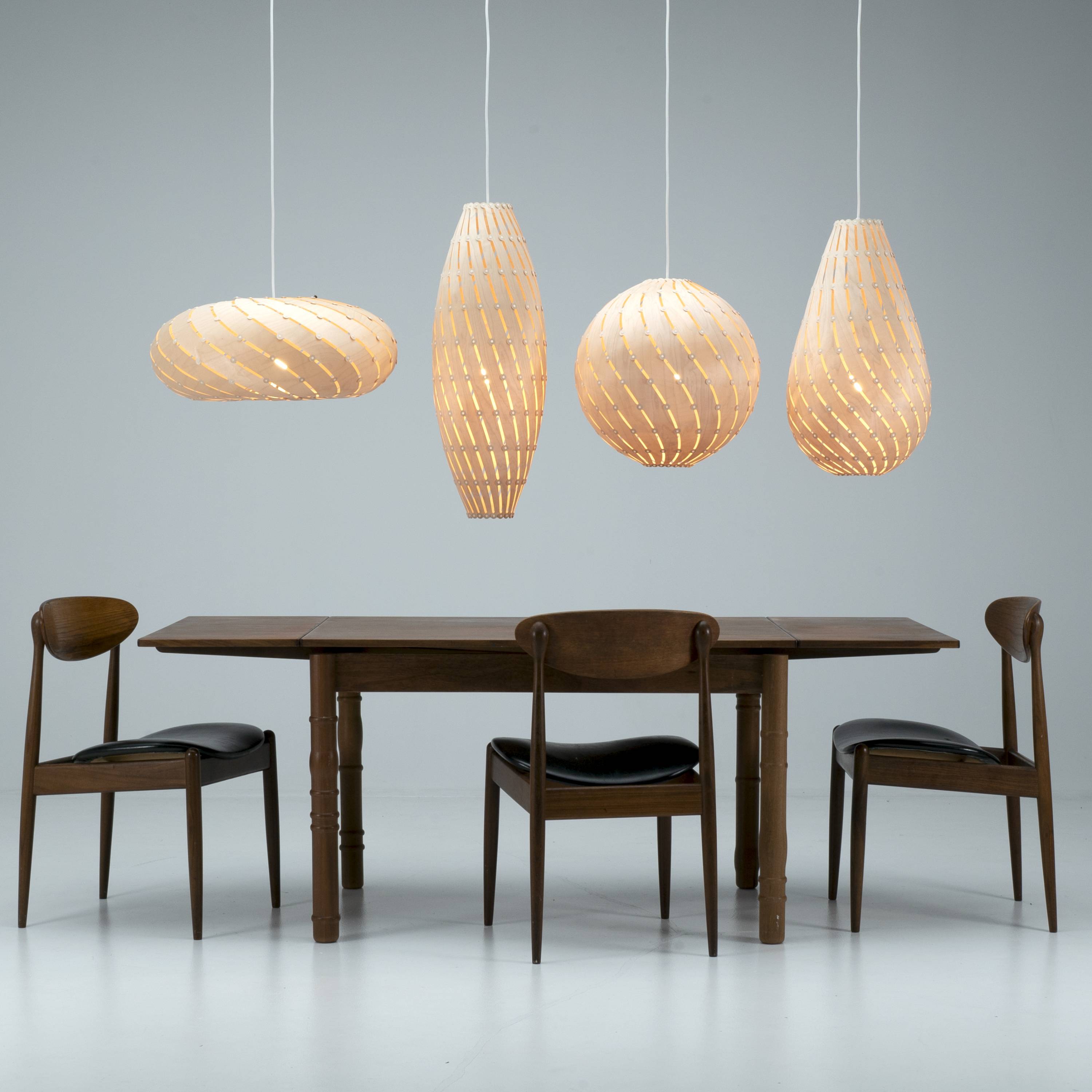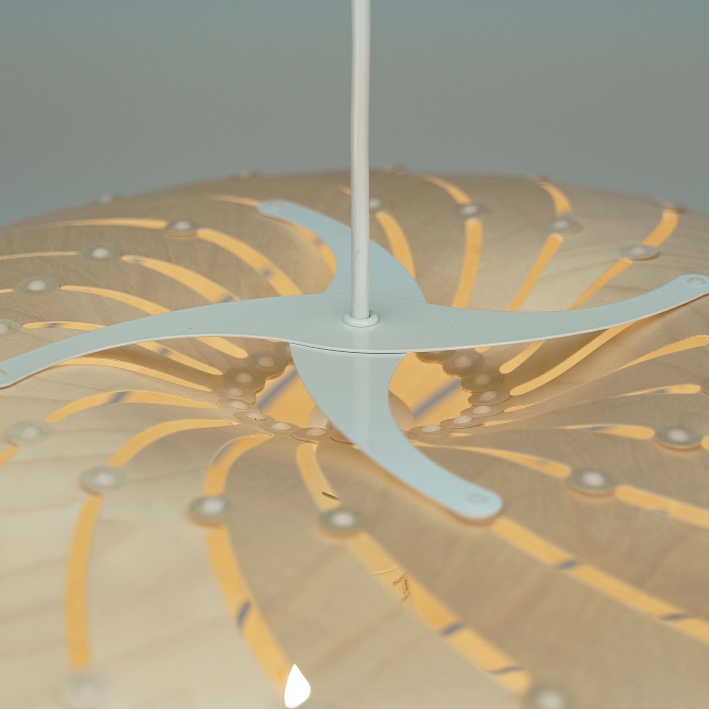 Swell adds a rounded disc shape to David Trubridge's pendant series Ebb, with its wavy swirl suggested by ripples in the water. Newly redesigned in more sustainable ultra-thin Finnish birch plywood and held together with nylon clips, it emits a glowing lantern effect which also highlights the natural woodgrain. Shipped as an unassembled flat "kitset" in environmentally friendly packaging, the shade comes complete with a cord-bulb holder and a ceiling canopy.