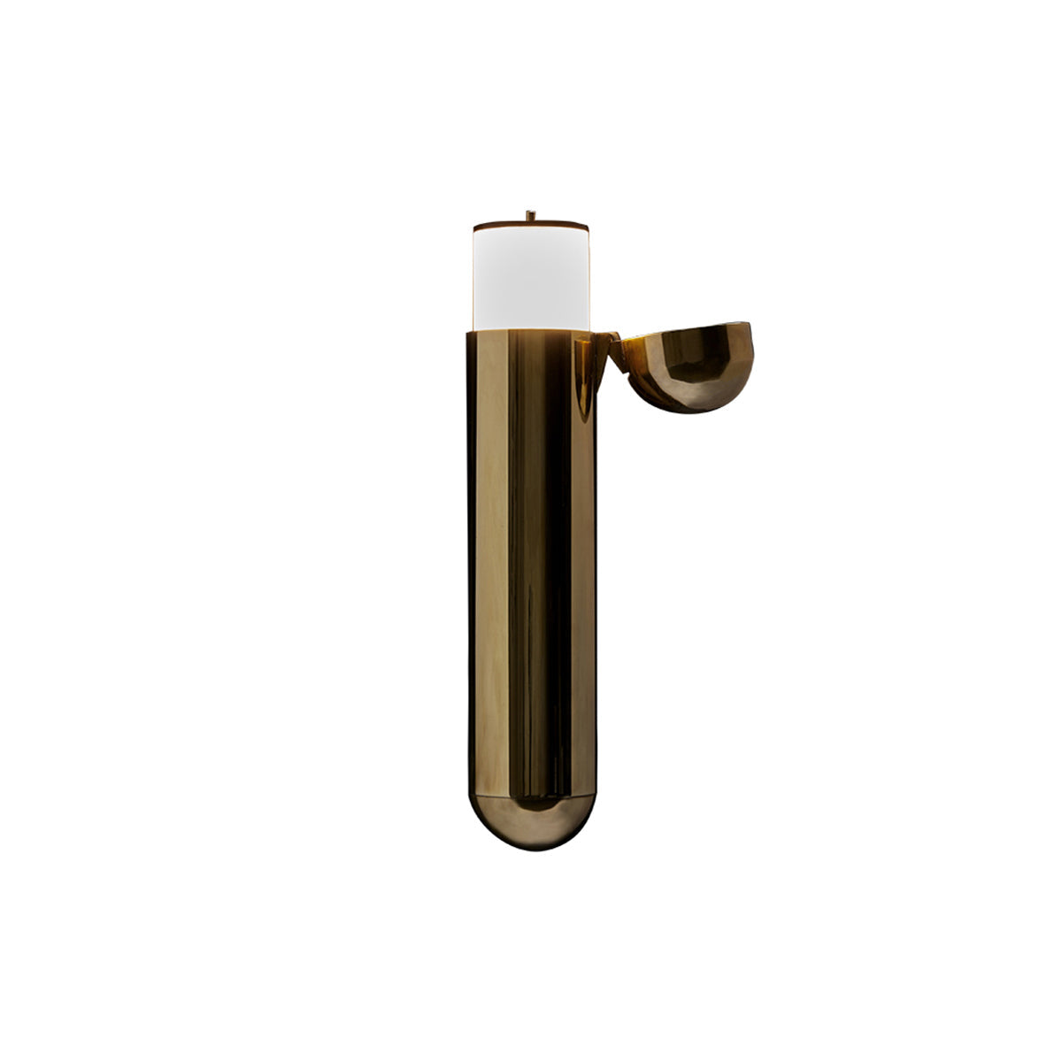 ISP’s elegant brass capsule adapts in a wall version with an alluring presence and a satisfyingly interactive operation. A brainchild of Italian-Russian designer Ilia Potemine, the lamp’s inner polycarbonate diffuser can be manually extended to provide the desired span of light or hidden altogether by closing the end cap—the glow ”eclipsed,” as maker DCW Éditions puts it.