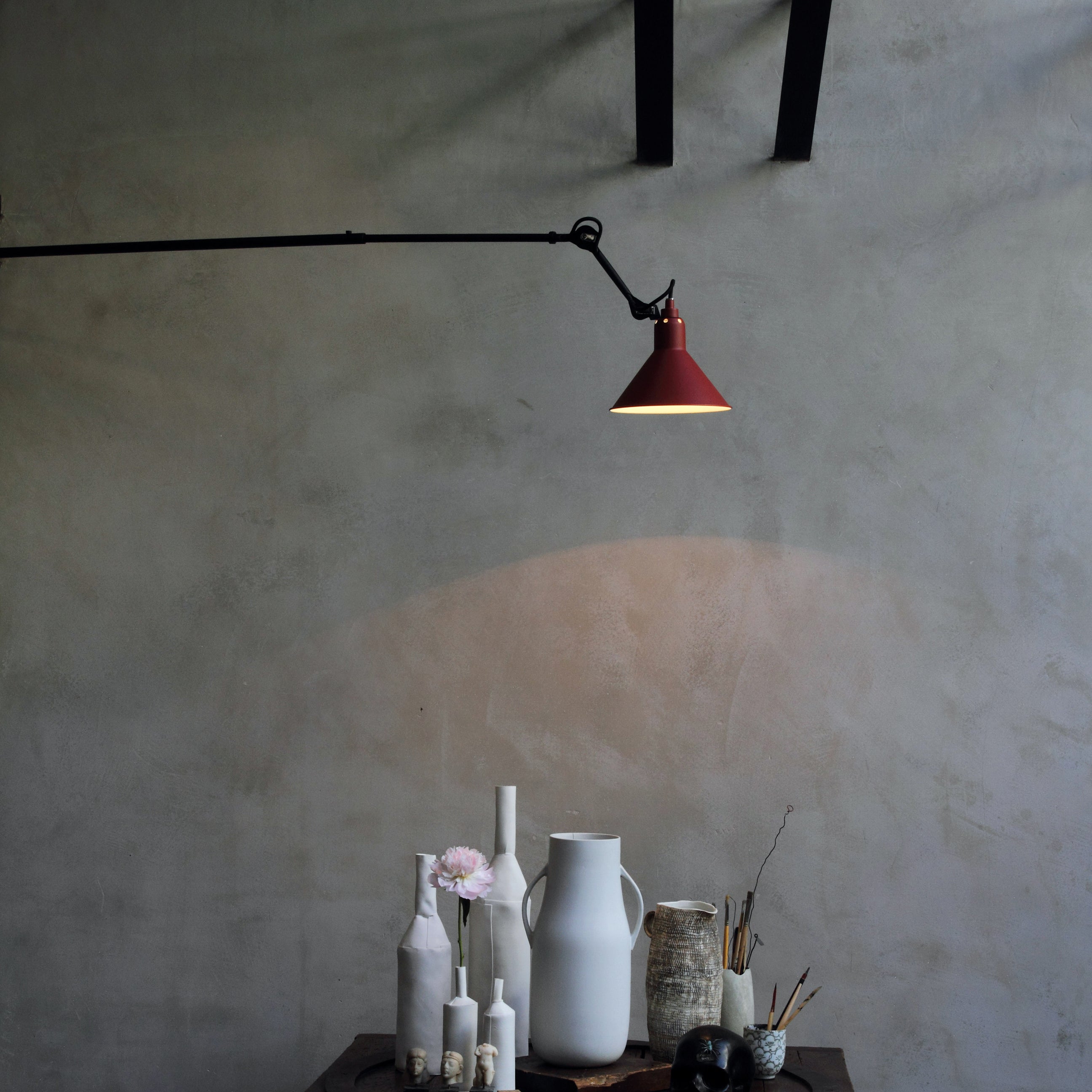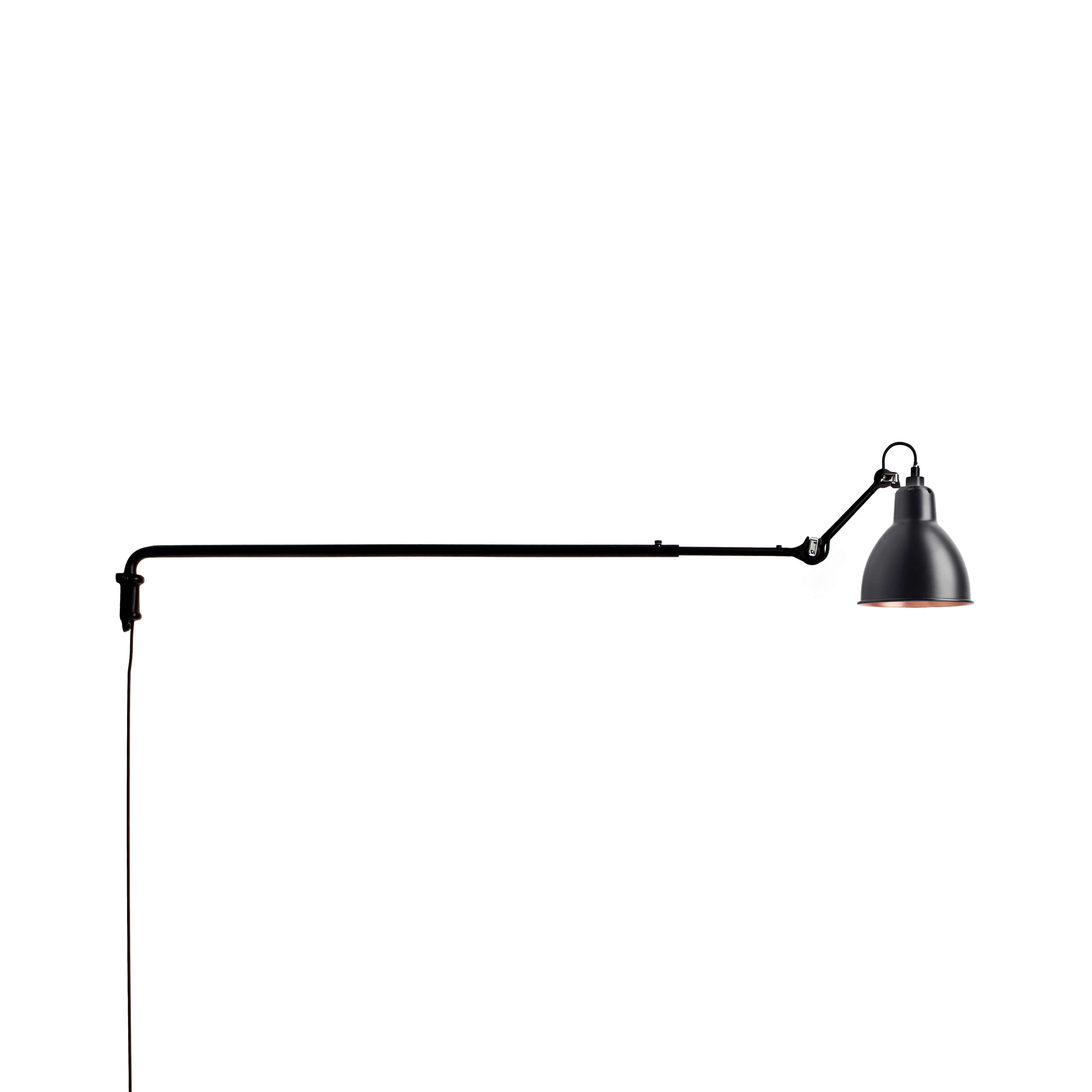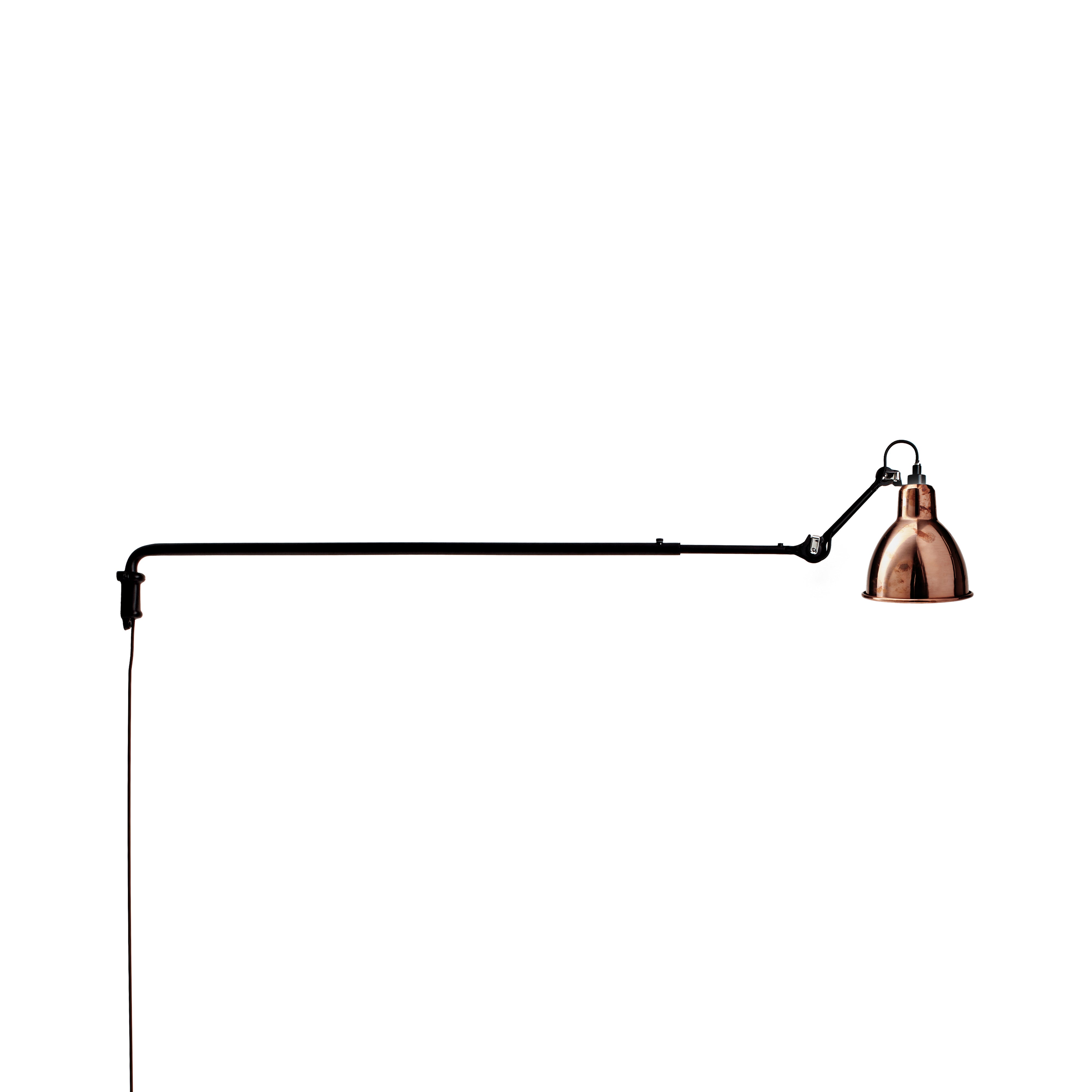 Surprisingly, the long arm of N°213 works both in smaller spaces to save floor space as well as in larger areas, where it might spotlight a desk, conversational grouping, dining table or even a piano. This variant in French designer Bernard-Albon Gras' 1921 series brings a dramatic visual sweep to his pioneering articulated lighting scheme with its usefulness in directing illumination exactly where it is needed most. With a timeless steel structure in black satin-finish, the wall-mounted lamp offers a choice of conic or round shade in a range of colors as well as chrome, copper or brass.