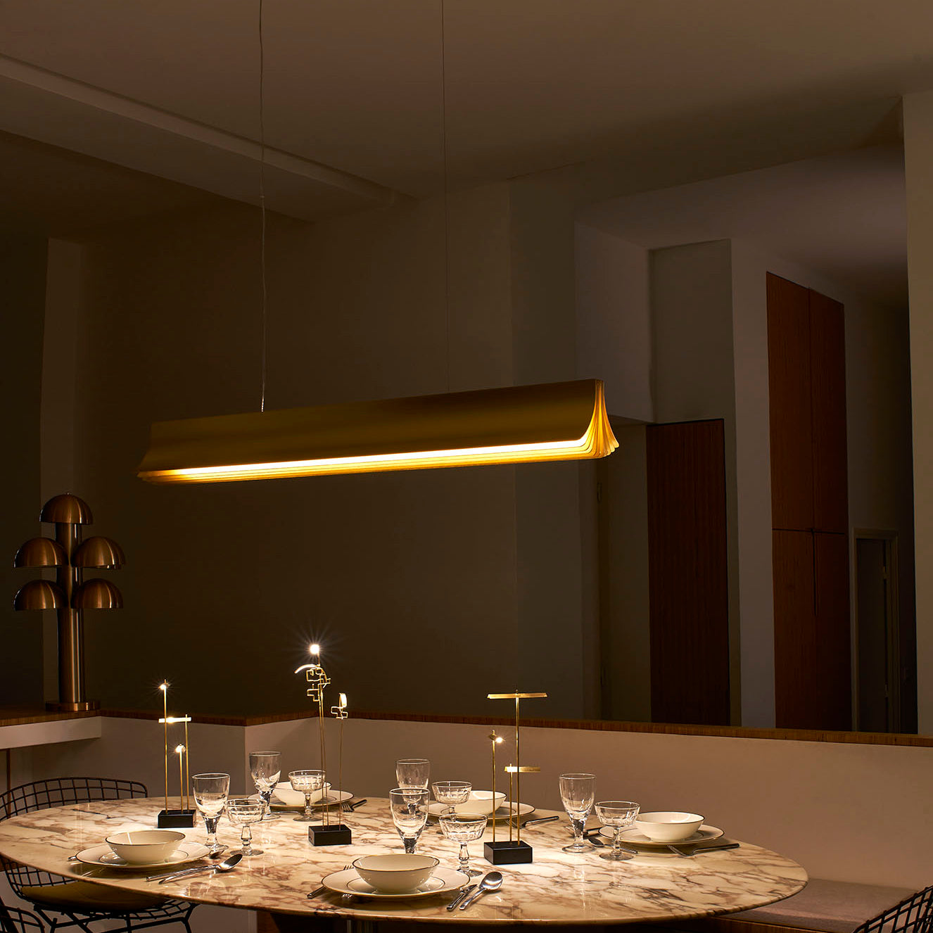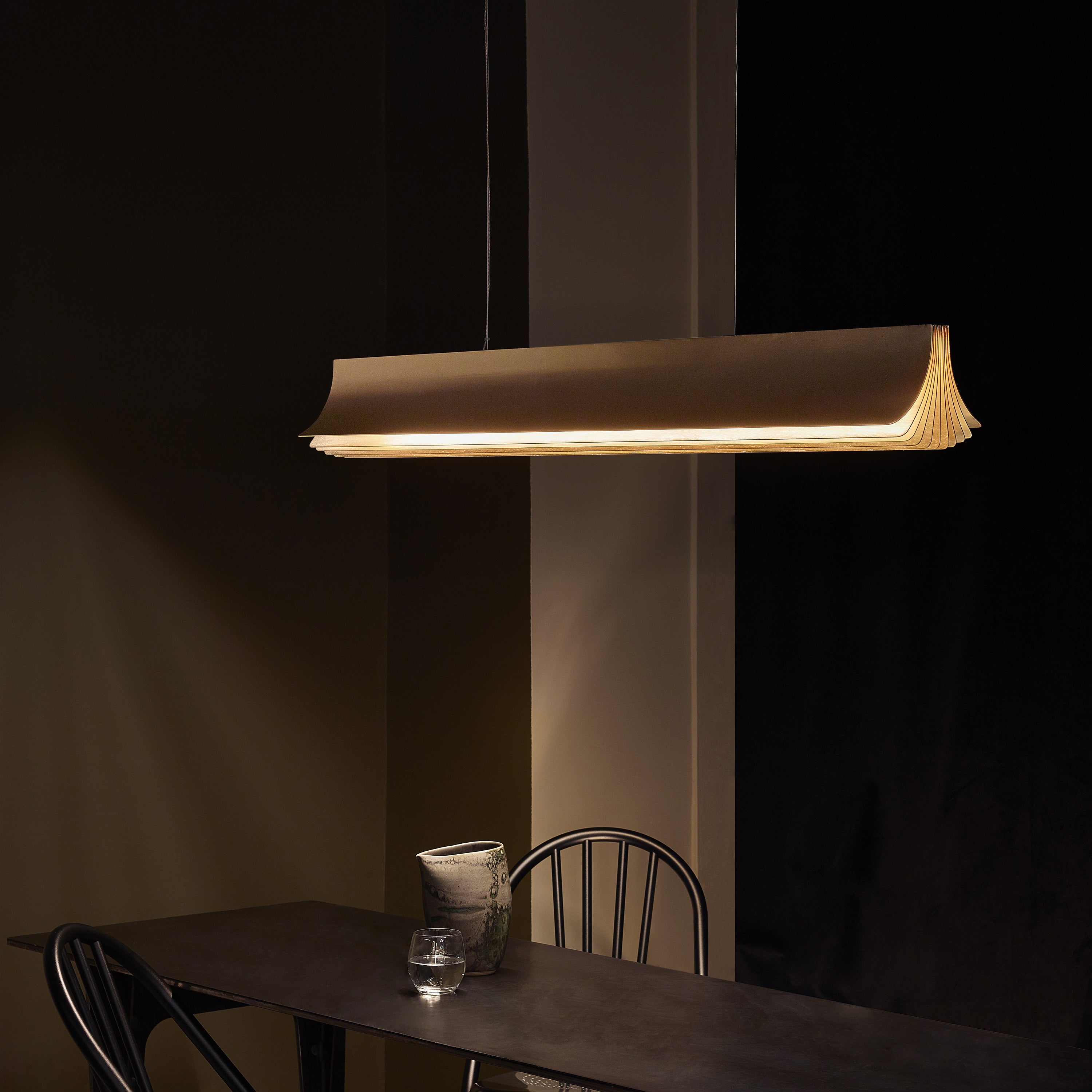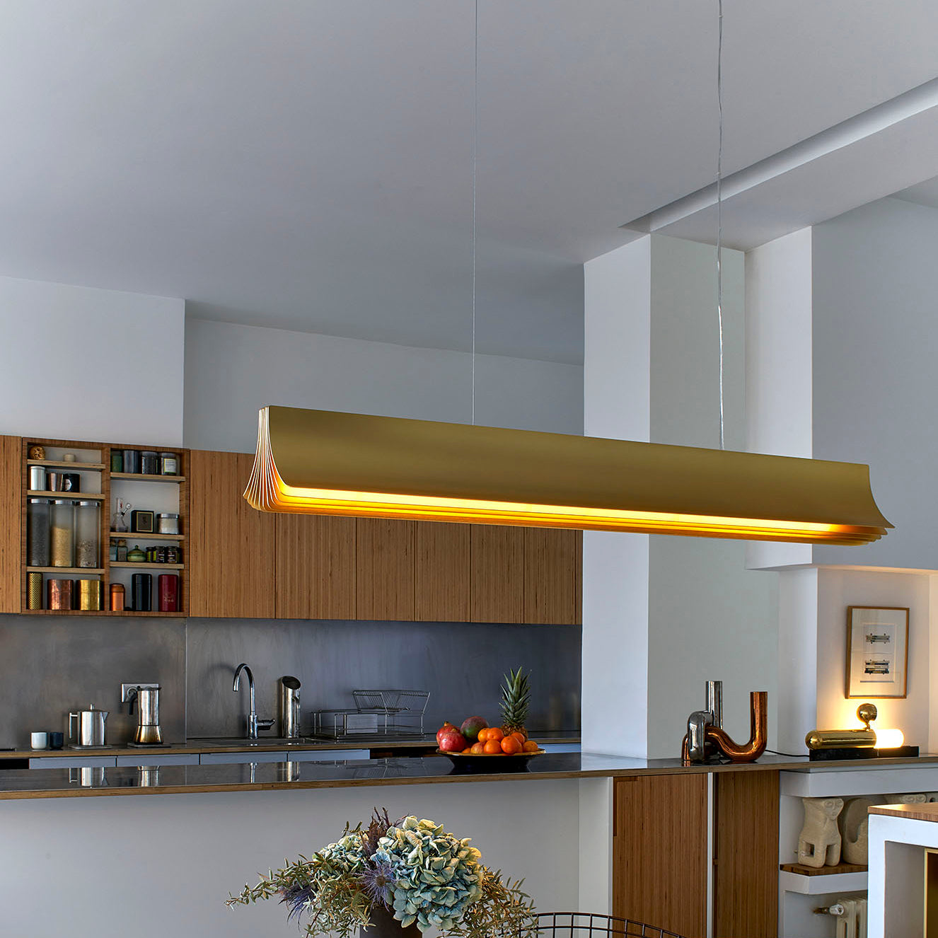 Light is as essential as the air we breathe and Philippe Nigro's pendant takes form as a spreading sheaf of golden panels to create a warmly reflective glow. Respiro translates as "breath" and the gold-tone structure in anodized aluminum fans out in a ripple as if exhaling into the surrounding atmosphere. Available in 2 sizes, the French industrial designer's horizontal fixture is suspended from a pair of wires and has an integrated LED light source.