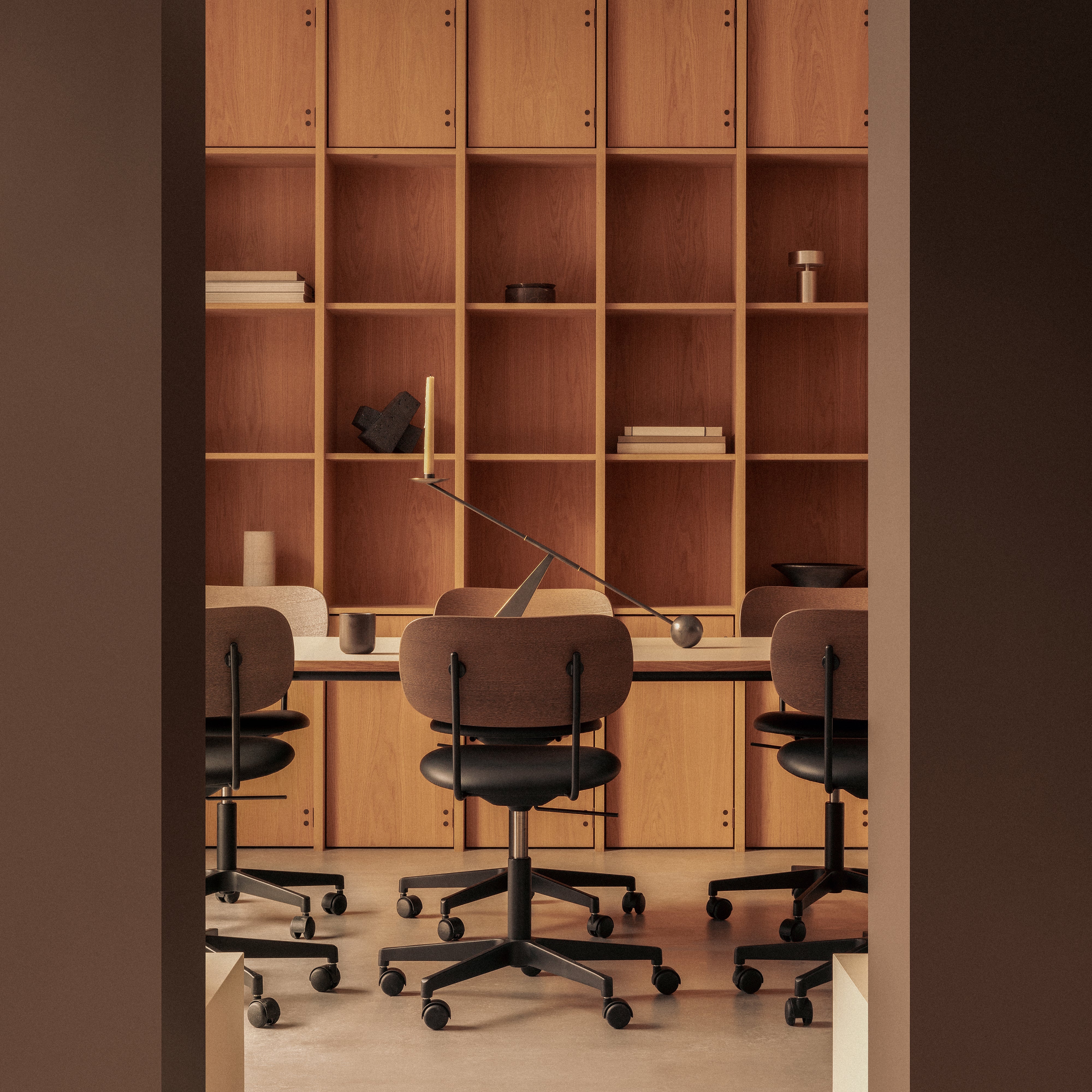 Set on a five-star swivel base with casters, this seat upholstered Co Task Chair variation allows for easy movement in different work environments. The chair includes a height-adjustable mechanism and a flex tilt function, enabling users to adjust their seating position for optimal support during long periods. The Co Task Chair is available with or without armrests and in a variety of upholstery options to suit different interior styles.