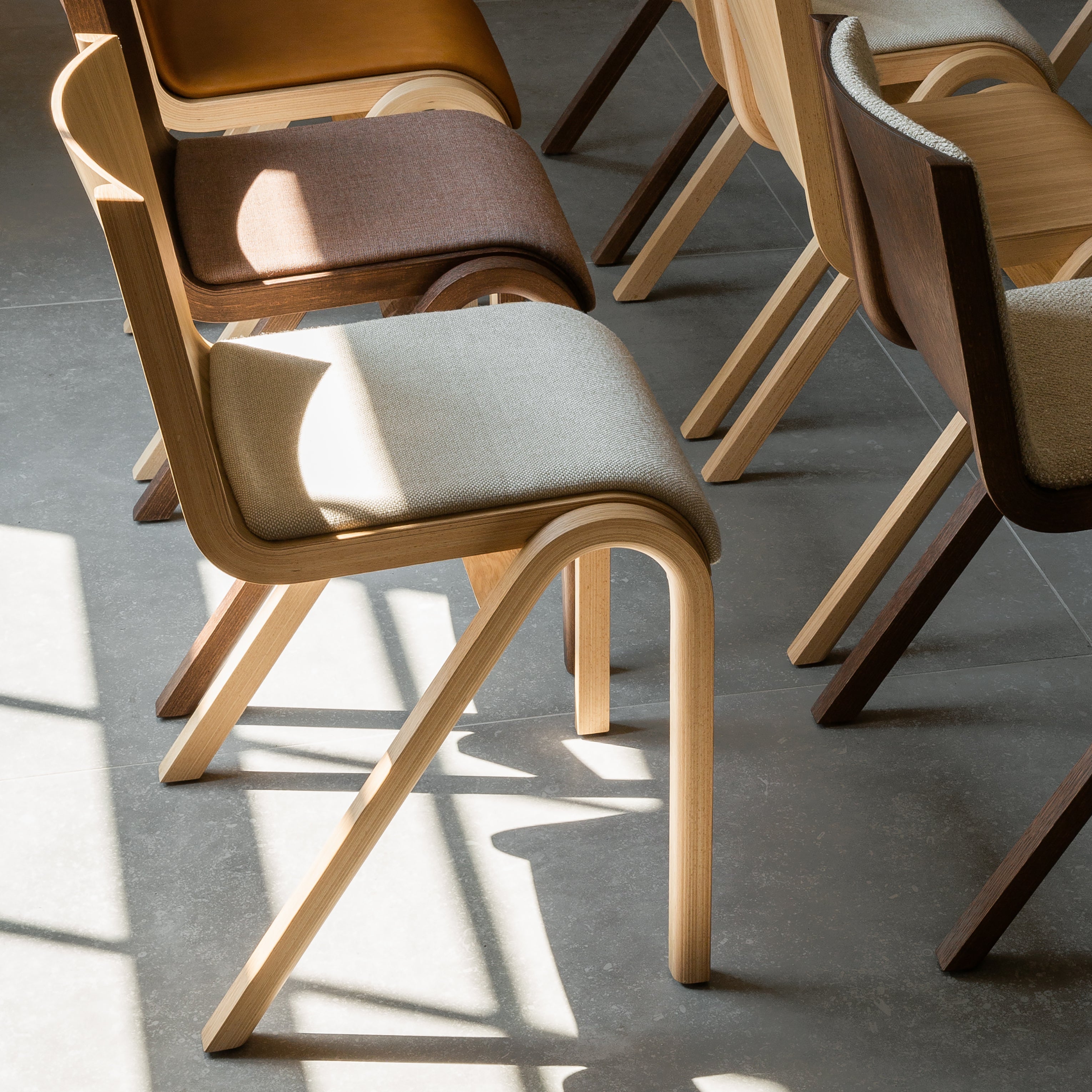 An upholstered seat stylishly tempers the sweeping wood curve of Audo's handsomely cantilevered Ready. Exploring the limits of form-pressing technique, Copenhagen designers Matias Møllenbach and Nick Rasmussen came together to conceive the seating in FSC-certified oak veneer. First intended for dining, it's also stackable up to 10 chairs high, making it a versatile contract player.