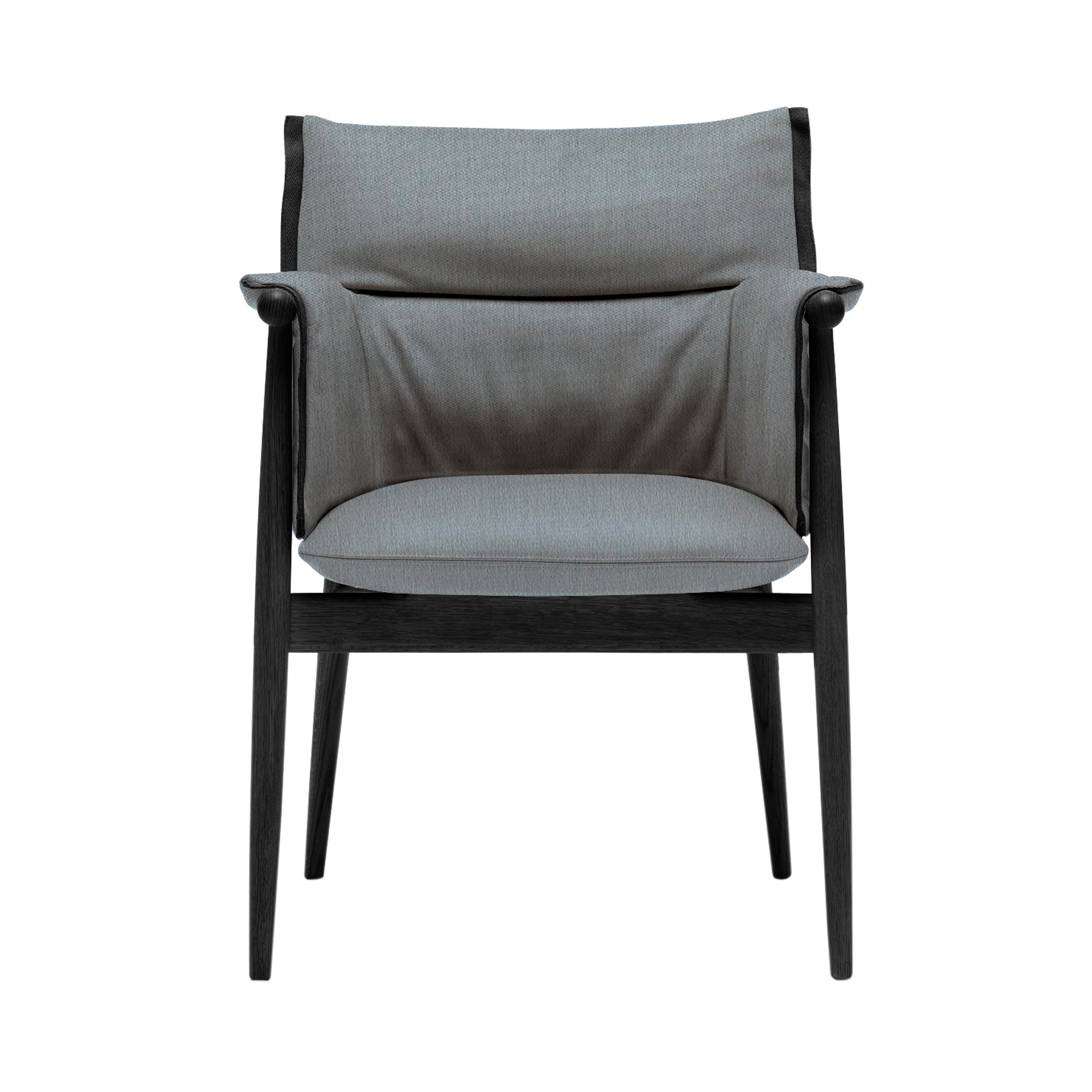 Vienna design studio EOOS puts a softer slant on its Embrace Armchair series in this version with a black edging strip. Like its siblings, the border delineates the enfolding cushion that functions as the dining chair seat, back and armrests in one as E005's upholstered form appears to float inside the solid oak or walnut structure. In a display of exceptional craftsmanship, the back piece particularly deserves notice—its 3 finger-jointed pieces assembled in classic geometric symmetry.