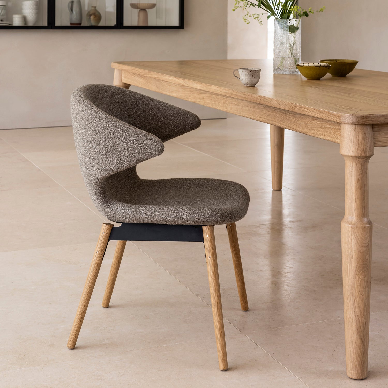 British designer Matthew Hilton brings enveloping comfort with Ella, his distinctively winged dining chair contrived for lingering at the table for hours. With an upholstered back and seat stretched over a steel-tube frame and an injection-molded foam seat, it offers base options in tubular steel and oak or walnut with black composite.