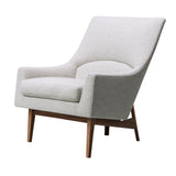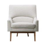 With a sculptural profile and angled rear legs forming a subtle A-shape, this armchair features a fully upholstered shell and a separate seat cushion for added comfort. The frame is supported by solid wood legs. Its compact yet supportive form, along with careful detailing, makes it a suitable choice for both private and shared spaces.