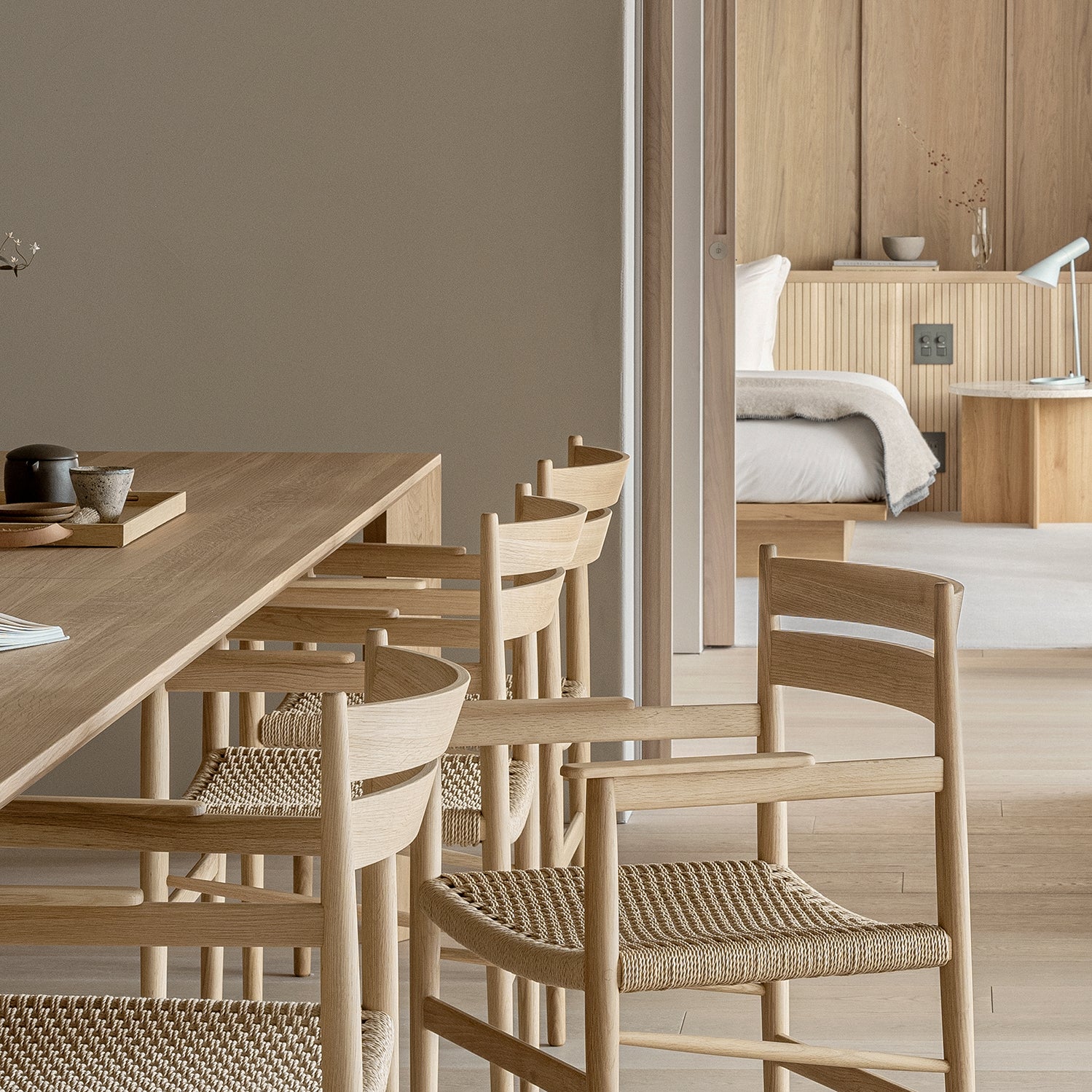 An expression refined through the marriage of wood clarity and thoughtful structure, this chair frames space with straight oak lines, subtly defined by a single angled stretcher that adds presence and visual direction. Crafted from premium oak in 4 finishes like pure, smoked, grain matte black, or keyaki brown, the chair’s tactile richness is enhanced by optional seats in solid wood, woven paper cord, or upholstery.