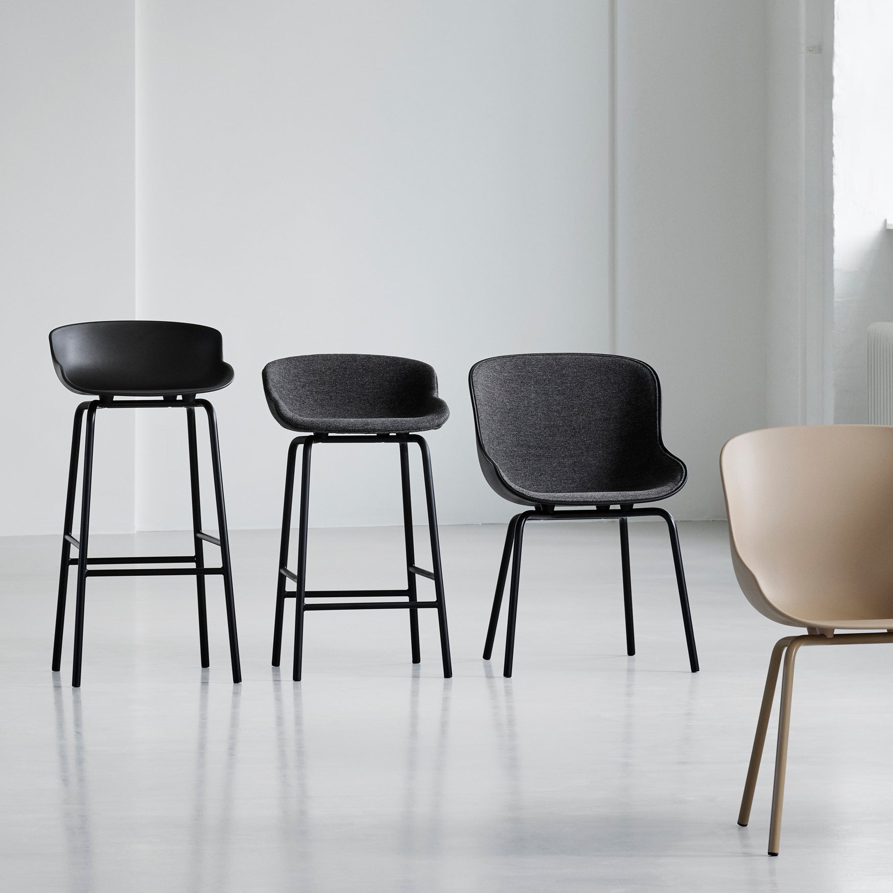 With Hyg, designer Simon Legald offers the option of front upholstery for customizing the chair's signature organic curves. Inspired by the contented Danish notion of hygge, the broad seat accommodates varied postures while the high sides glancingly shield off its surroundings. The encircling contours can be sheathed in a range of premium textiles or leather to provide an apt textural contrast to the polypropylene form and powder-coated steel legs.