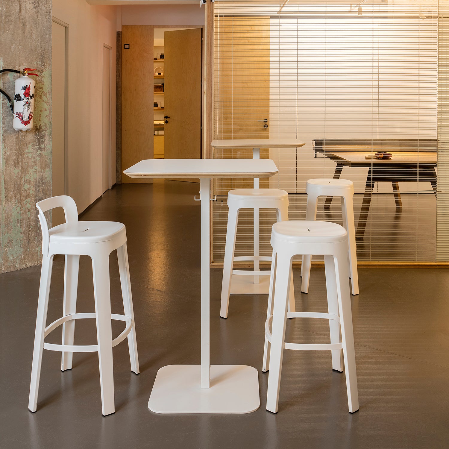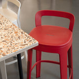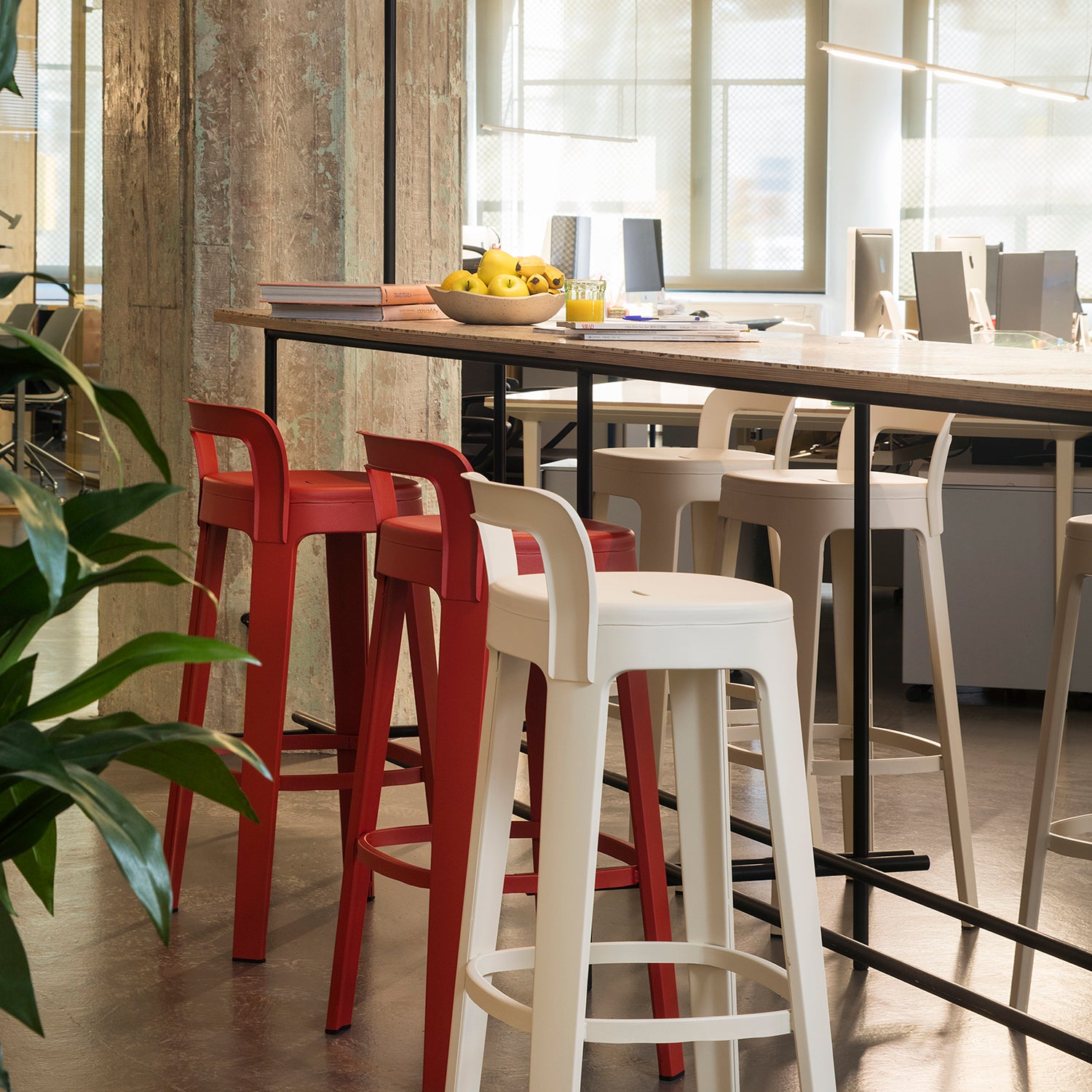 Adding a low backrest complements the "hang out" factor of RS Barcelona's sleek Ombra. In bar or counter version, the stool aptly reflects its name—which means "shadow"—with a sleek design that makes it pleasingly ubiquitous. Crafted in lightweight but sturdy steel, it's finished with a tough polyester-paint electro-coating. Emiliana Studio built hours of comfort into the design DNA, by way of generous proportions and an ergomatically contoured seat.
