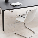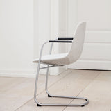 The Eyes Cantilever Armchair features a smoothly curved seat and a flexible cantilevered base that gently responds to movement. Its shell is made from moulded cold-cured foam with a reinforced steel interior, providing both comfort and structure. Fully upholstered, the chair sits on a metal frame.
