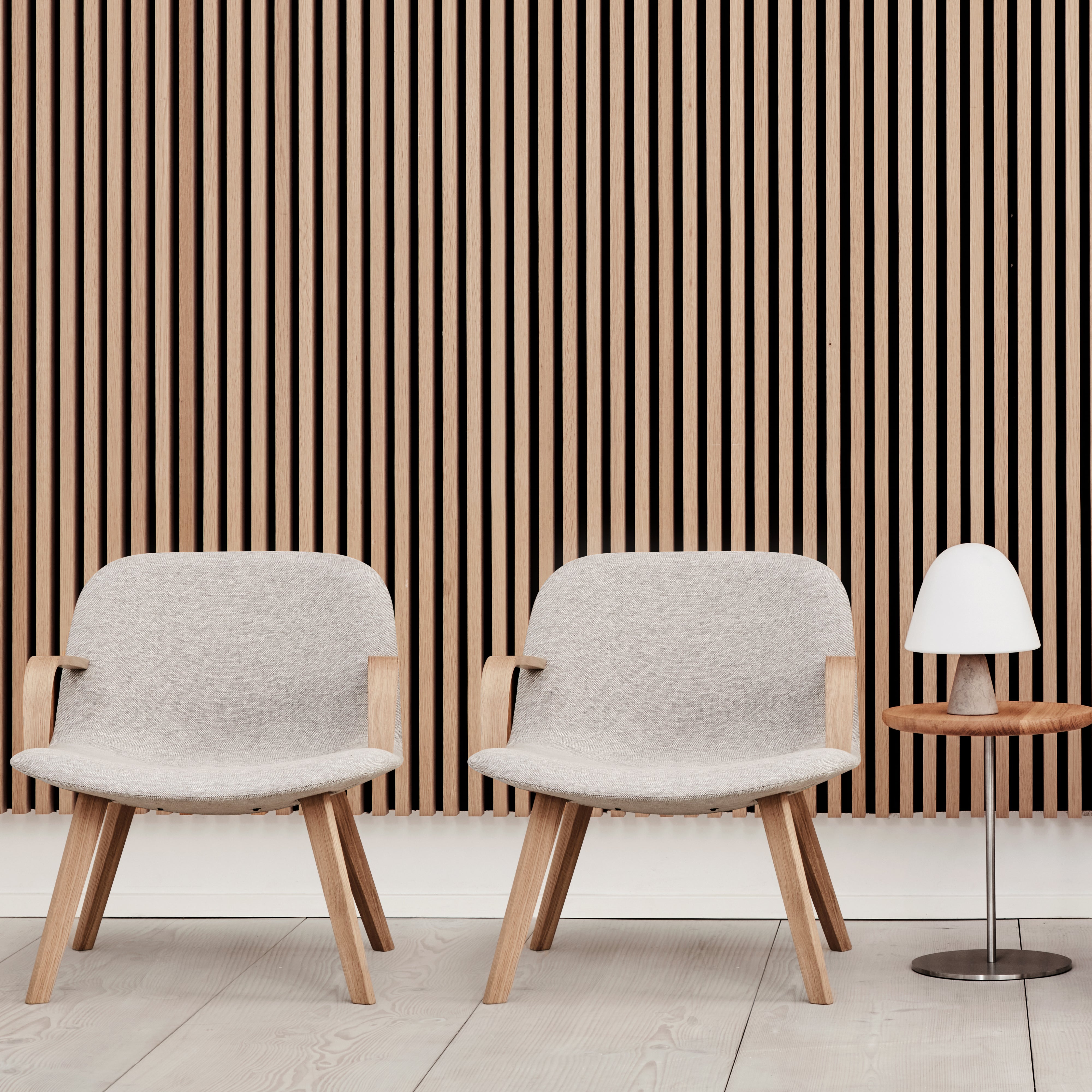 The Eyes Lounge Armchair features a curved seat and gently angled backrest that provide a comfortable and supportive sit. Its shell is made from cold-cured foam with a hidden steel frame, fully upholstered for a smooth, seamless look. The chair is supported by a solid wood base with armrests offered in different finishes to complement the overall design.