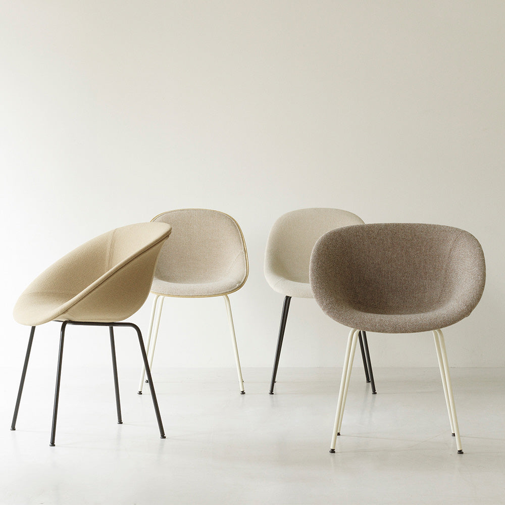With its inviting contours and eco-friendly design, Mat’s molded armchair gets a personalizing touch with fine fabric or leather front upholstery and a choice of leg colors. The attractively variegated shell updates a Nordic classic in a recyclable composite material made of hemp and seaweed, an innovation from Danish designers Foersom & Hiort-Lorenzen.