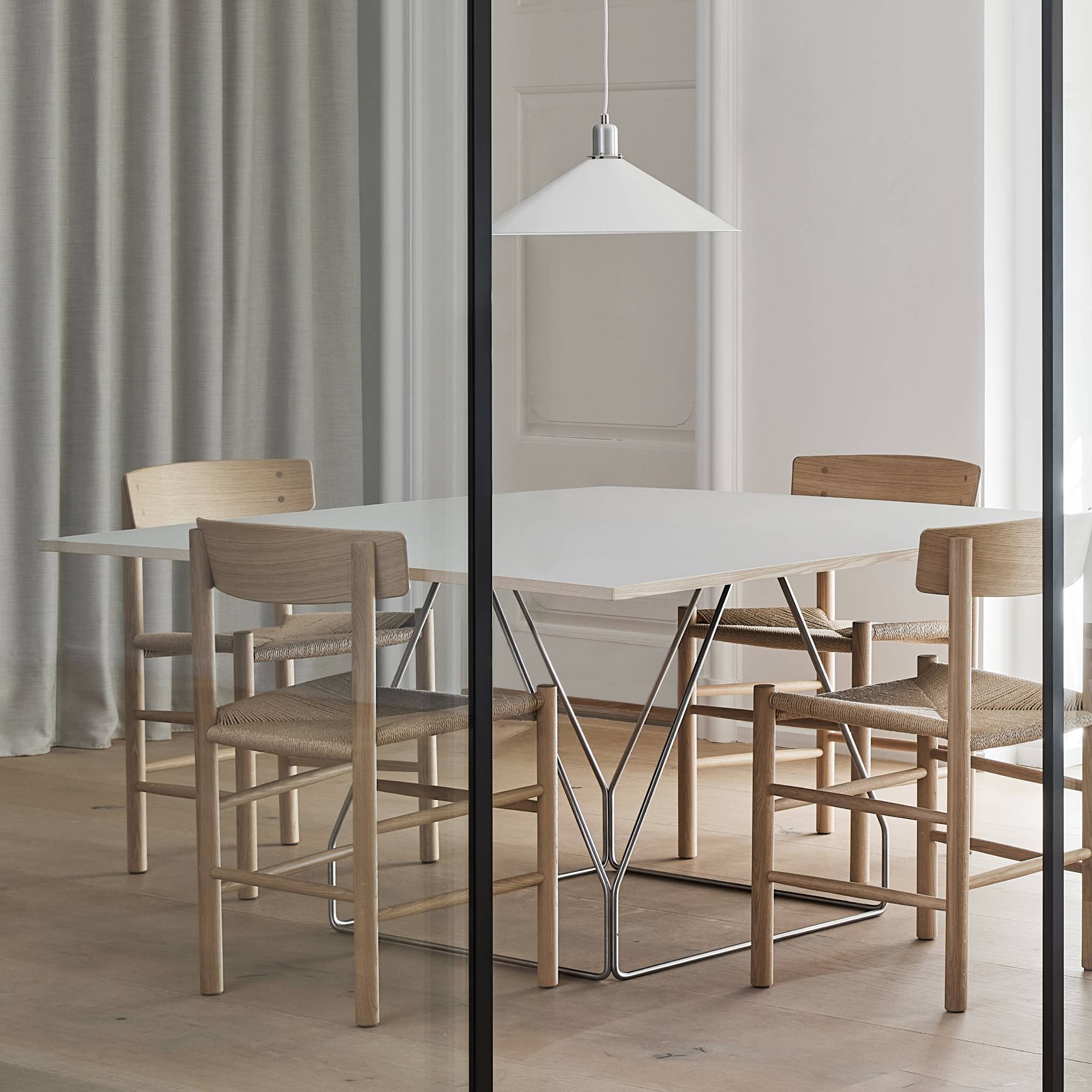 Jørgen Gammelgaard’s enduring 1984 design reflects his desire to create a simple, elegant piece with a supportive structure that would not limit the seating around the table. Providing remarkable stability as well as an intriguing graphic aesthetic, JG Table features a base in stainless steel or powder-coated finish with the choice of a round or square tabletop in varieties of solid stone or in a durable matte linoleum.