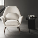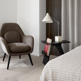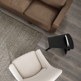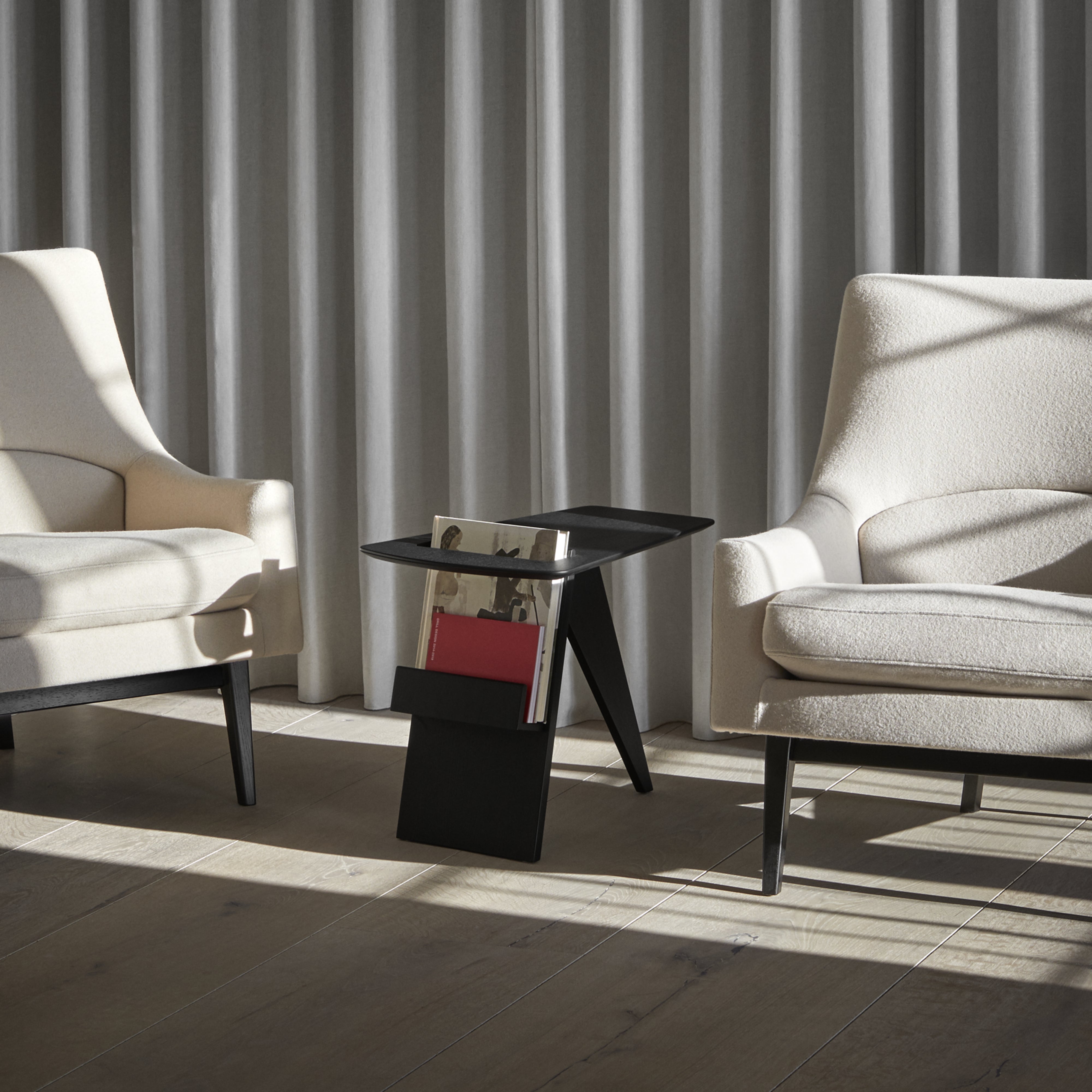 Designed in 1949, the sweeping diagonal lines with softened cut-outs and curves give Jens Risom’s functional magazine table a striking, sculptural silhouette. Apropos for any contemplative setting from hotels to private homes, the “furniture with a signature,” as the designer called it, also reflects his penchant for thoughtful practicality. Available in natural or black lacquered oak plywood, the angular piece intrigues even as it provides a perfect stash for any reading material.