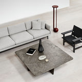 Sumptuously fashioned in Portuguese limestone with a beautiful natural surface and warm tones of variegated umbra grey, Space Copenhagen’s coffee table takes modernistic design to majestic proportions. Tableau’s square version, available in a choice of sizes, features a solid tabletop in the Dark Atlantico stone with a matching base of intersecting limestone plates, reinforced with metal on the underside. A striking statement piece, it’s to be professionally assembled onsite.