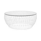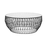 The cage-like base coupled with the glass top gives this coffee table a sense of lightness. The distinct geometric pattern is signature Gaurav Nanda, the creative founder behind the Los Angeles-based Bend Design. This over-sized table is realized by way of a process Gaurav dubs "bending." Applied to all of his completely handmade furniture, the iron is shaped, then spot-welded in hundreds of places. Then it's galvanized and given a powder-coated finish that withstands the elements. Consider it for outdoor or indoor use.