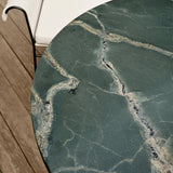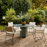 The Epic Outdoor Dining Table draws inspiration from Greek columns and Roman architecture. Crafted in Italy from travertine stone, the table highlights the material's natural beauty and unique patina. Its monolithic design features a circular tabletop paired with a hexagonal base, creating a bold focal point for outdoor spaces. Each table displays distinct veining and striations, making every piece one-of-a-kind.