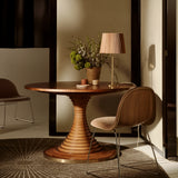 The Tavolo a Dischi is a round table distinguished by a pedestal formed from stacked birch plywood discs, each precisely cut and layered around a concealed metal core for strength. A walnut veneer top rests above, offering a warm contrast to the rhythmic base. At the bottom, a burnished steel band provides both durability and a refined finish. Available in 2 sizes.