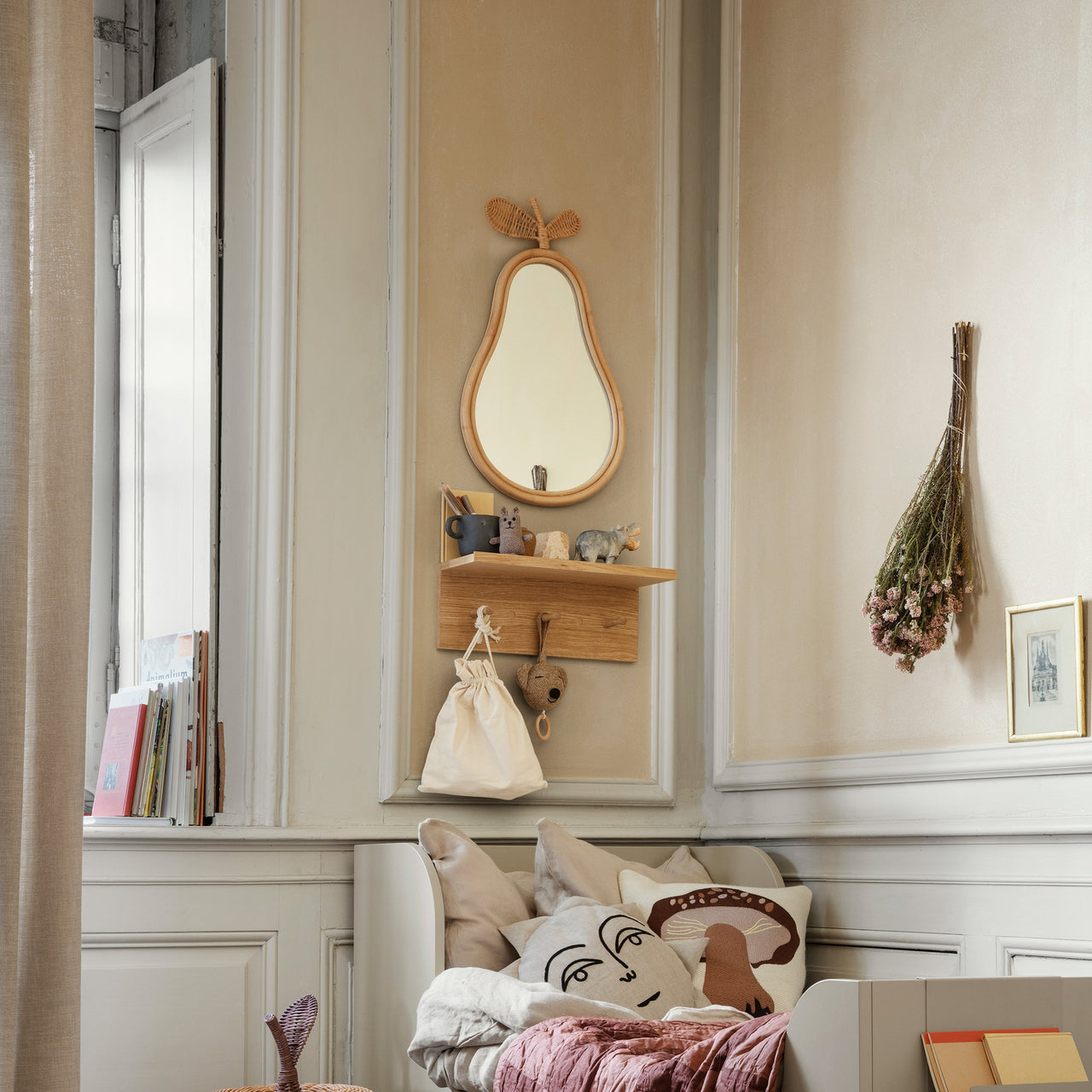 The Place Rack offers a versatile storage and display solution for various areas of your home. Crafted from oiled oak veneer with an MDF core, it features solid oak hooks and removable wooden caps for easy wall mounting. Available in 3 sizes, it adapts to spaces like the kitchen, hallway, or children's rooms.