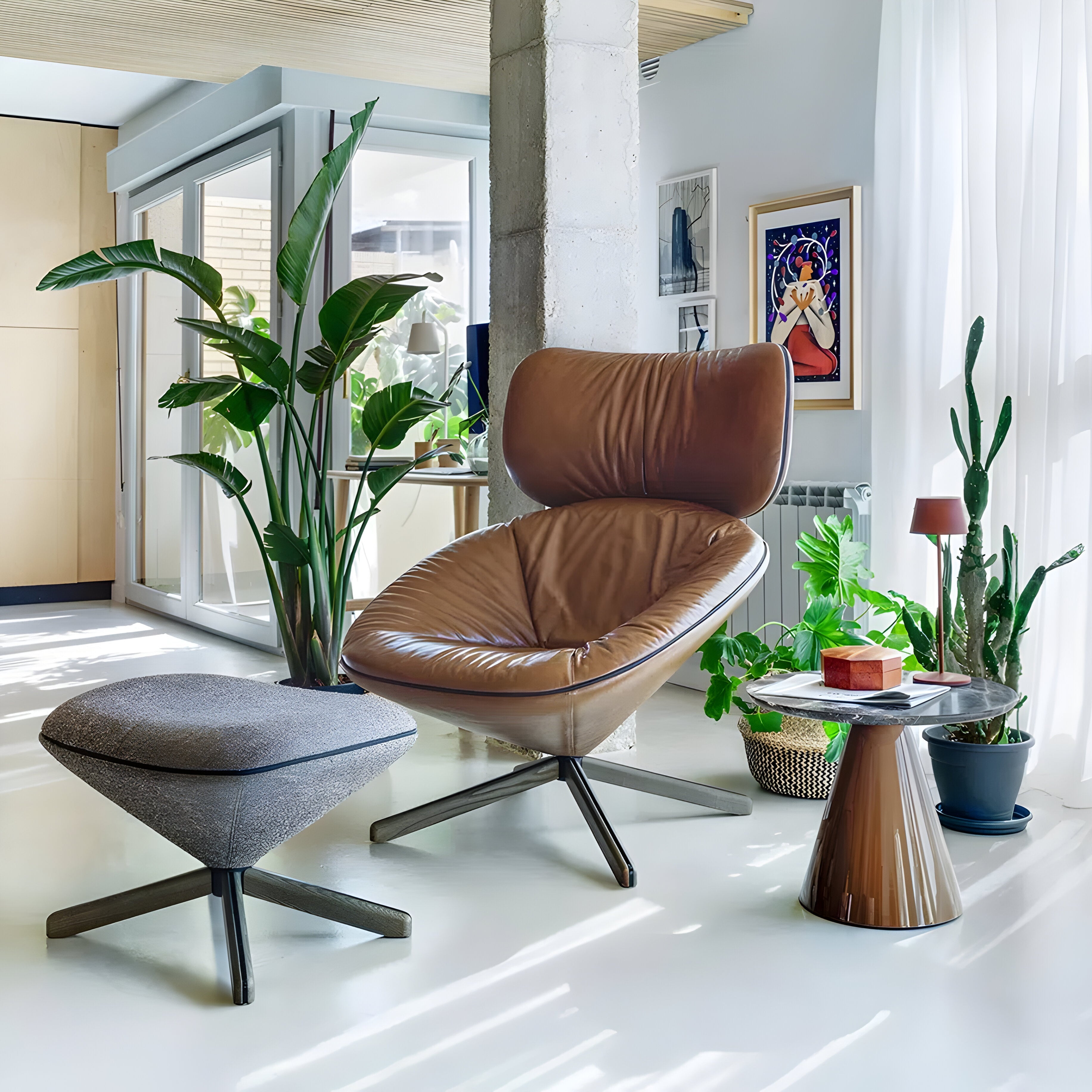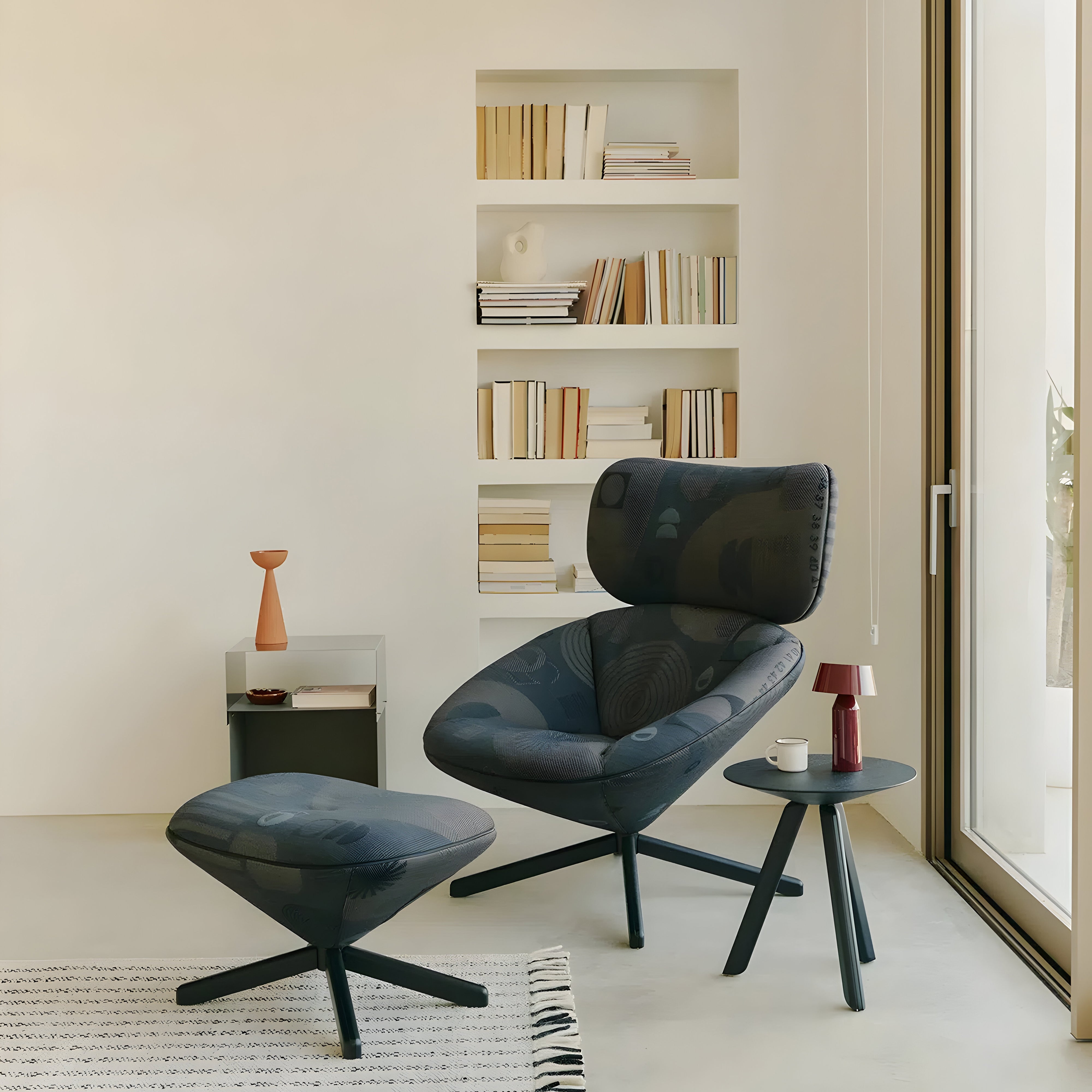 This pouf provides a comfortable seating option with its soft, upholstered cushion. It can be used as a footrest or extra seat in different spaces. Designed as part of a larger collection that includes lounge chairs and side tables, it blends cohesively. Available in 3 leg finishes.